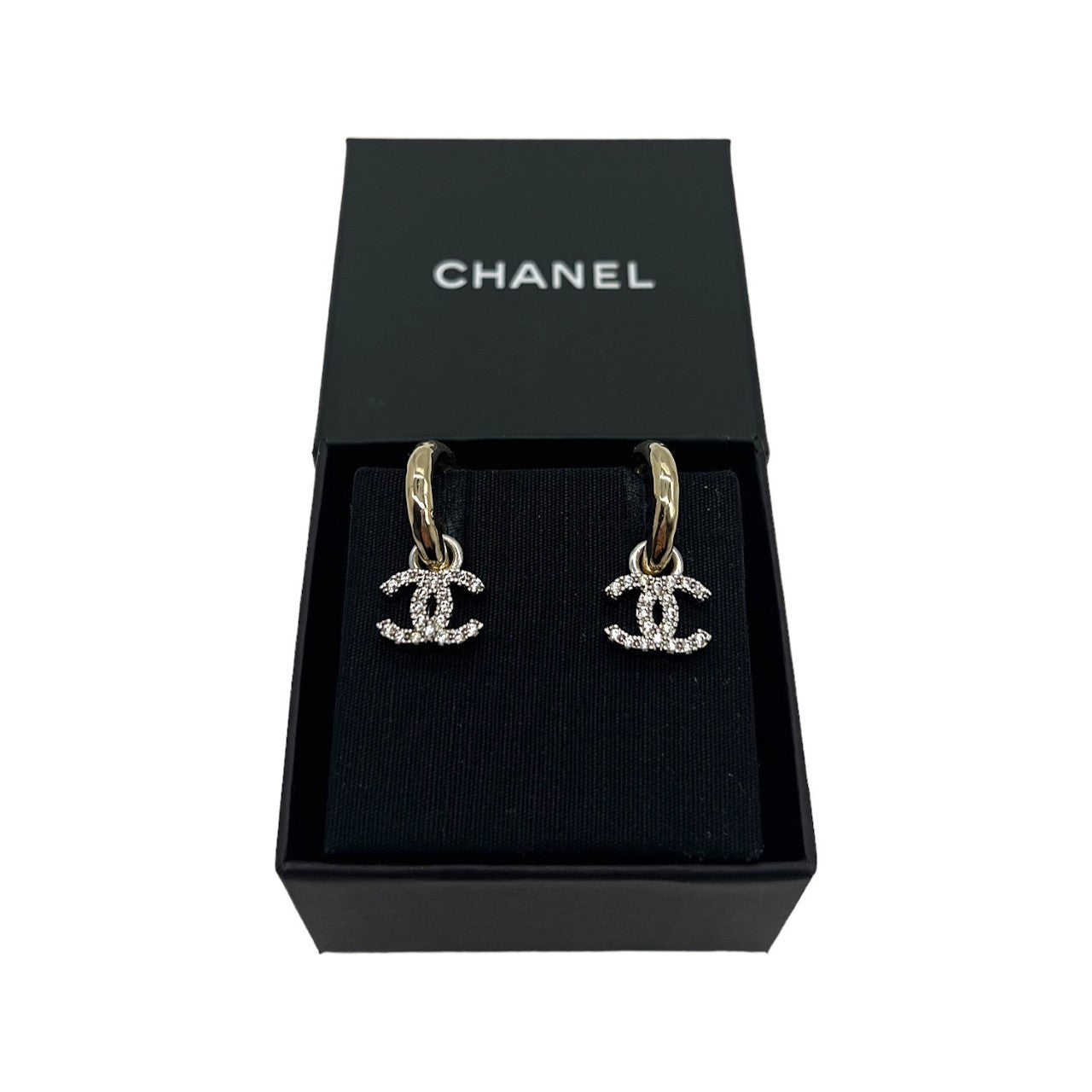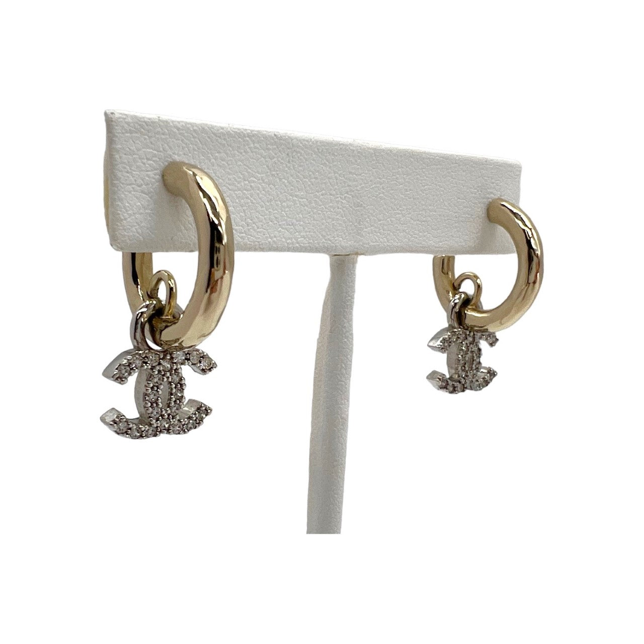Chanel  bags Interlocking CC Dangle Earrings. They are finely crafted in Italy in the fall of 2022 and are made of gold-tone hoops with a dangling silver-tone interlocking Chanel bags CC logo that shines with crystal studs mounted on the silver-tone hardware. Both earrings have aftermarket push back earring backs. These earrings perfectly represent the luxurious image of Chanel bags.
