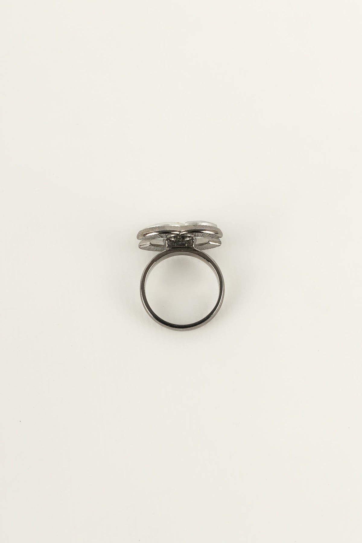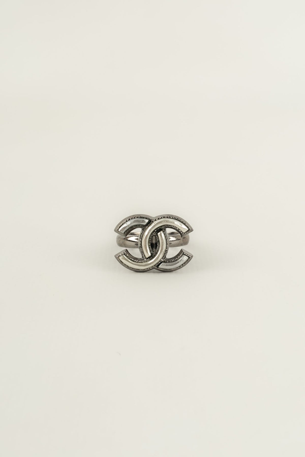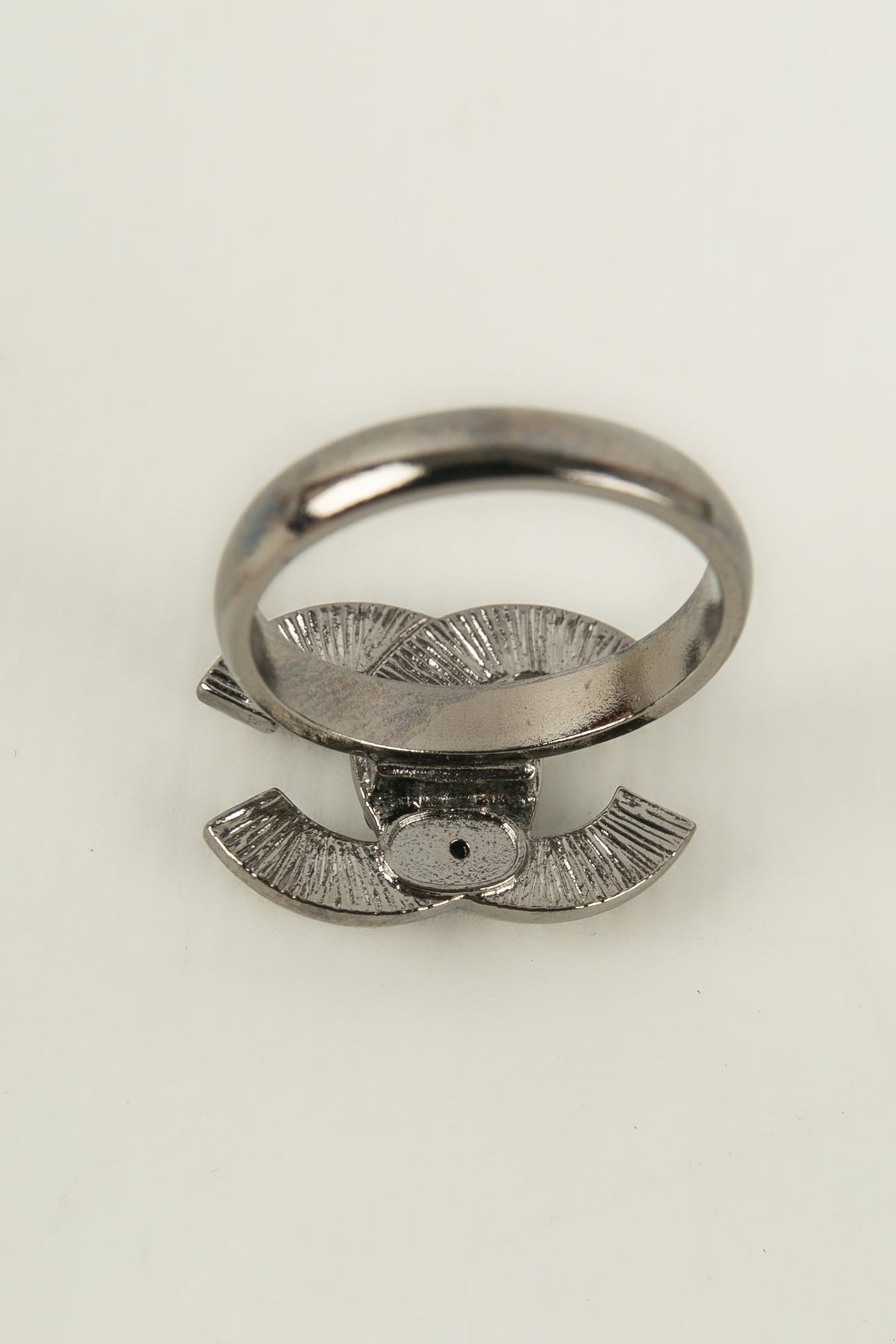 CHANEL -Bague en métal argenté surmontée d'un logo cc. Bijou non signé issu des ventes privées.