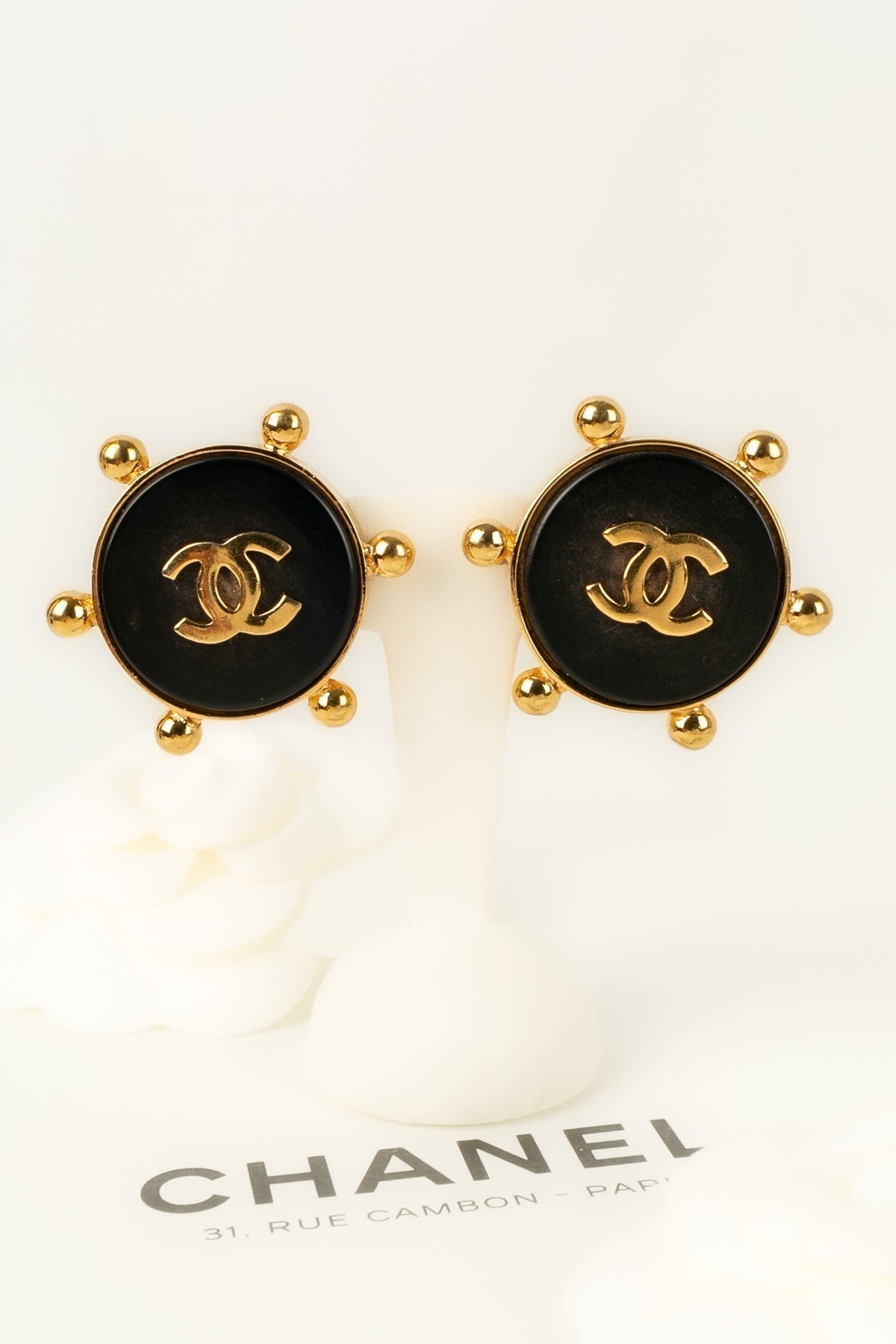 CHANEL - Boucles d'oreilles en métal doré et bakélite noire.