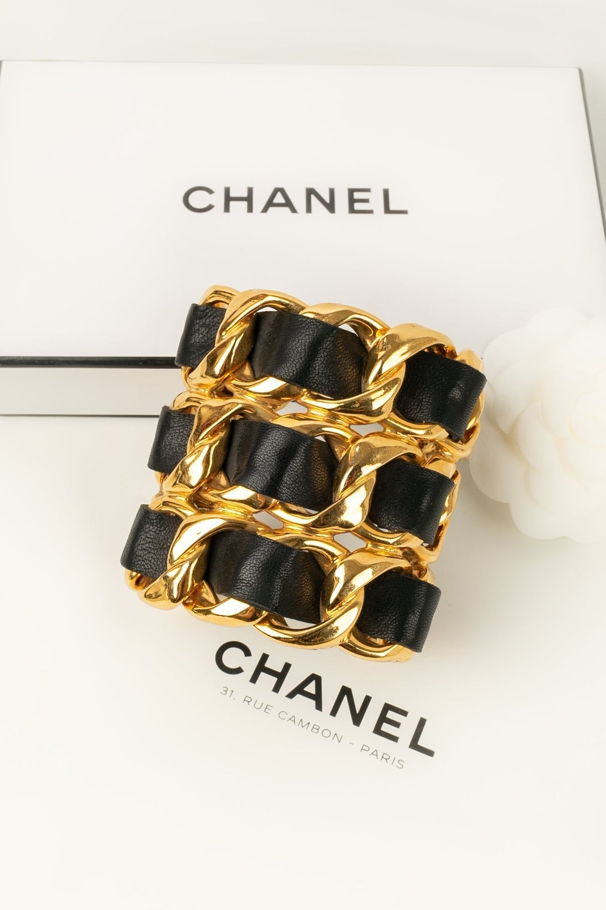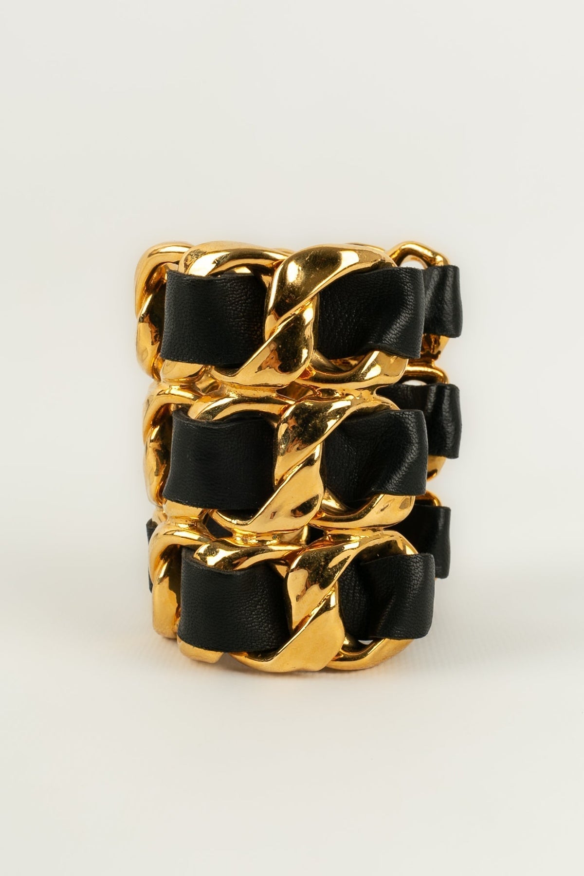CHANEL - (Made in France) Bracelet manchette en métal doré et cuir noir. Collection 2cc3.