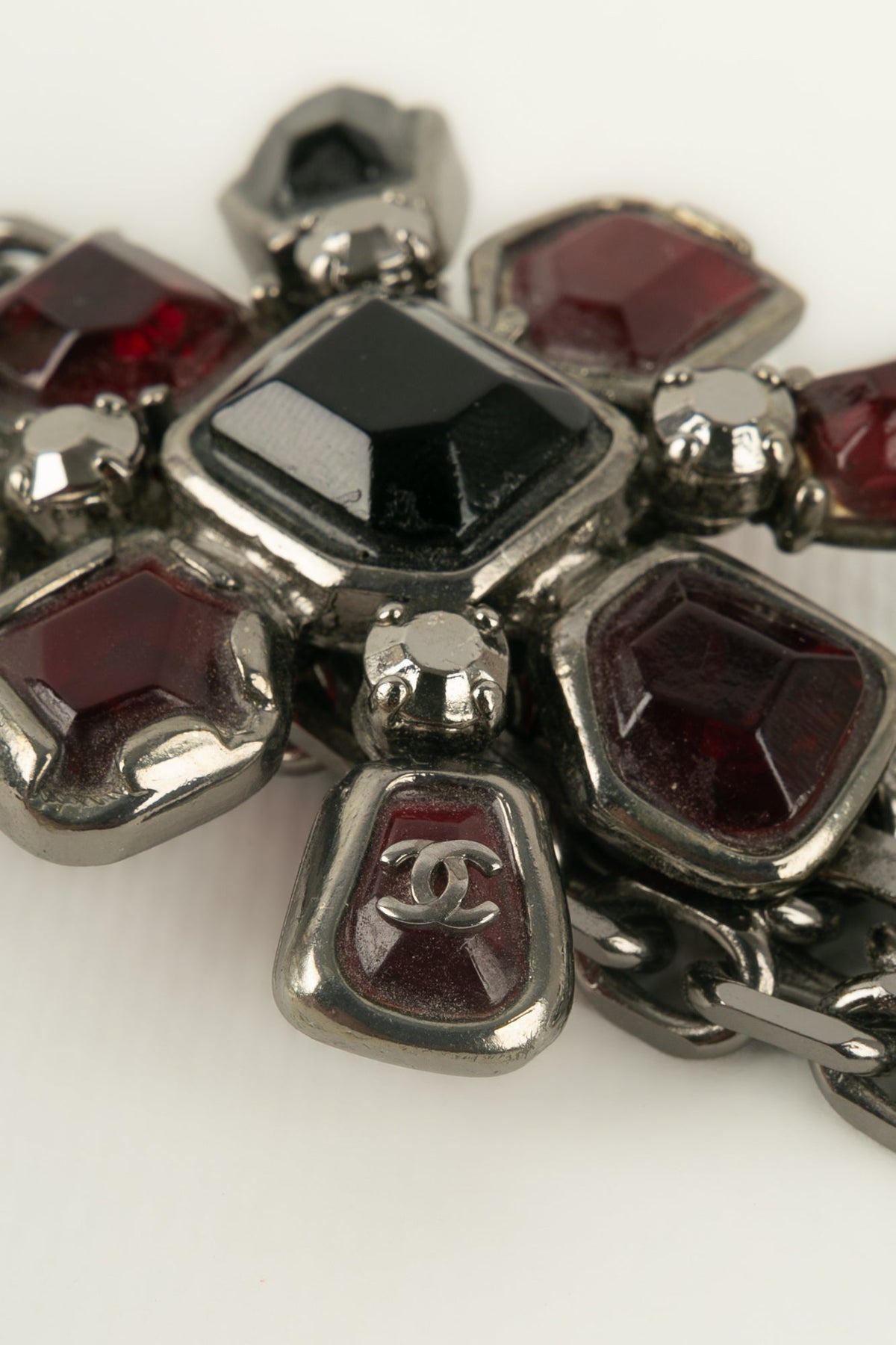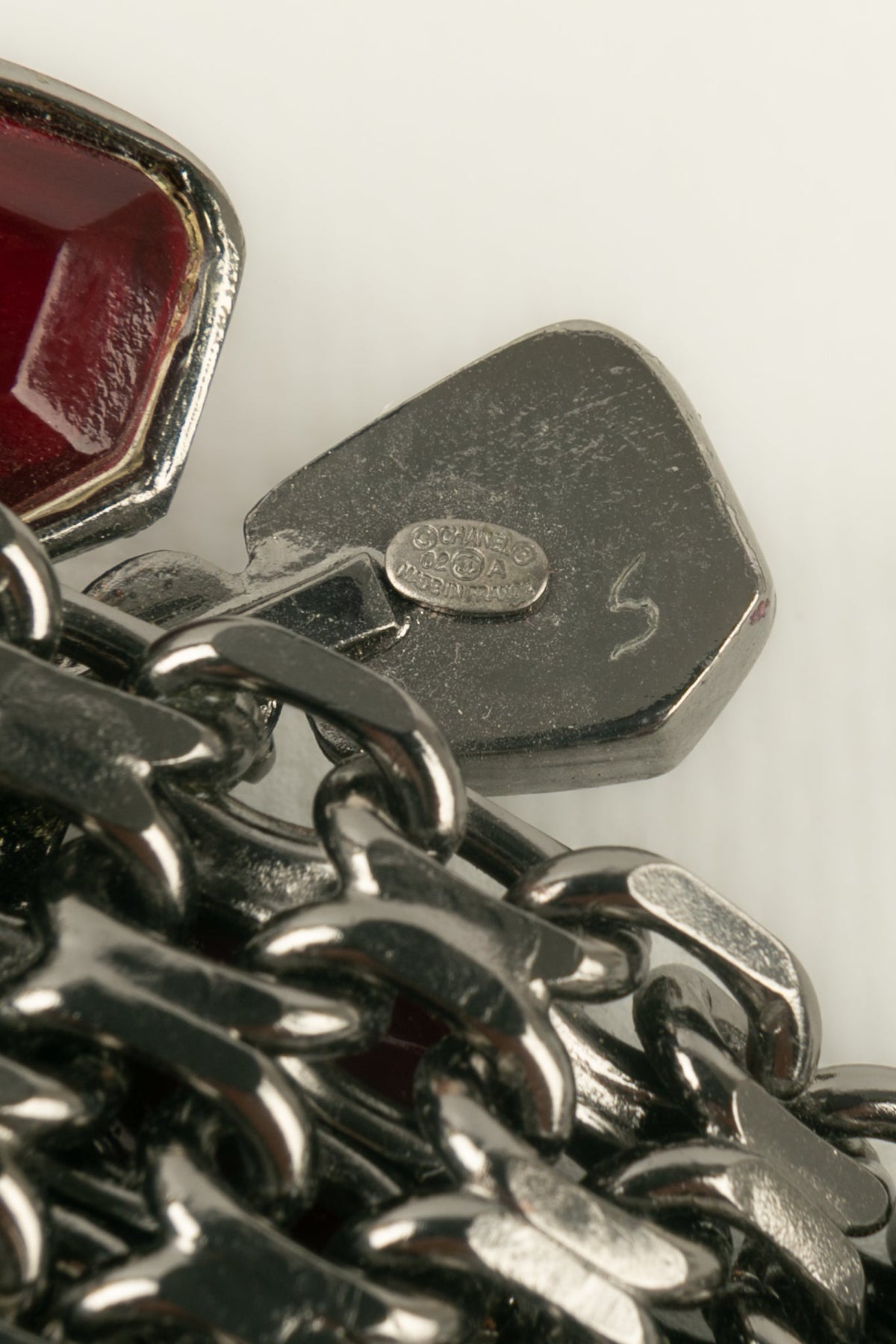 CHANEL - (Made in France) Bracelet en métal argenté foncé et strass bordeaux. Collection Automne/Hiver 2002. Bijou gravé du S de solde.