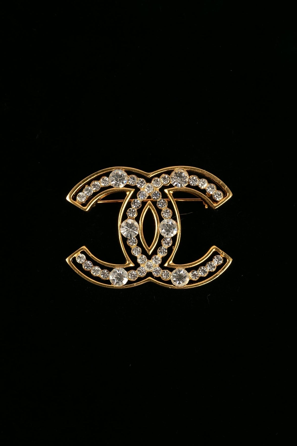 CHANEL -(Made in France) Broche cc en métal doré pavée de strass de Swarovski. Collection Automne-Hiver 2002.