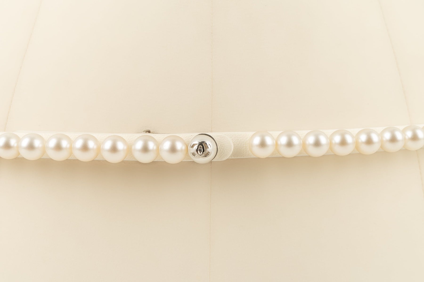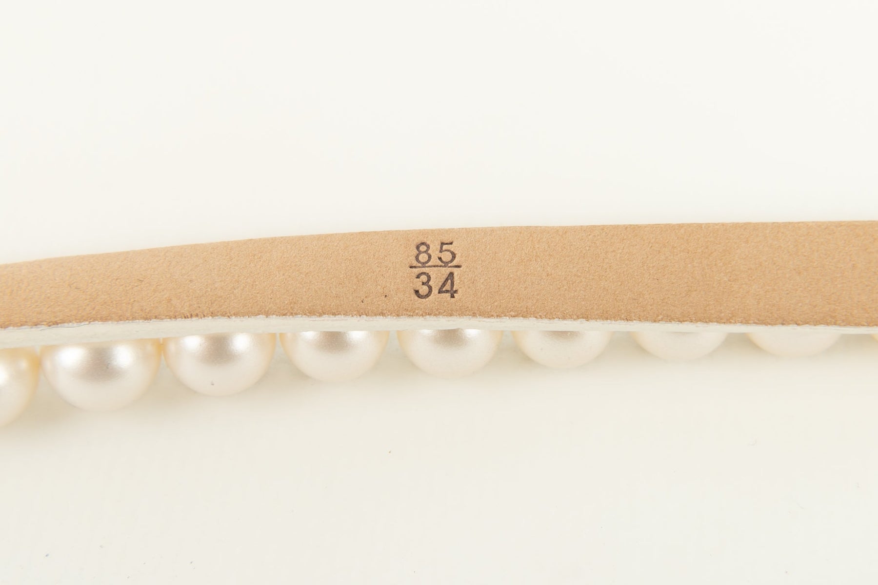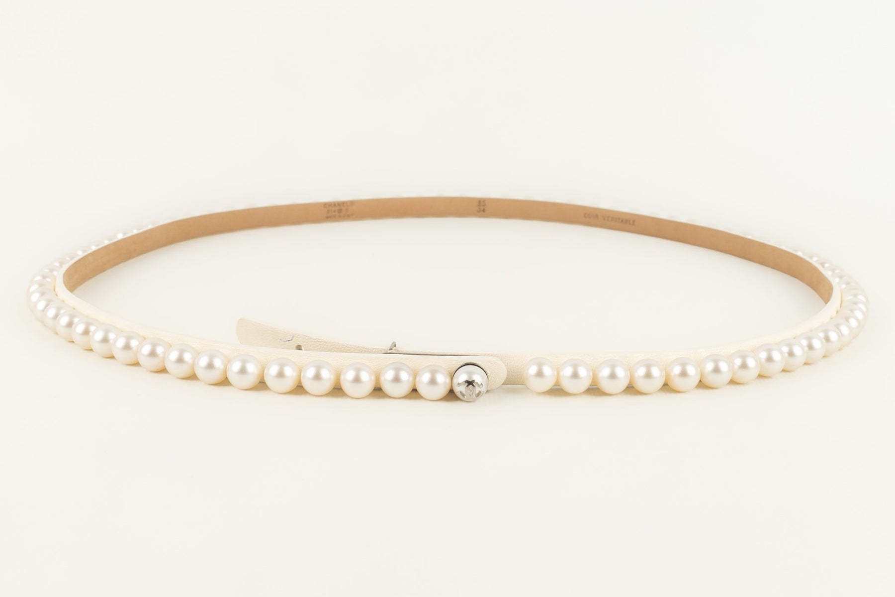 CHANEL - (Made in Italy) Ceinture en cuir et perles nacrées fantaisies. CollectioN 2014. Taille indiquée 85/34.