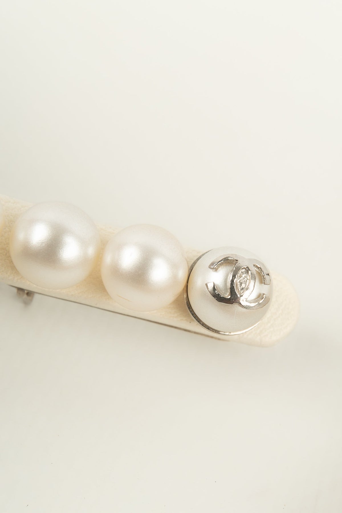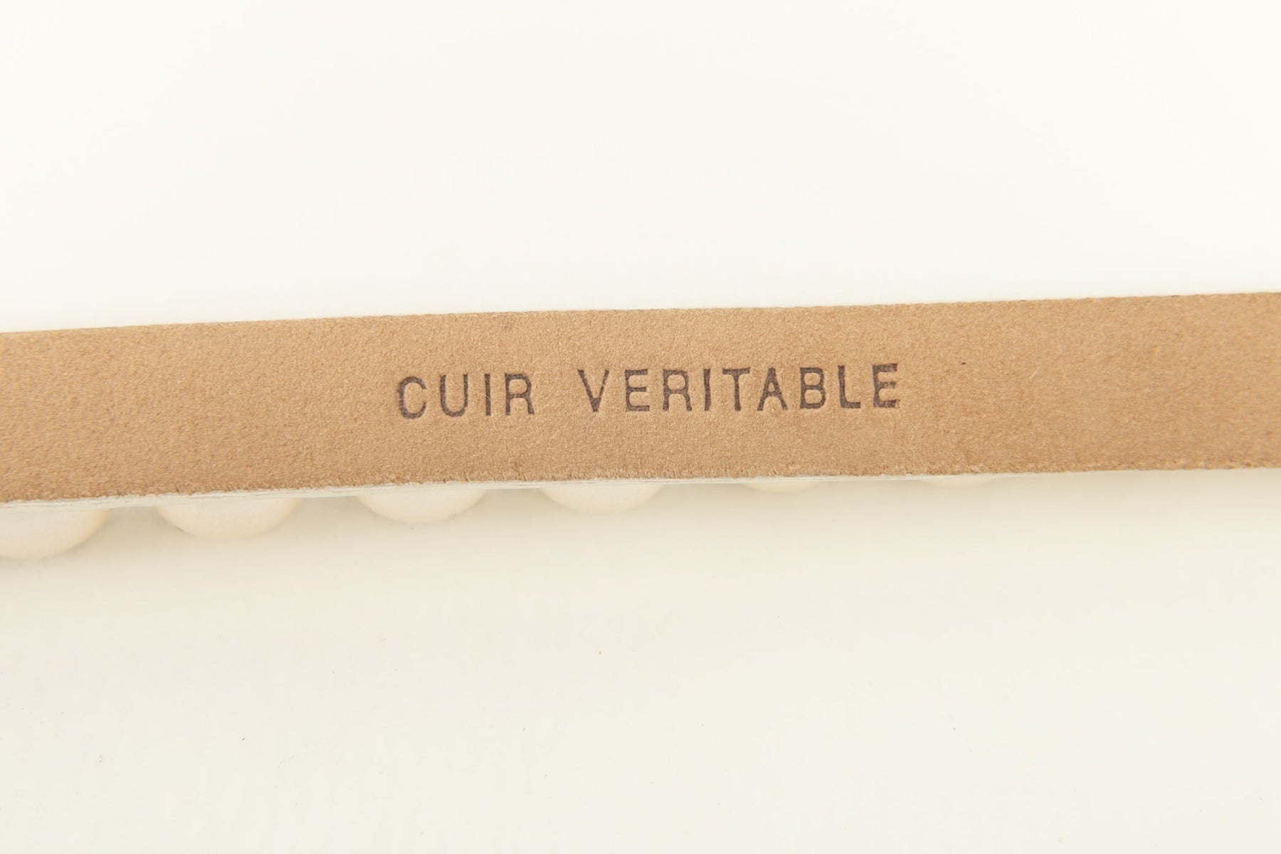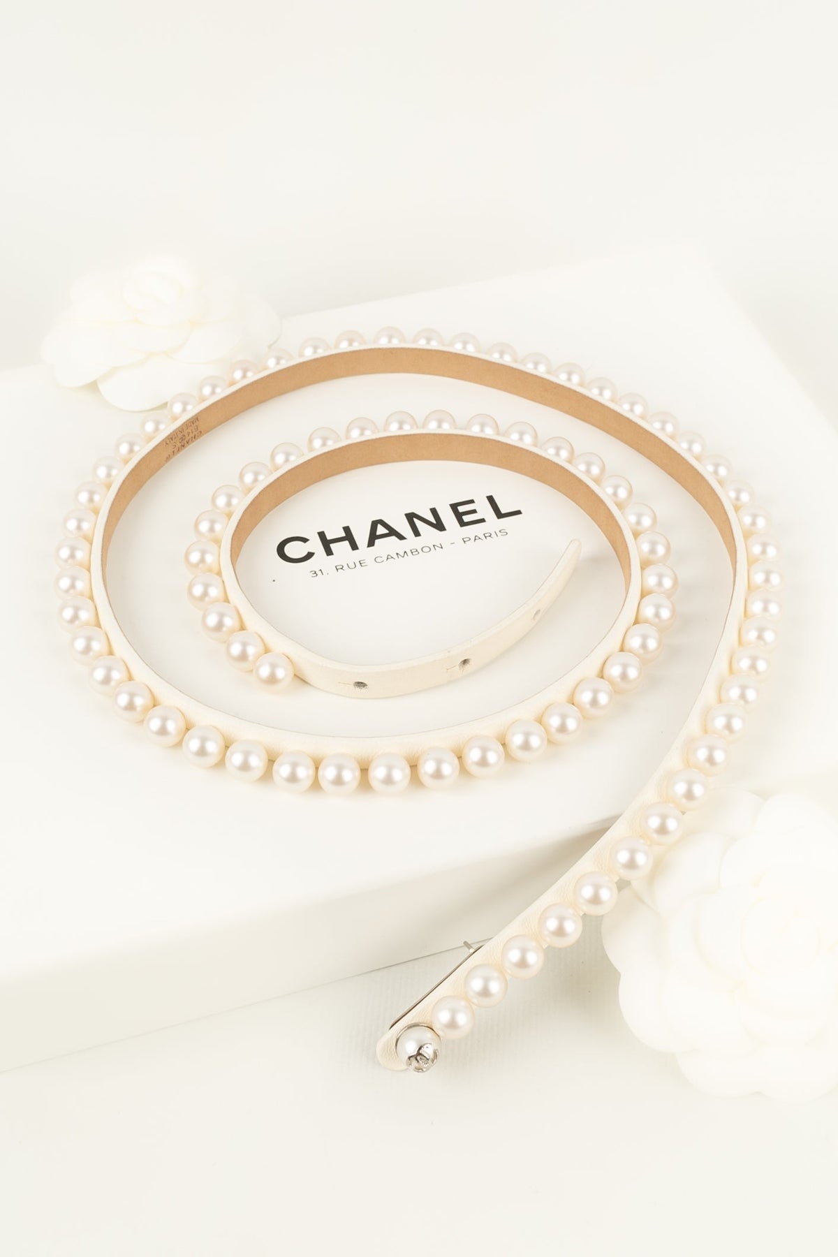 CHANEL - (Made in Italy) Ceinture en cuir et perles nacrées fantaisies. CollectioN 2014. Taille indiquée 85/34.