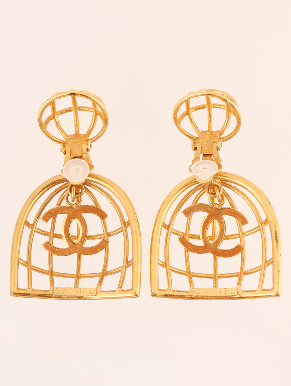Chanel 1993 Made Bird Cage Cc Mark Swing Earrings Gold