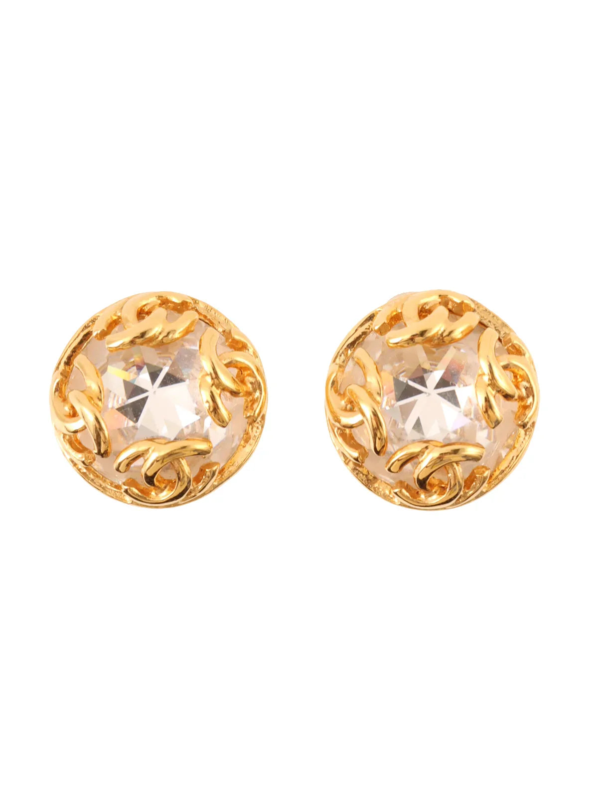 CHANEL 1995 Made Rhinestone Round 4 Cc Mark Earrings Gold