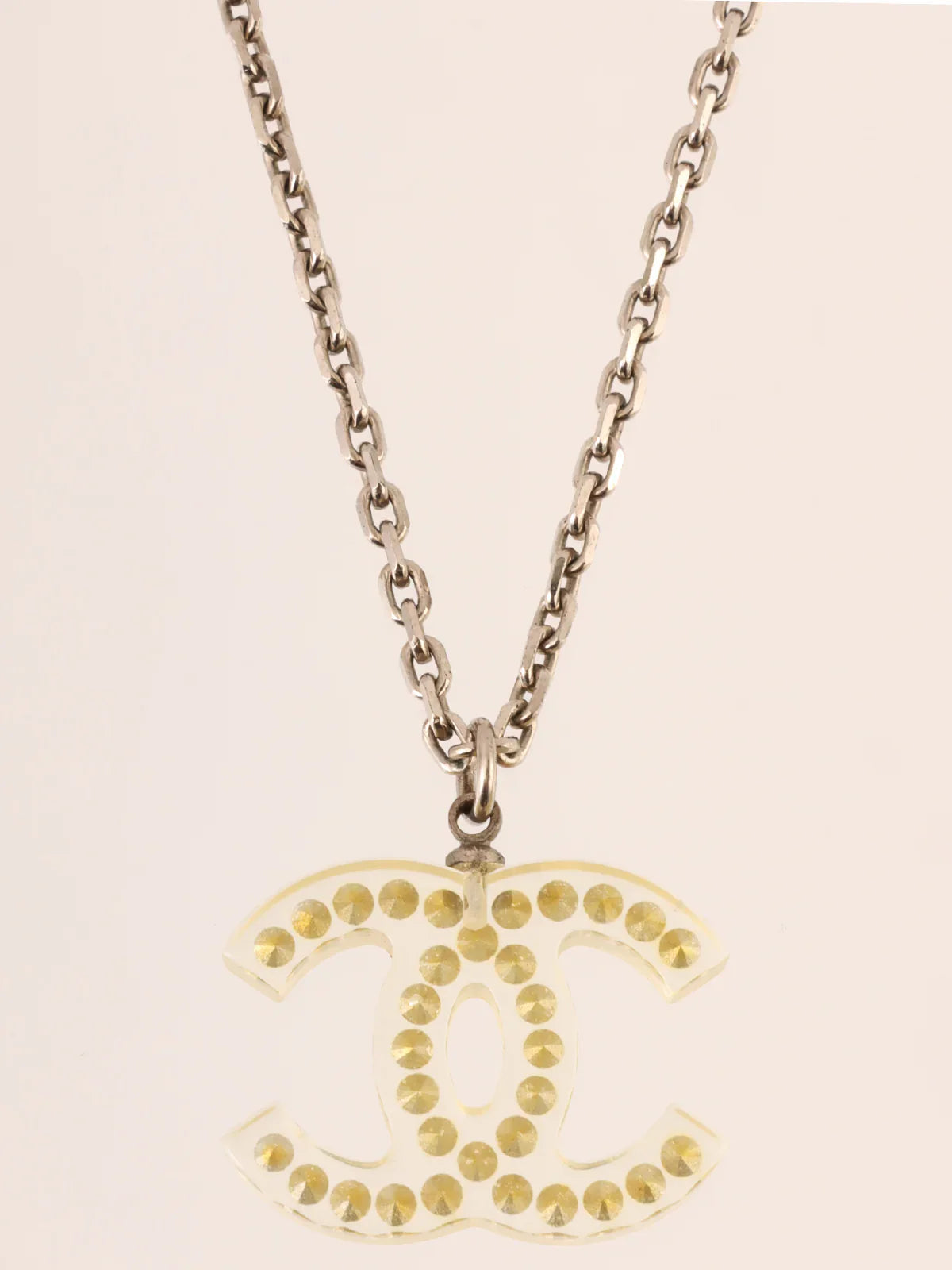 CHANEL 2005 Made Rhinestone Cc Mark Plate Necklace Silver/Clear