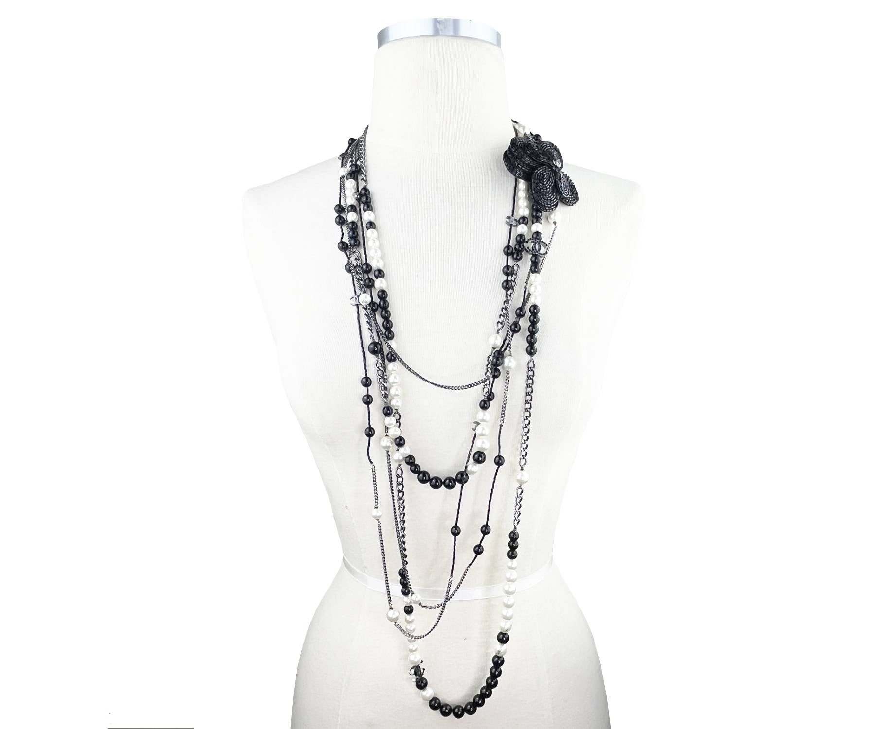 Chanel Black CC Beaded Flower Pin Black Bead Pearl 5 Strand Necklace.