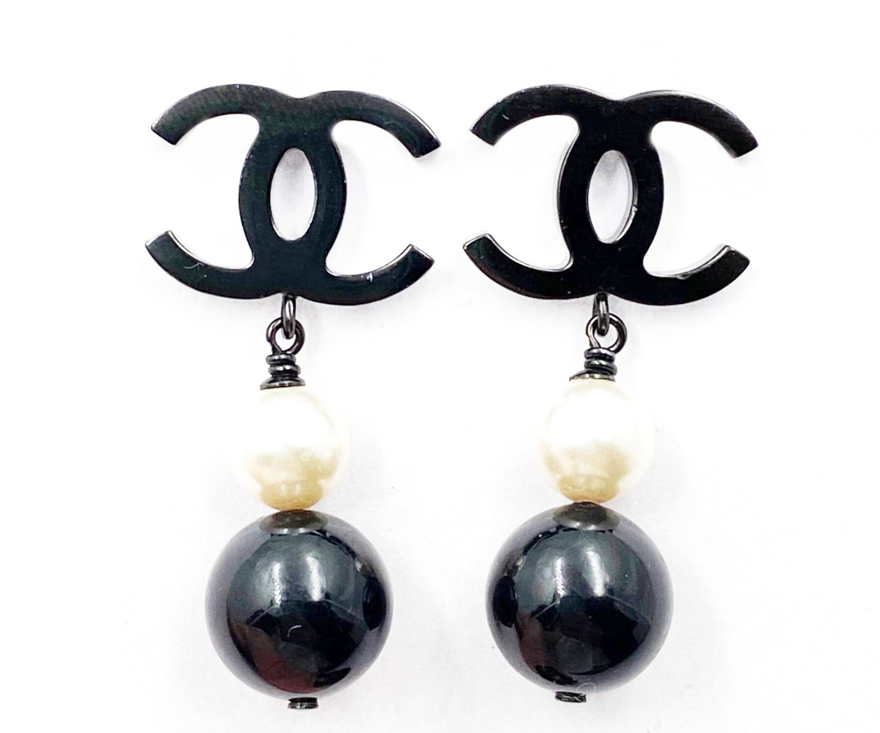 Chanel Black CC Pearl Black Bead Dangle Piercing Earrings.