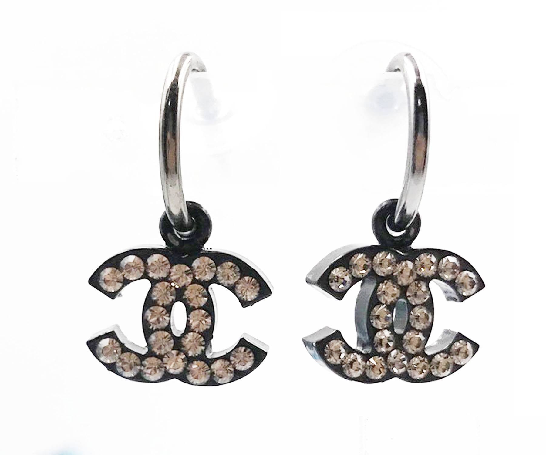 Chanel Black CC Shiny Silver Crystal Dangle Hoop Piercing Earrings.
