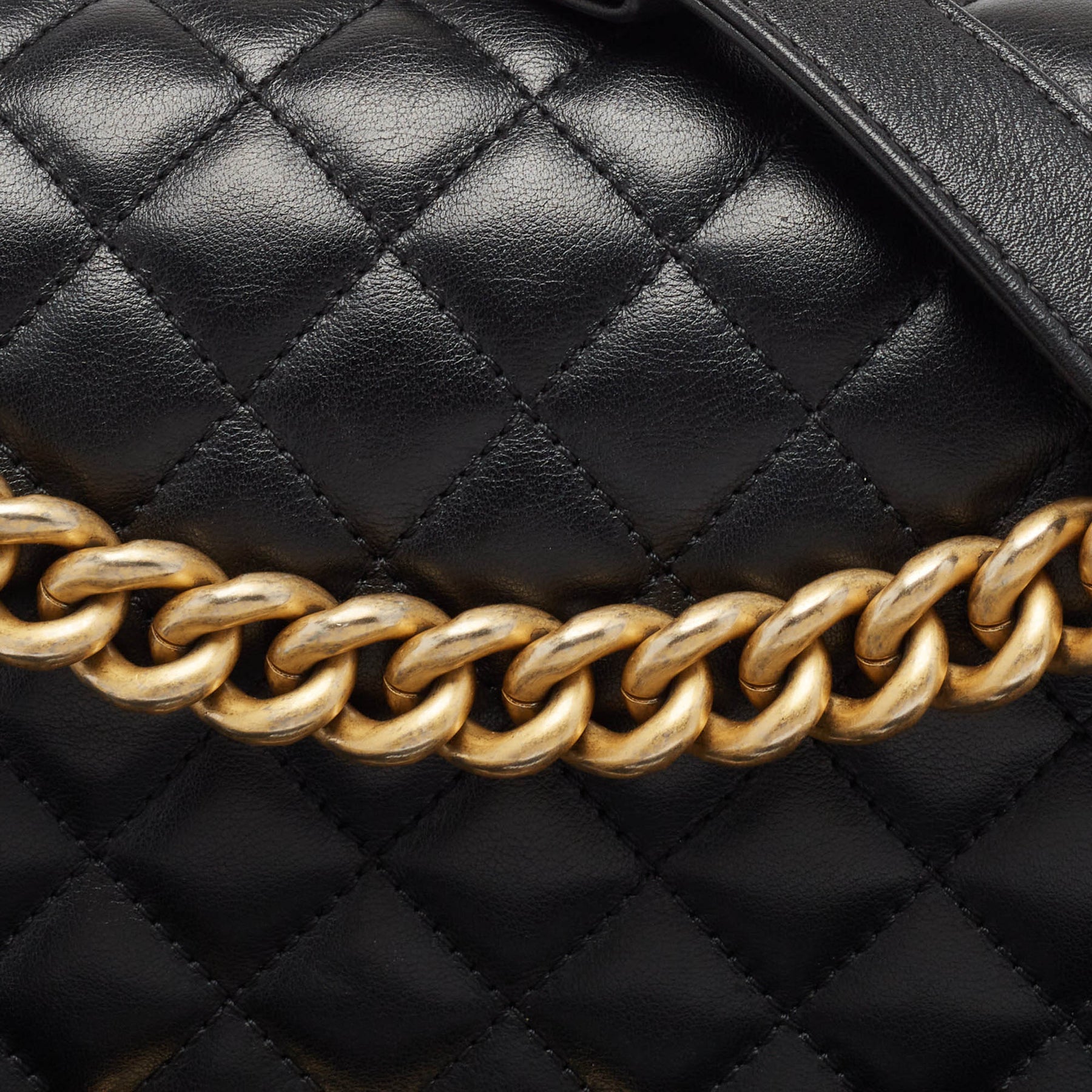 Introduced as a part of the Chanel Fall/Winter collection of 2011, the Boy New bag is alluring and complemented with exquisite details. This black creation is meticulously crafted from quilted leather and features side paneling, a chain leather shoulder strap, and gold tone hardware. Lined with nylon, the perfectly sized interior of the bag is secured by the signature CC lock closure.