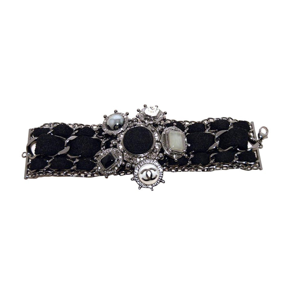 The focal point of this piece features a pearl charm with the signature CC logo, a large clear swarovski crystal stone, a smokey quartz stone, an onyx stone, a gunmetal setting and a black tweed wool focal point in the left of it all.