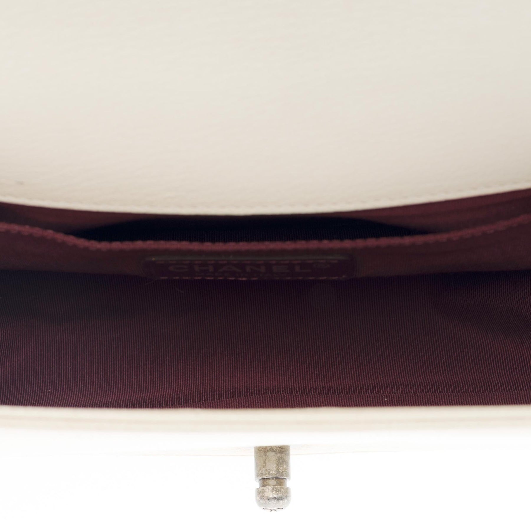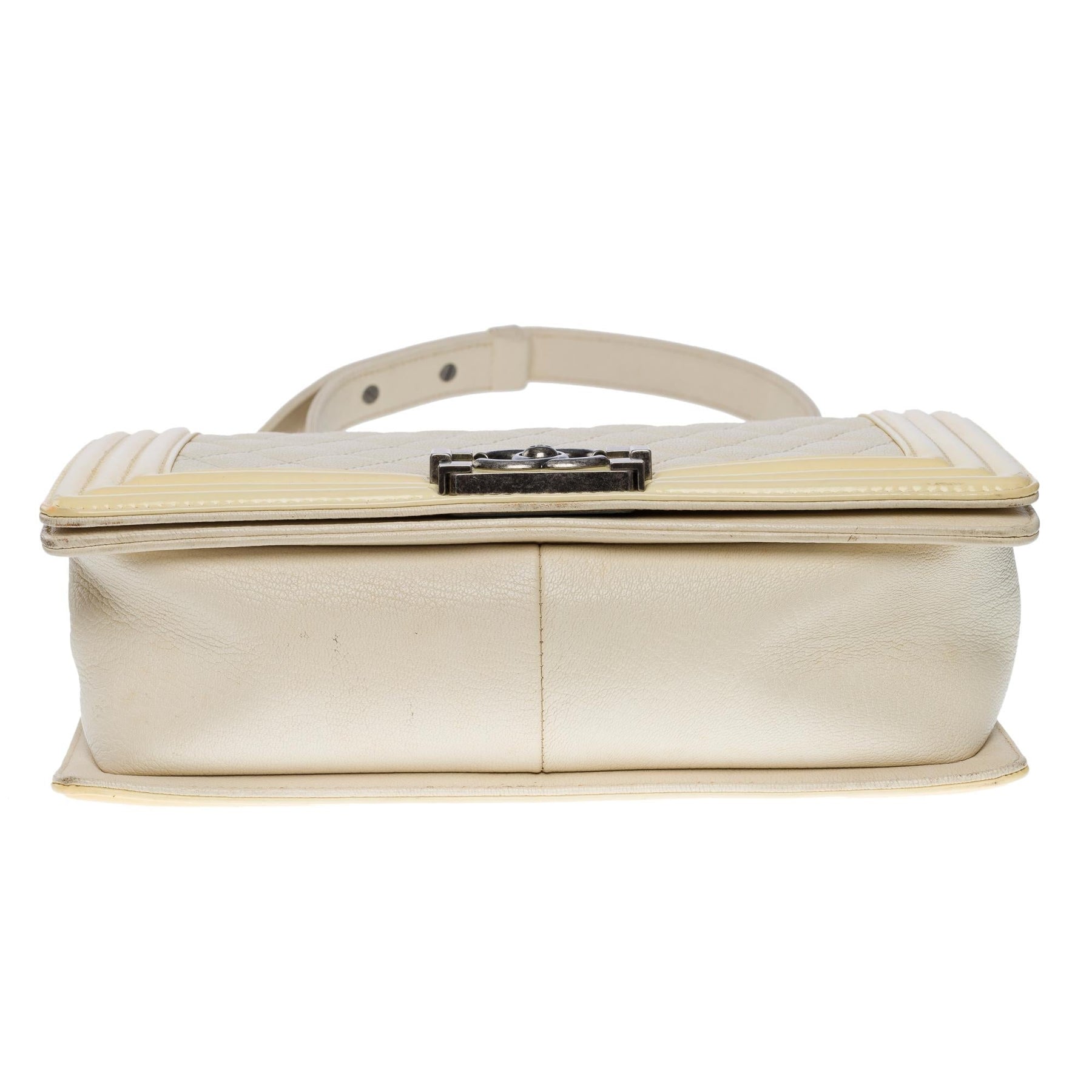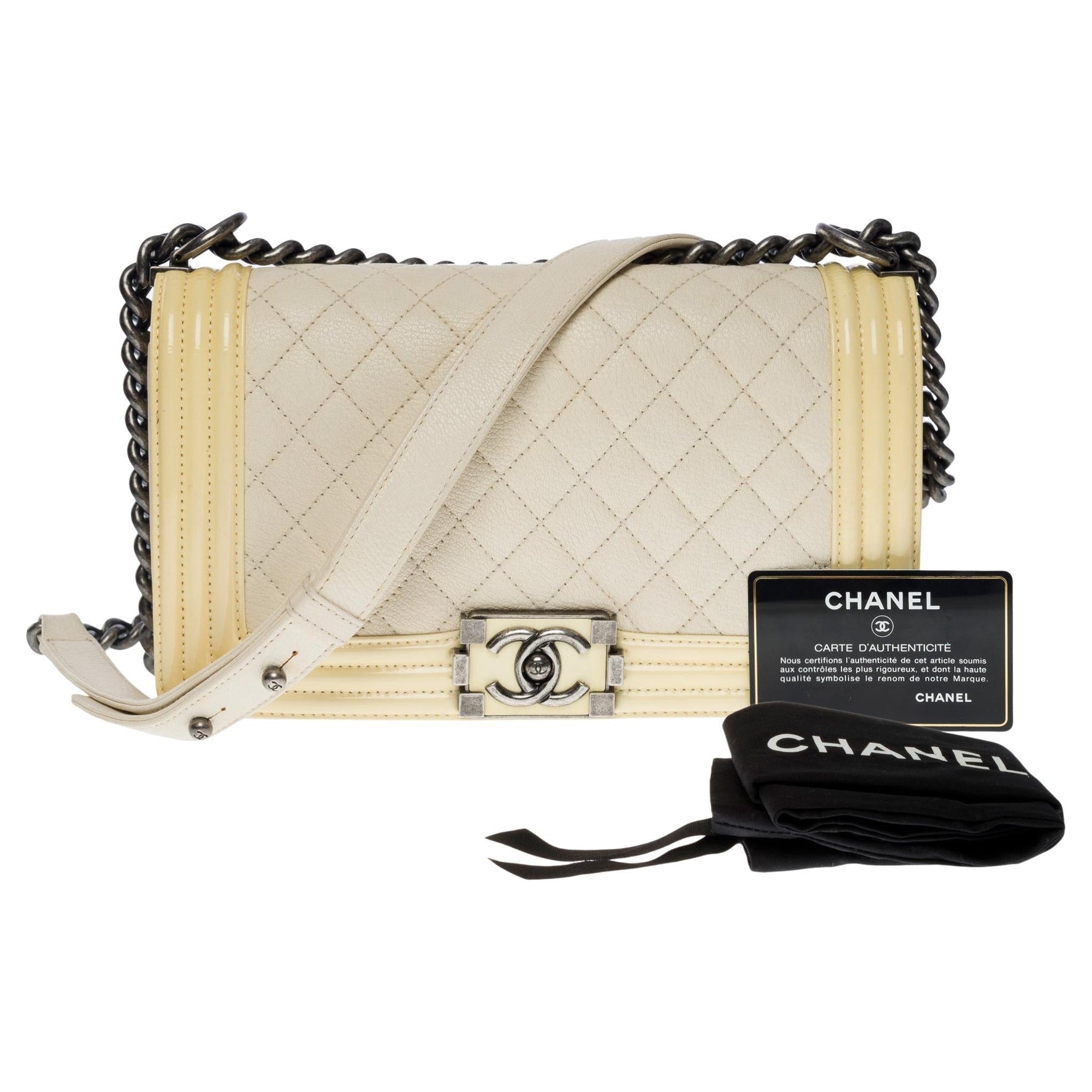 The Iconic Chanel Boy Old Medium shoulder bag in beige caviar leather with yellow varnish outline/frame, ruthenium silver metal hardware, an adjustable ruthenium metal chain handle for shoulder or crossbody carry A ruthenium metal closure on New Inner lining in burgundy canvas, one patch pocket Signature: "Chanel Made in Italy" Date: 2015/2016 Reference: 101150 Dimensions: 25 x 15 x 7 cm (9.8 x 5.9 x 9.84 * 2.7 Inches) Chain length: 55 cm (21.6 Inches) Reference: 101150 Packaging: Hologram: Yes : Yes Dustbag: Yes Box: No General condition: 7/10 In very New condition despite thin New of use on the patent leather, leather, canvas and hardware In addition: issued by a judicial expert at the Appeal Court of Paris
