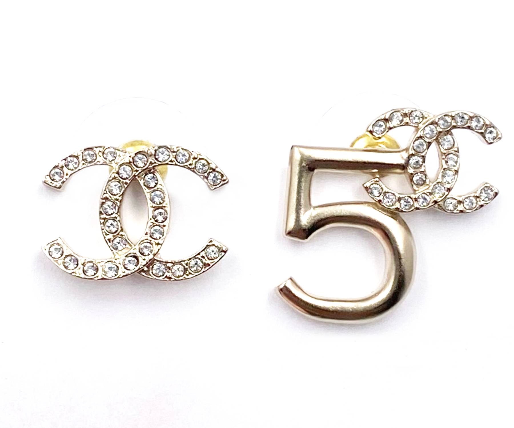 Chanel Brand New Gold CC Crystal 5 Asymmetrical Piercing Earrings.