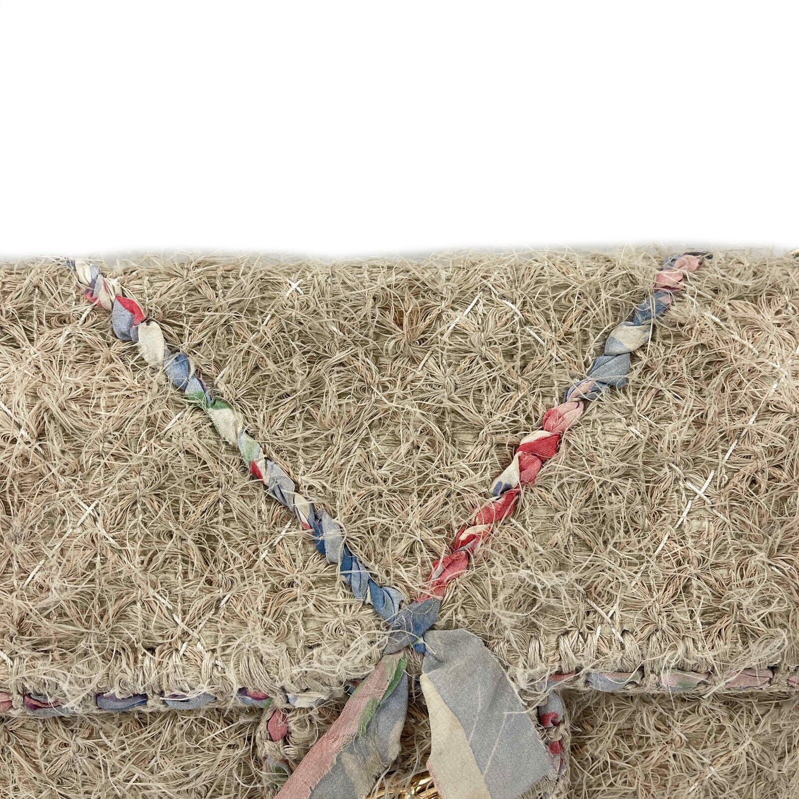 * It's crafted with tan raffia and straw in a tweed-like texture and features a quilted stitch design and a multi-colored satin ribbon trim/detailing.