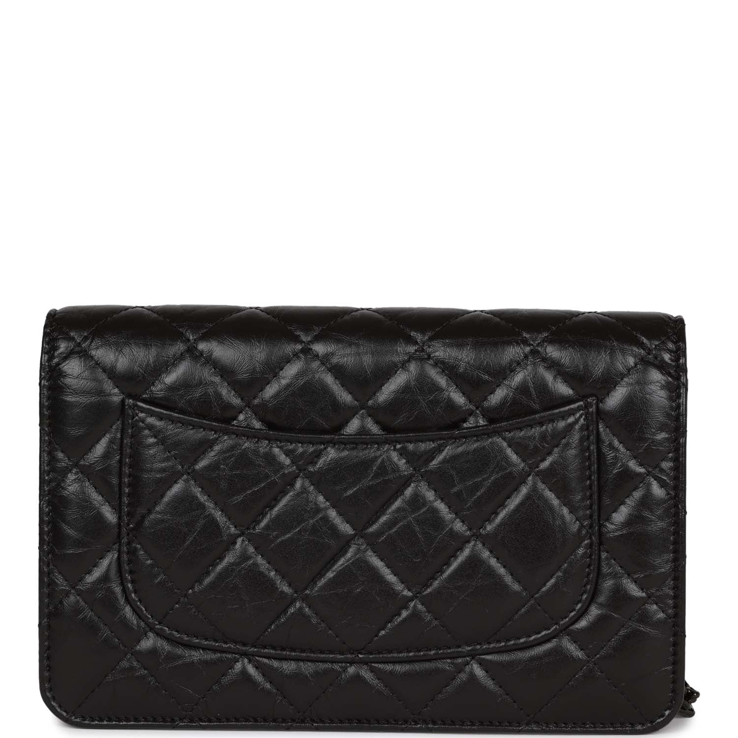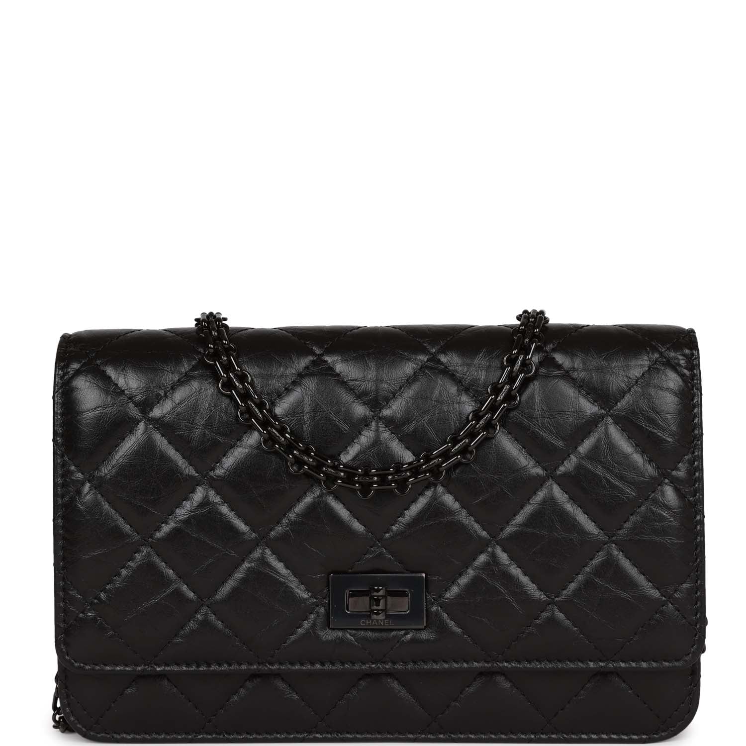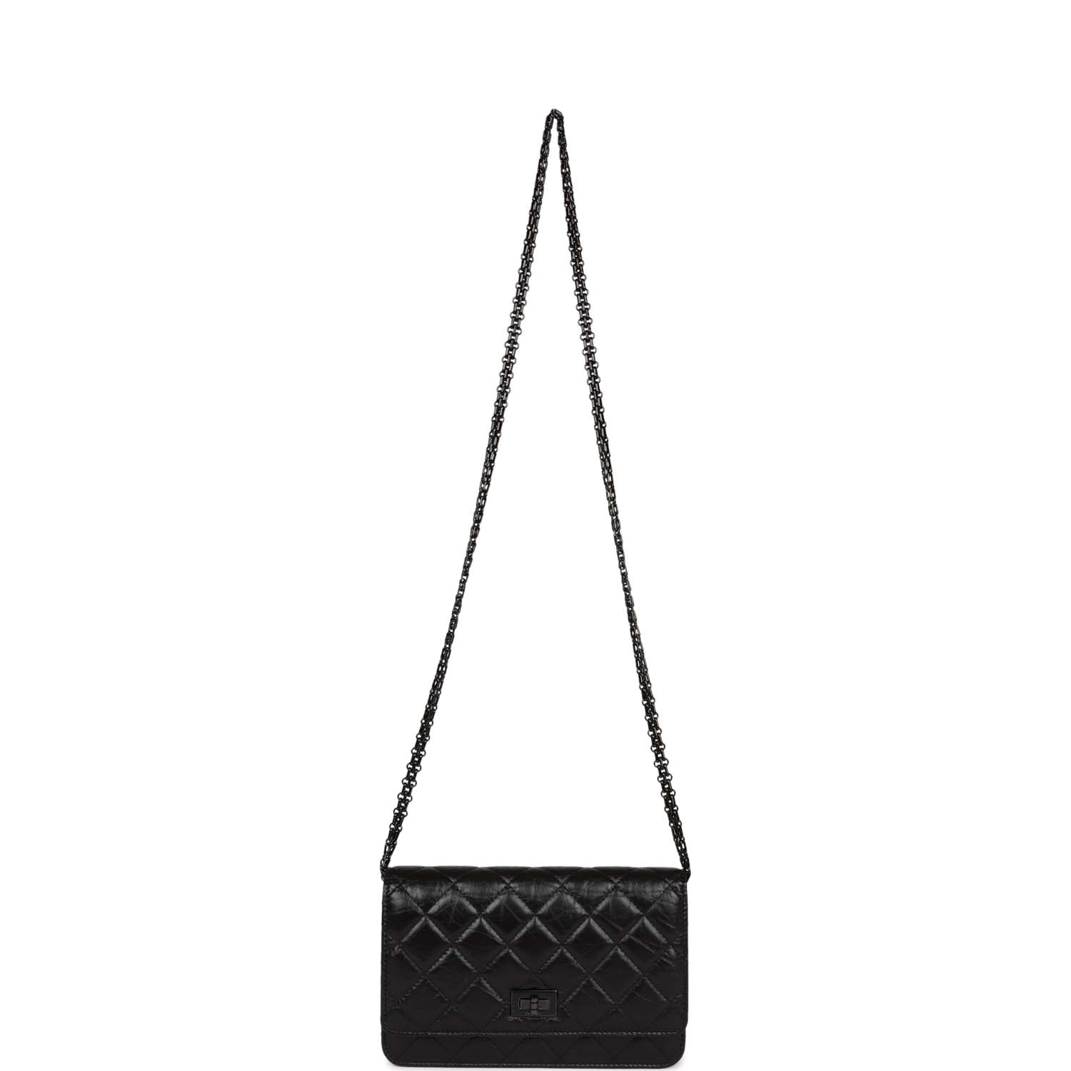 This 18K Reissue Wallet on Chain is in Aged Calfskin with Black Hardware, signature half moon exterior back pocket, front flap with mademoiselle turnlock closure, and a reissue so black chain