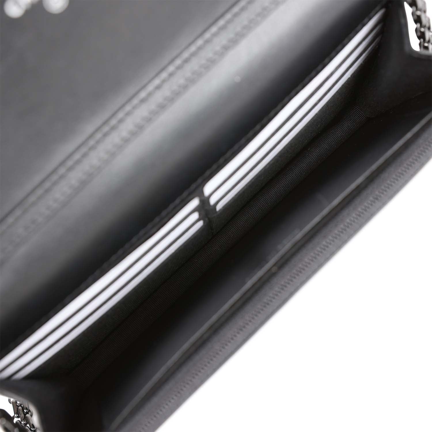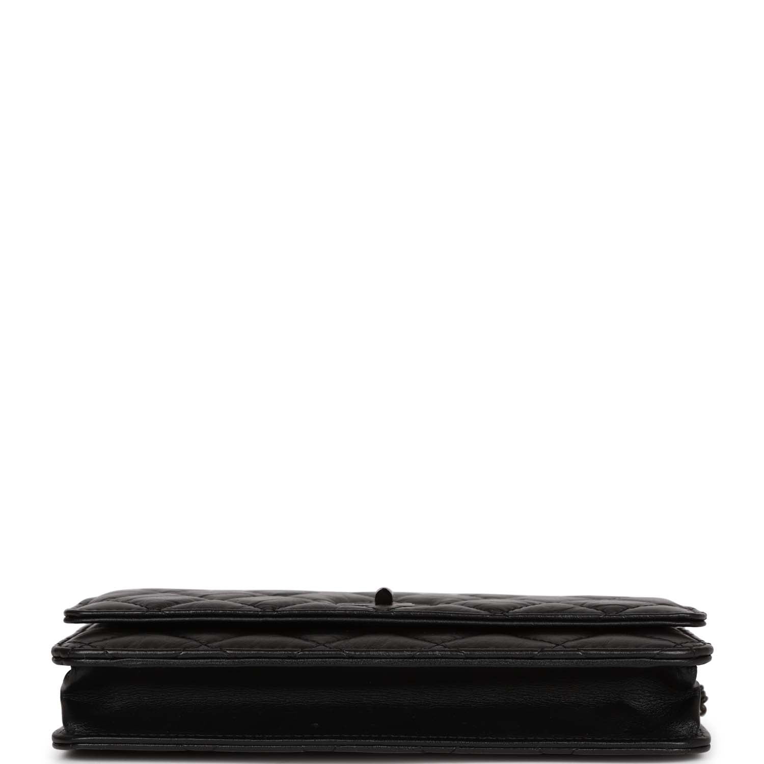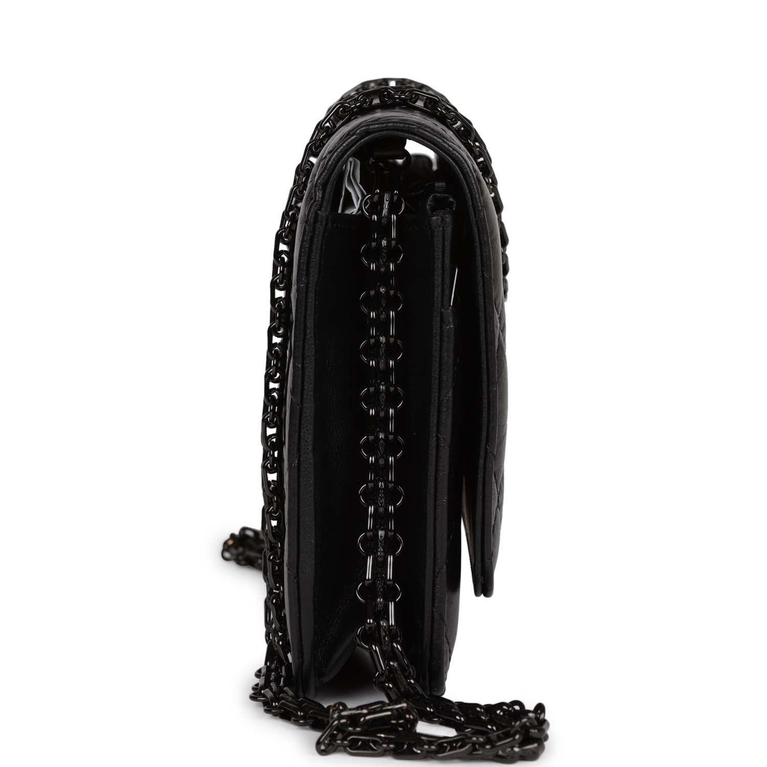 This 18K Reissue Wallet on Chain is in Aged Calfskin with Black Hardware, signature half moon exterior back pocket, front flap with mademoiselle turnlock closure, and a reissue so black chain