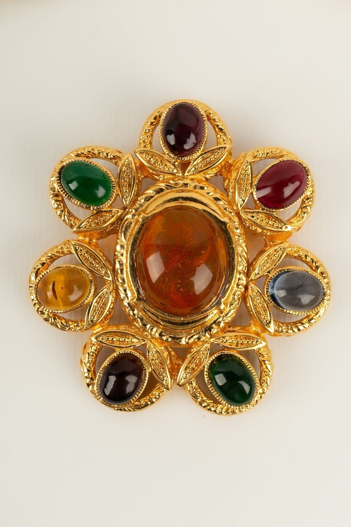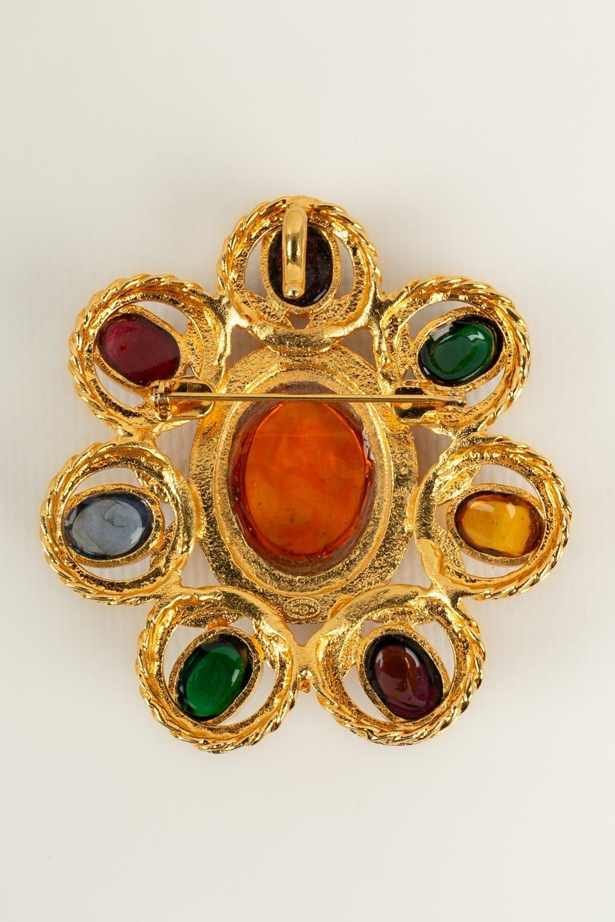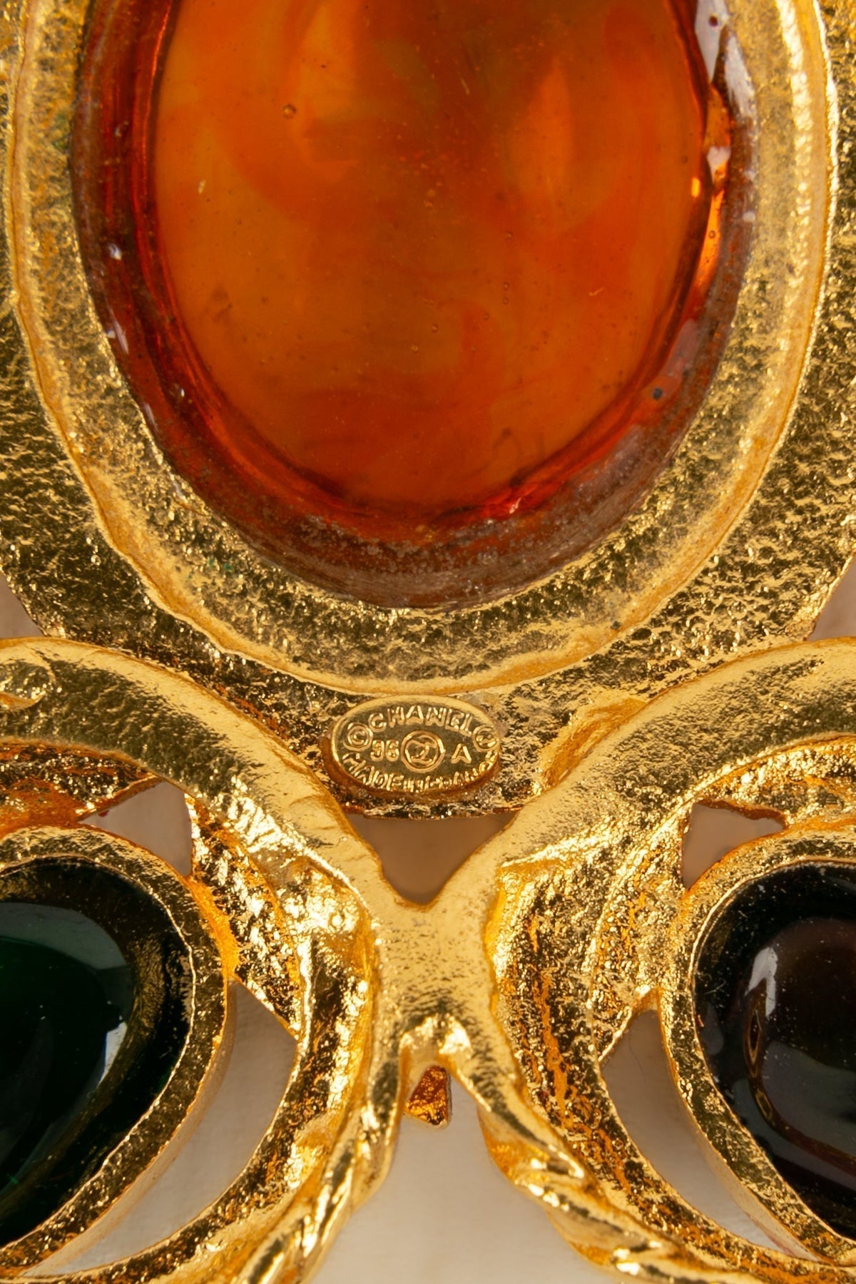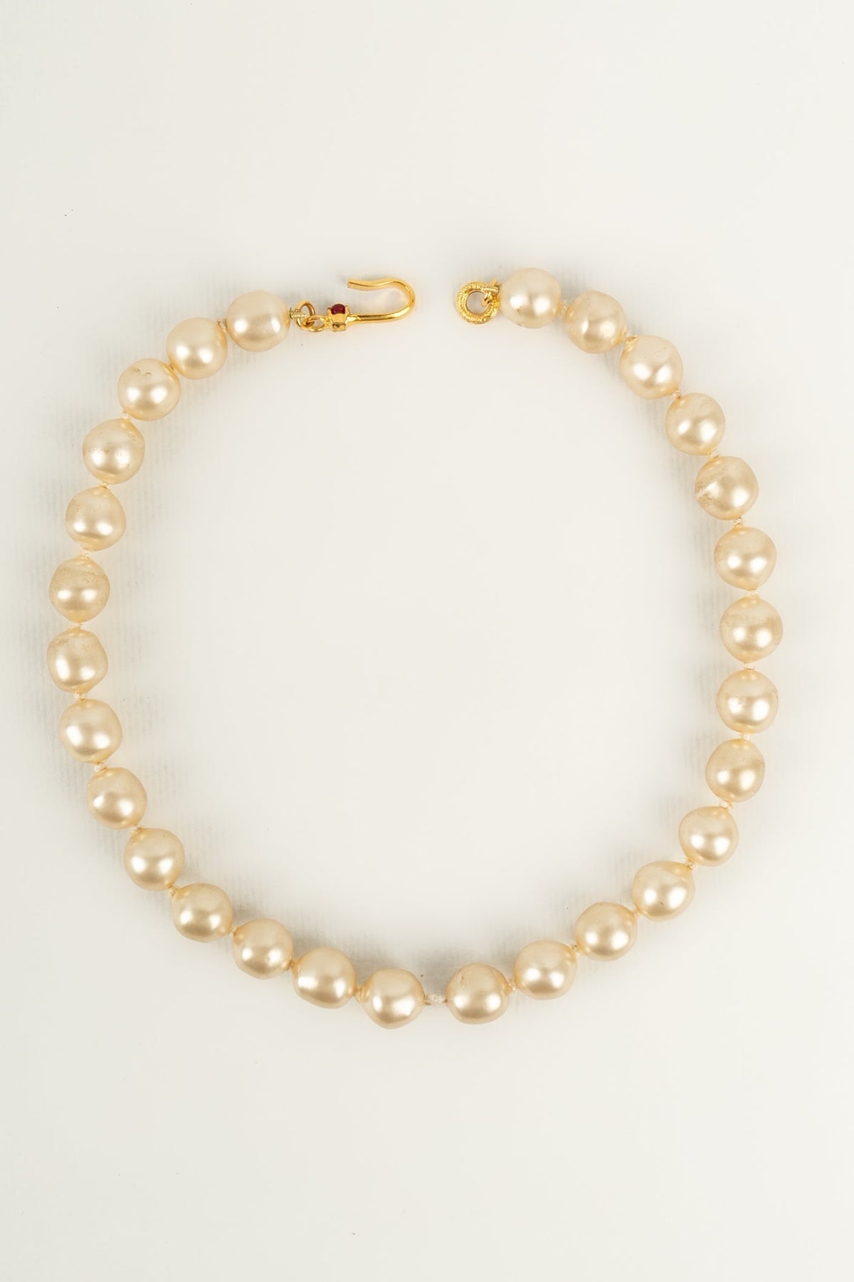 CHANEL - (Made in France) Collier de perles nacrées fantaisies et médaillon en métal doré et pâte de verre. Collection Automne-Hiver 1996.