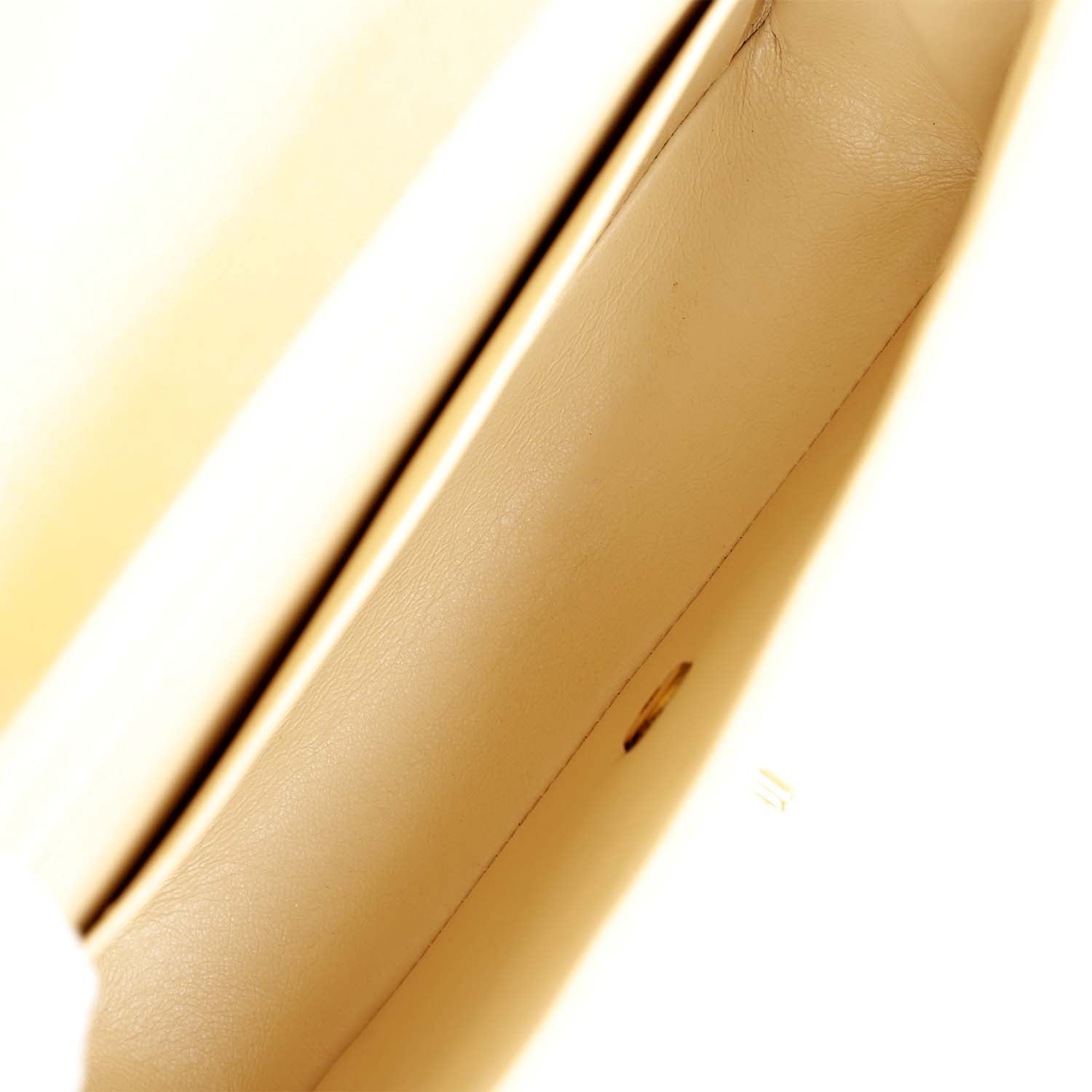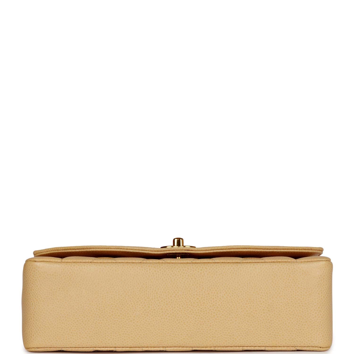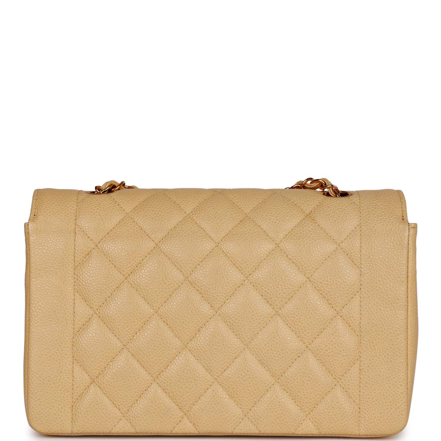 This Vintage Chanel Medium Diana flap bag is in beige caviar leather with gold hardware featuring a front flap with classic gold plated CC turnlock closure and an interwoven gold chain link shoulder/crossbody strap.