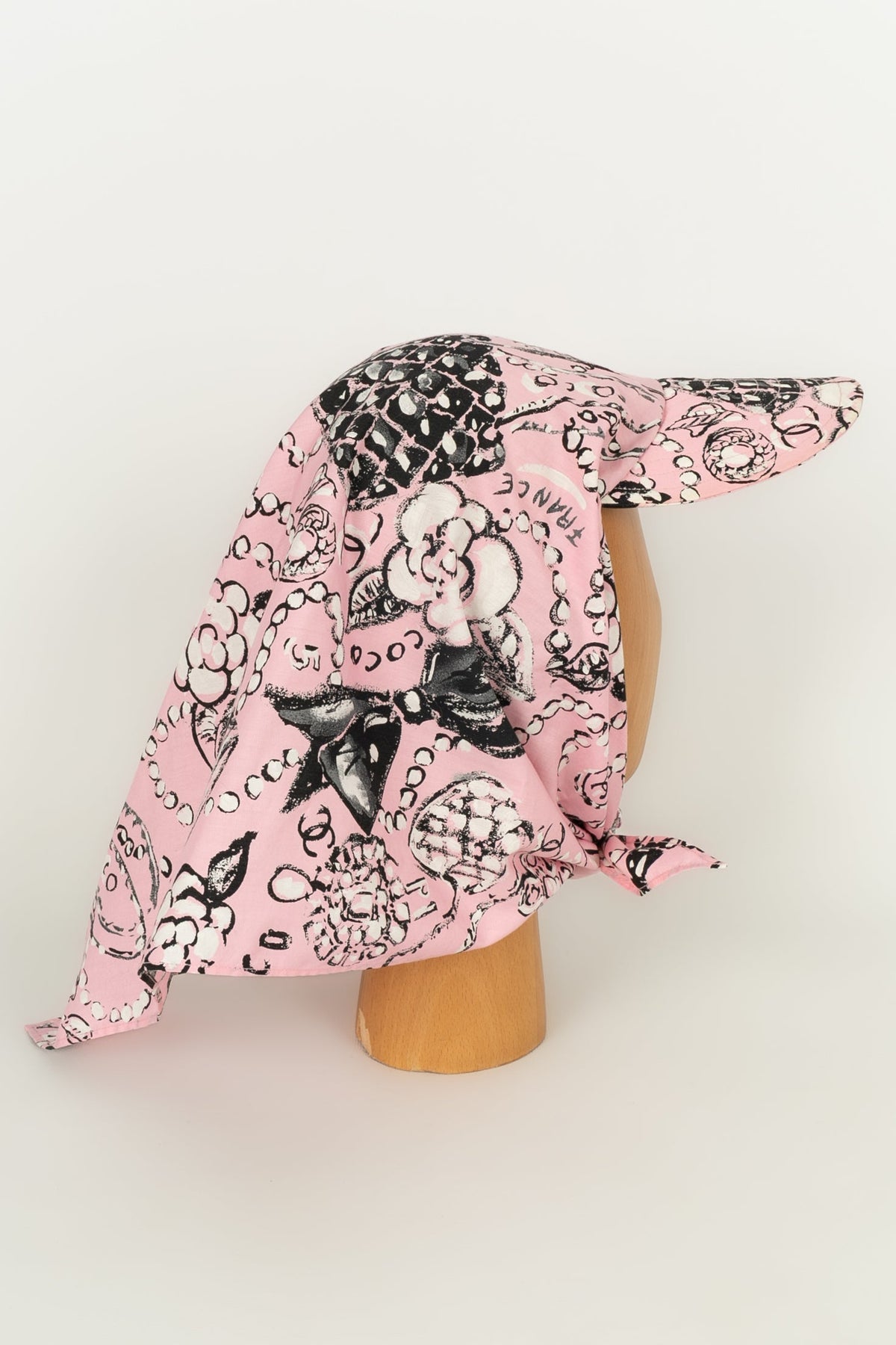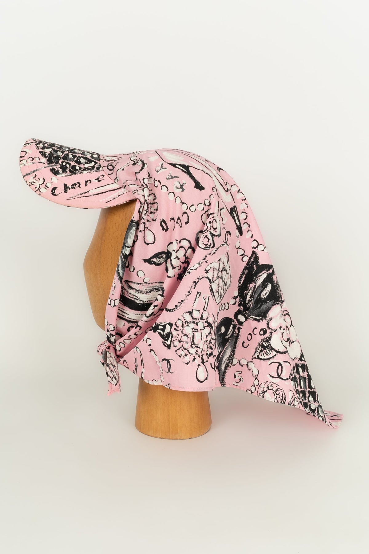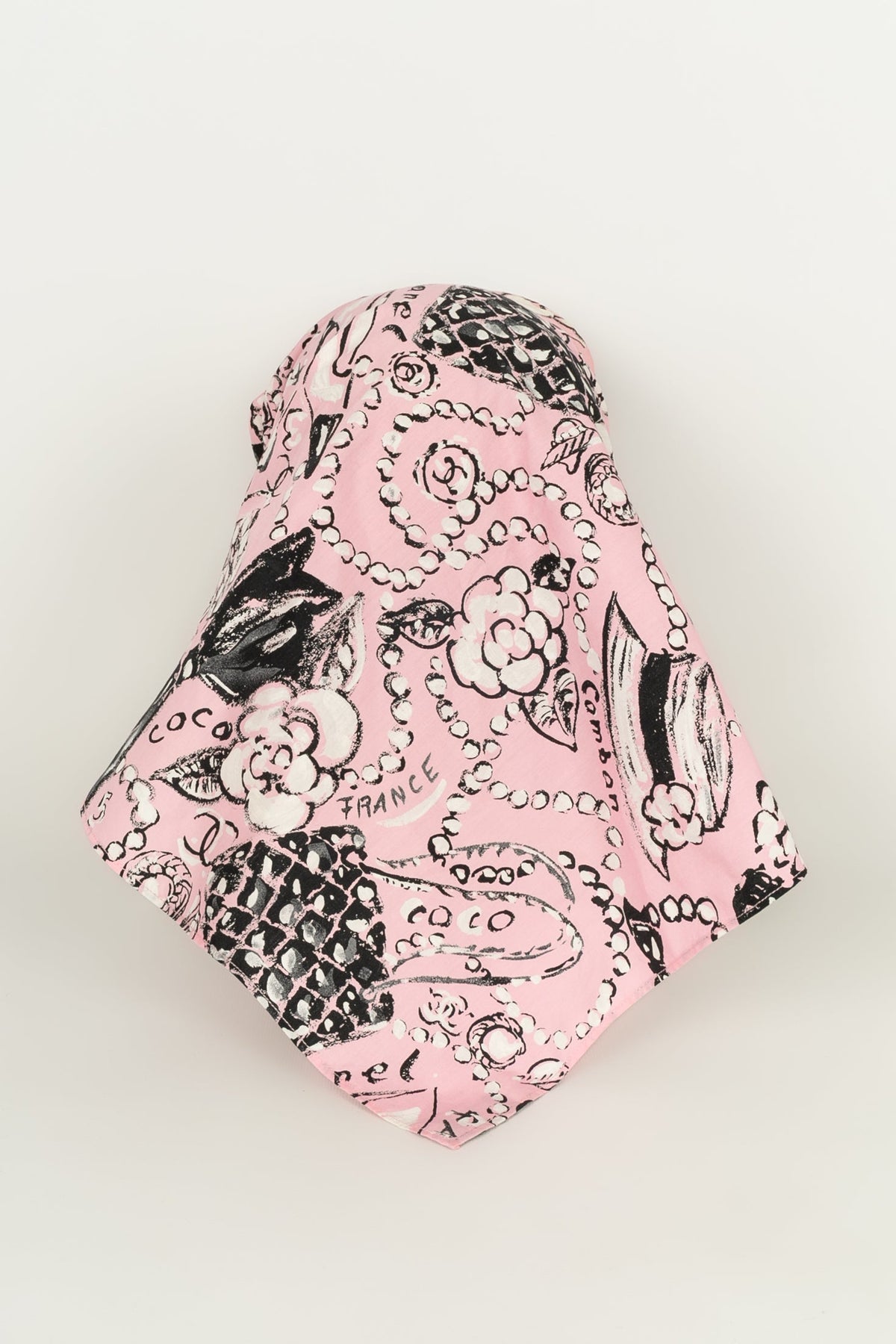 CHANEL -(Made in France) Ensemble composé d'un top, d'un bas de bikini et d'une visière foulard à imprimé noir et blanc sur fond rose. Taille indiquée 40FR. Collection Printemps-Eté 1993-1994.