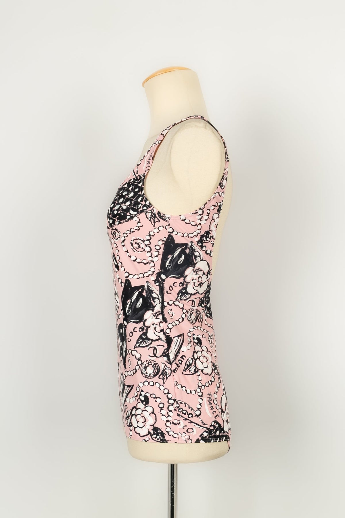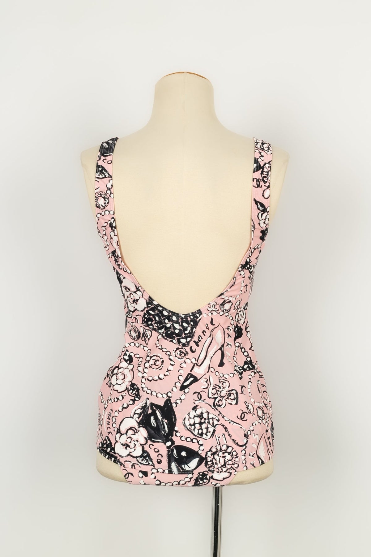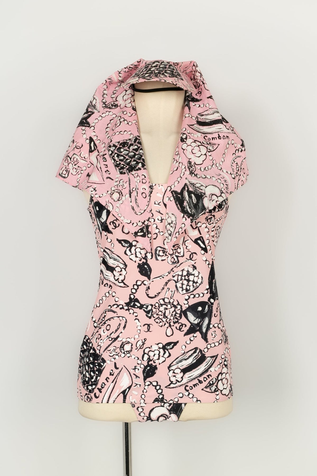 CHANEL -(Made in France) Ensemble composé d'un top, d'un bas de bikini et d'une visière foulard à imprimé noir et blanc sur fond rose. Taille indiquée 40FR. Collection Printemps-Eté 1993-1994.