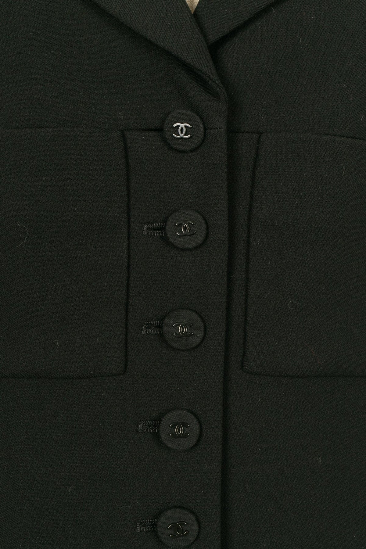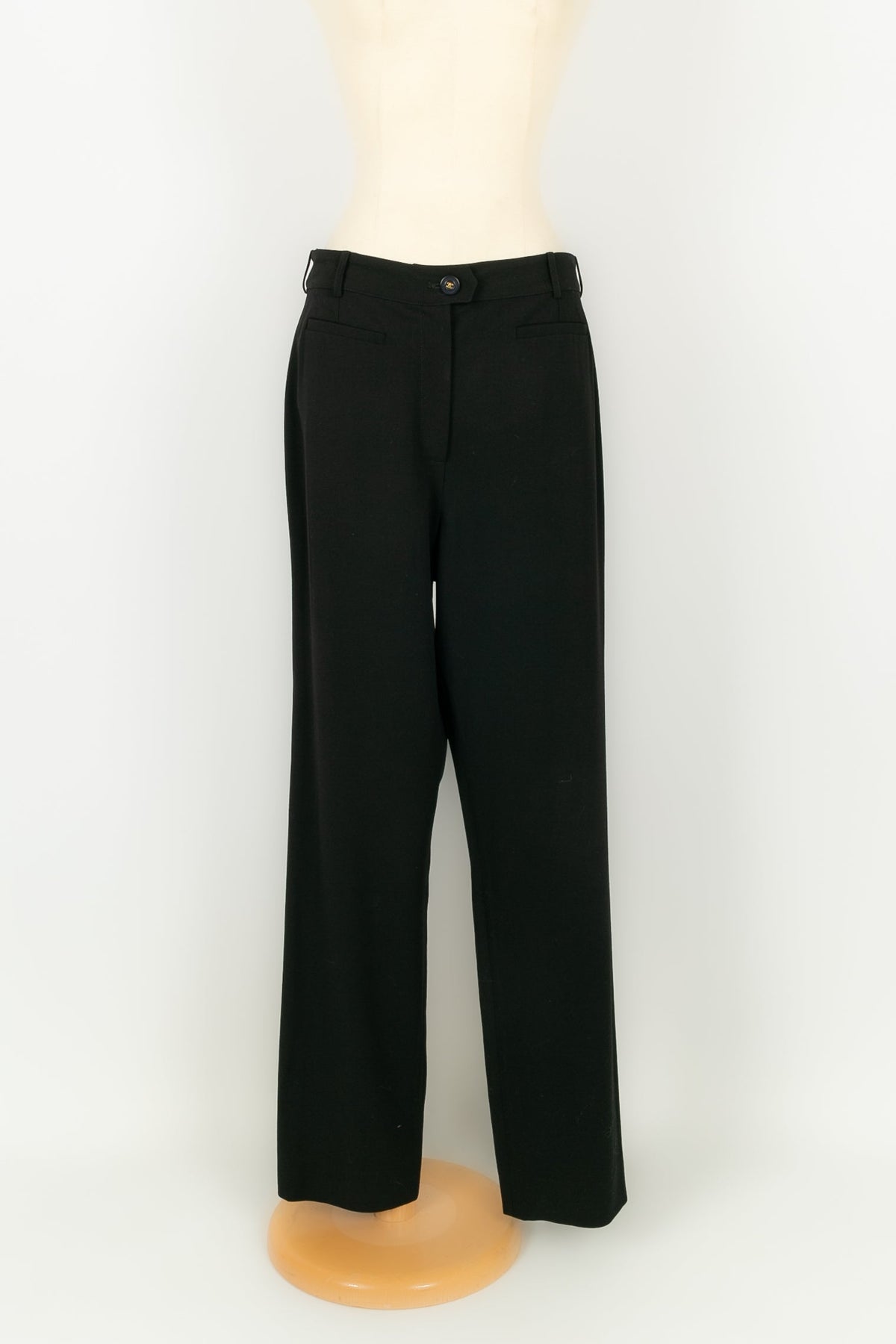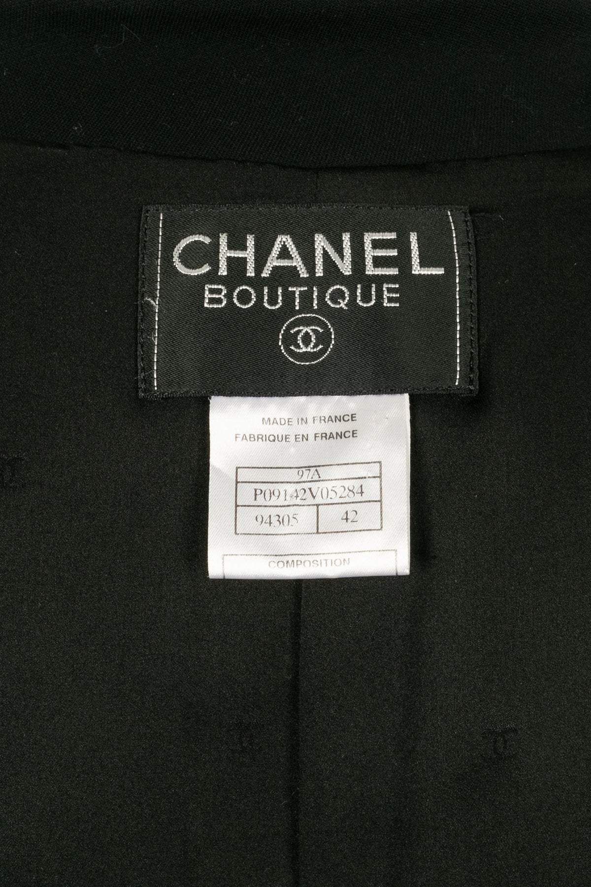 CHANEL - (Made in France) Ensemble de tailleur composé d'une veste et d'un pantalon en laine noire. Collection Automne-Hiver 1997. Taille 42FR.