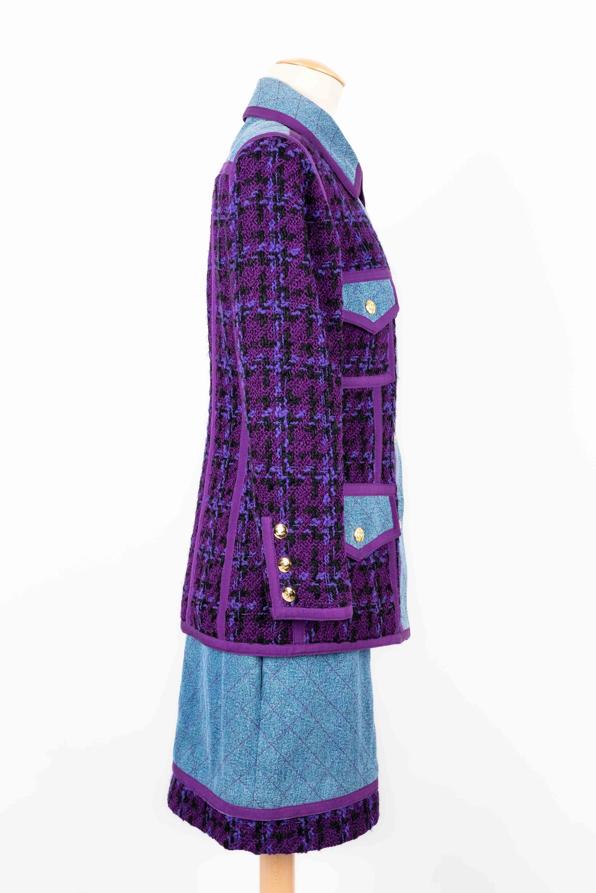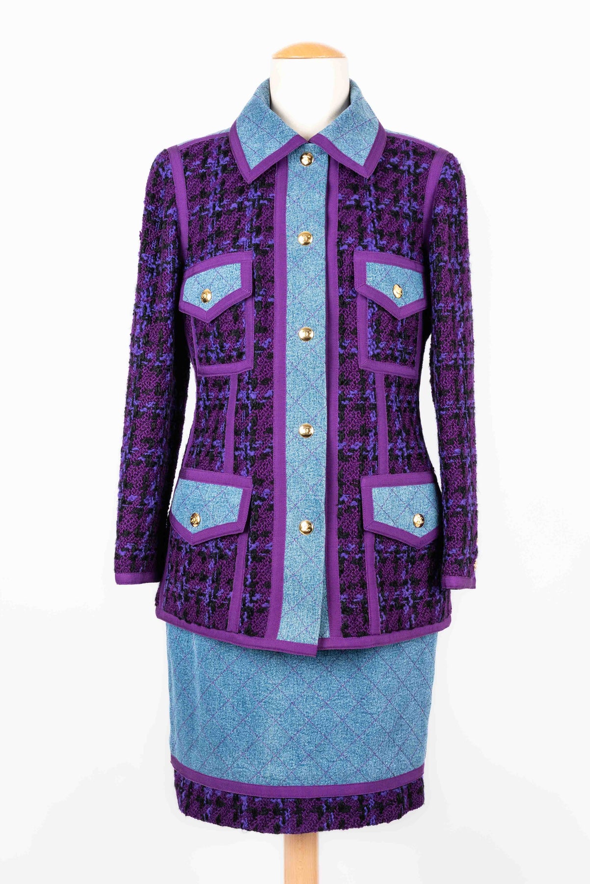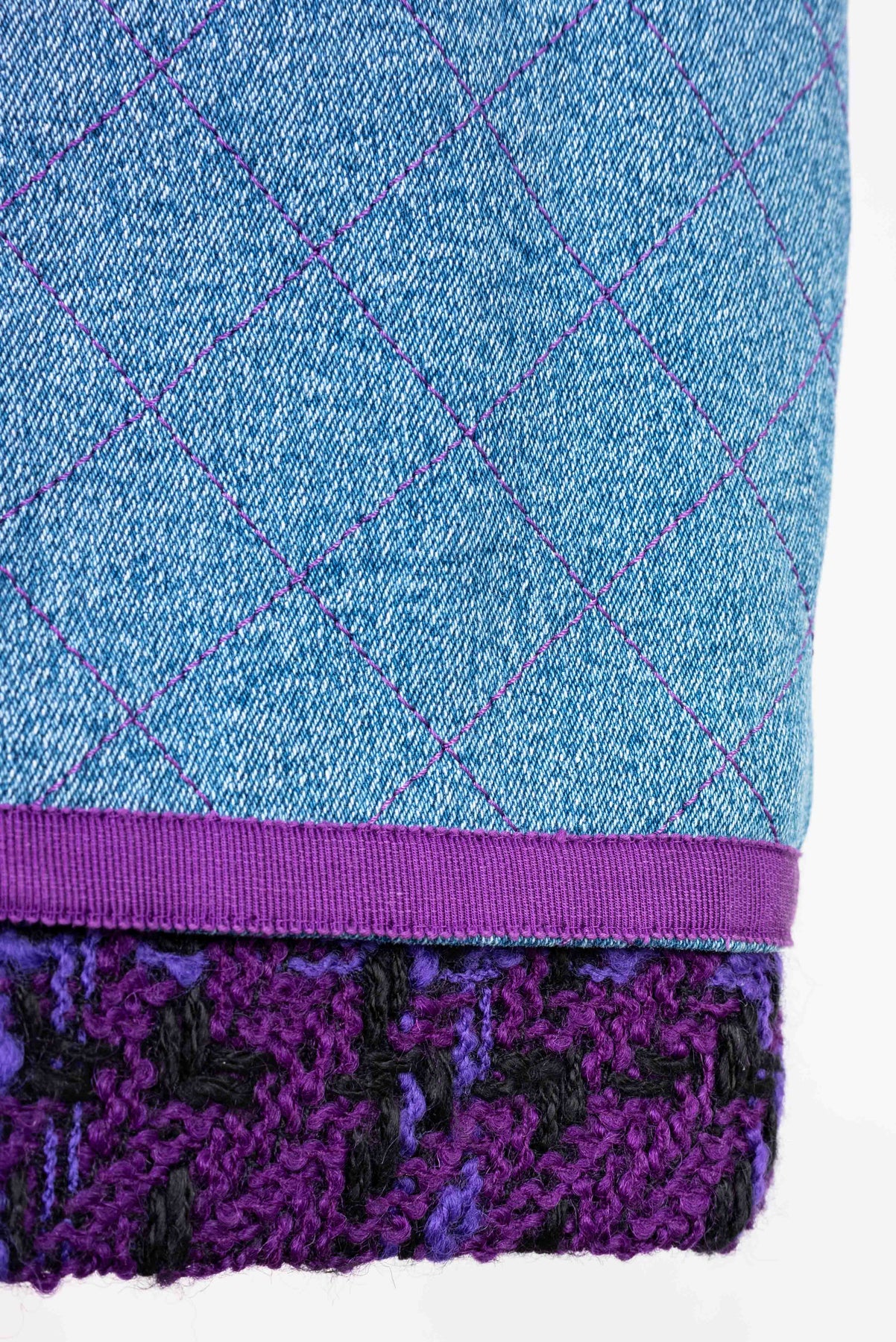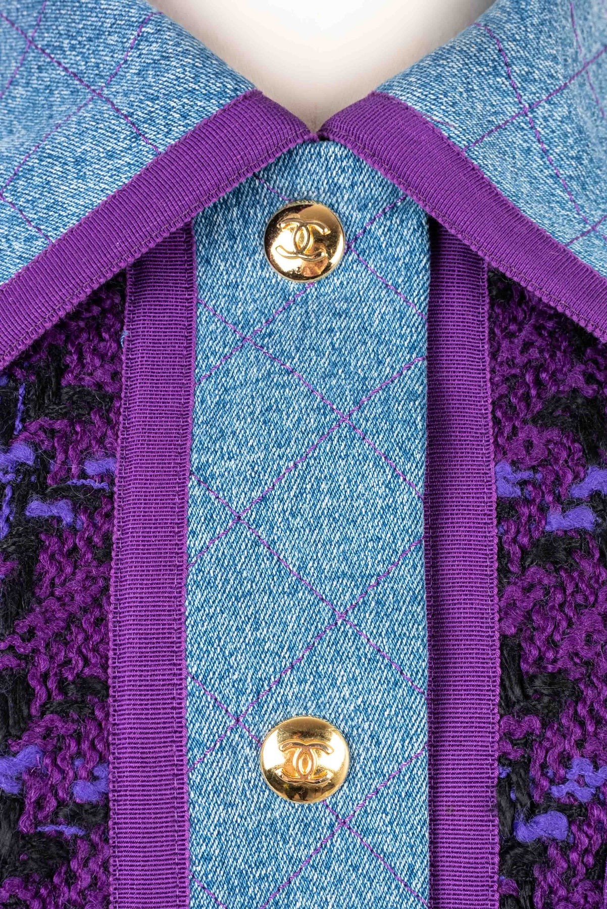 CHANEL - (Made in France) Ensemble tailleur composé d'une jupe et veste en tweed dans les tons de violets et de noir, poches, col et boutonnière en jeans matelassé. Taille indiquée 42FR. Collection Automne/Hiver 1991.