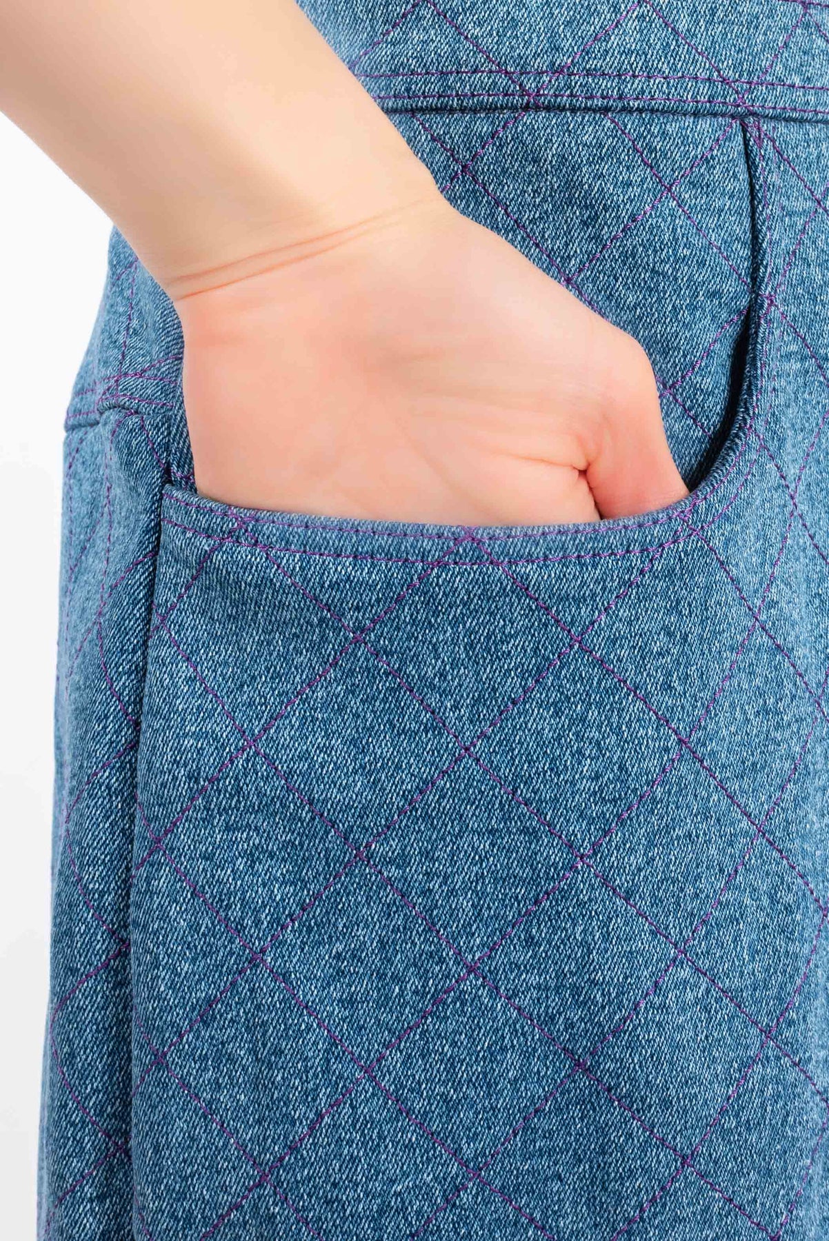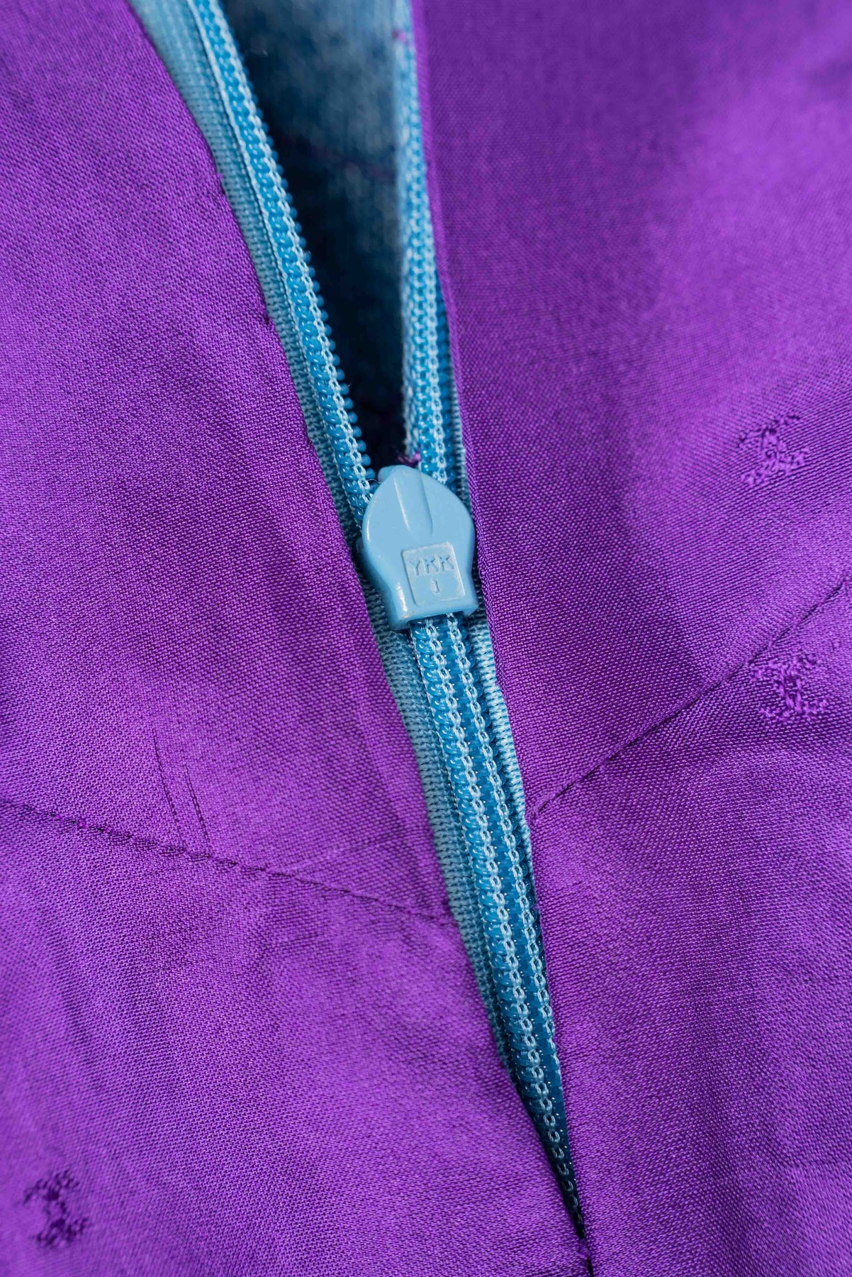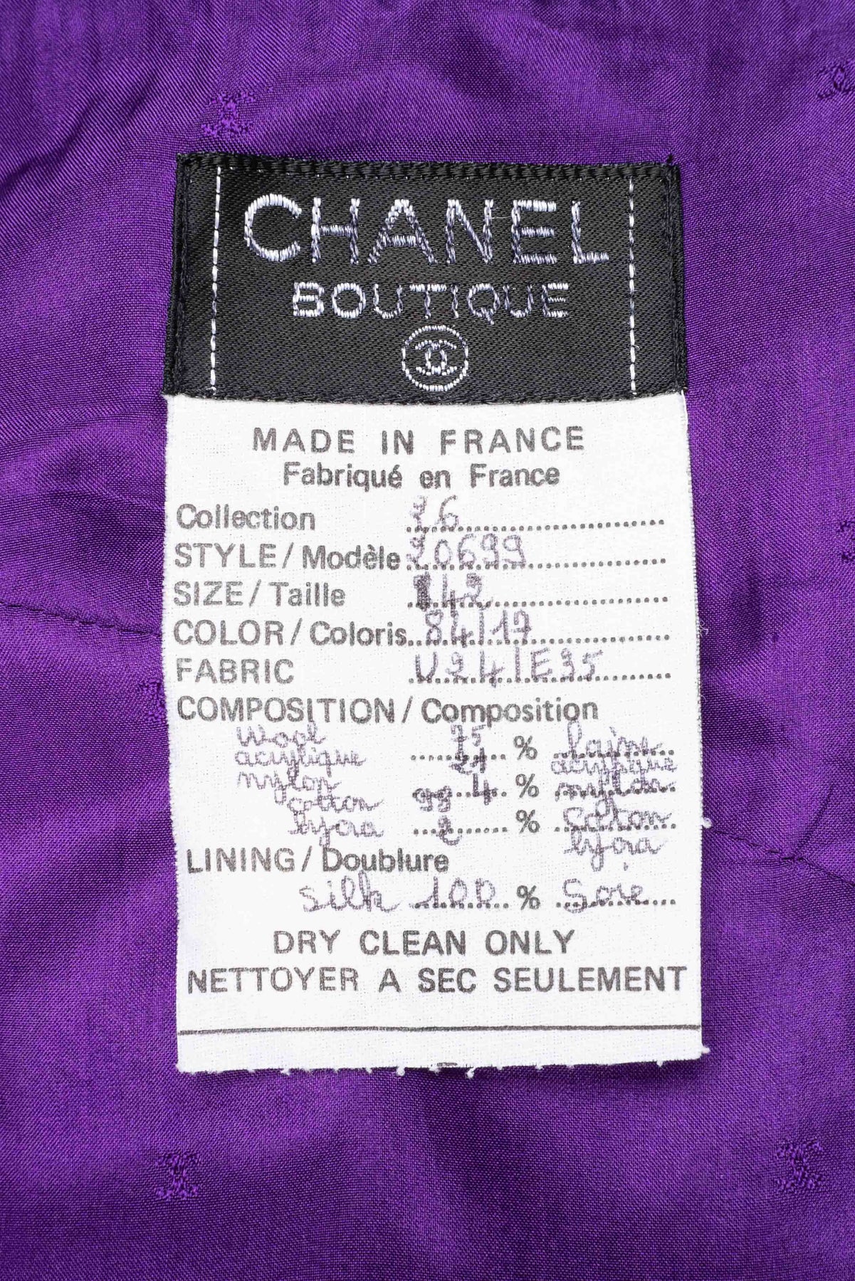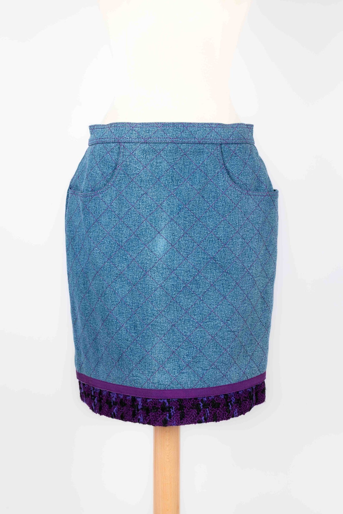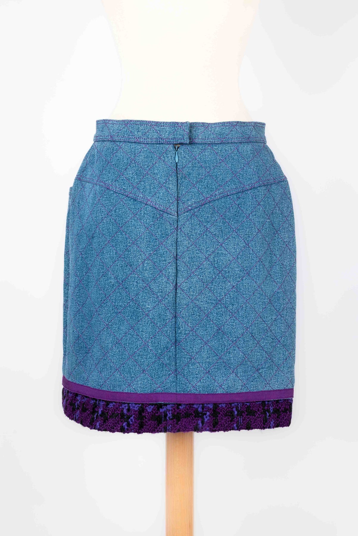CHANEL - (Made in France) Ensemble tailleur composé d'une jupe et veste en tweed dans les tons de violets et de noir, poches, col et boutonnière en jeans matelassé. Taille indiquée 42FR. Collection Automne/Hiver 1991.