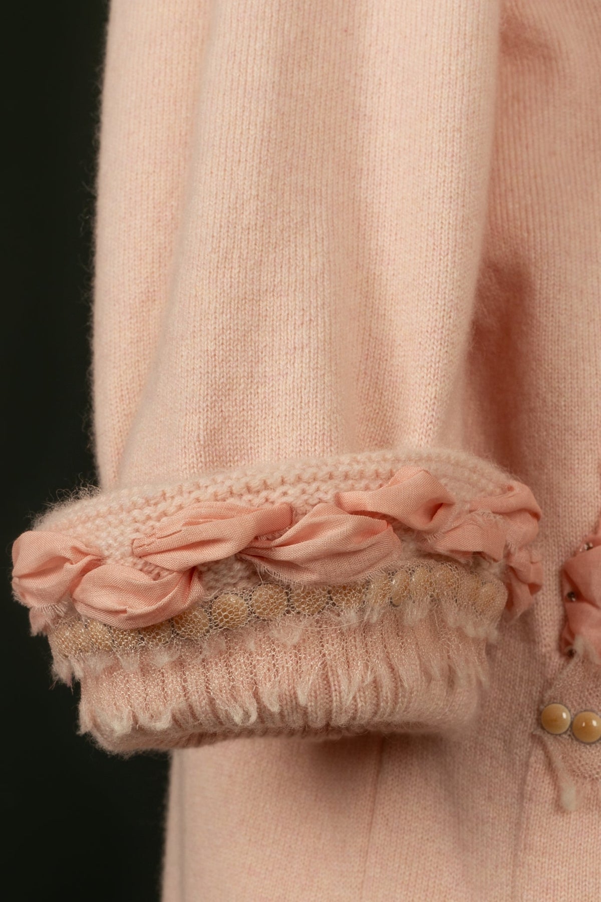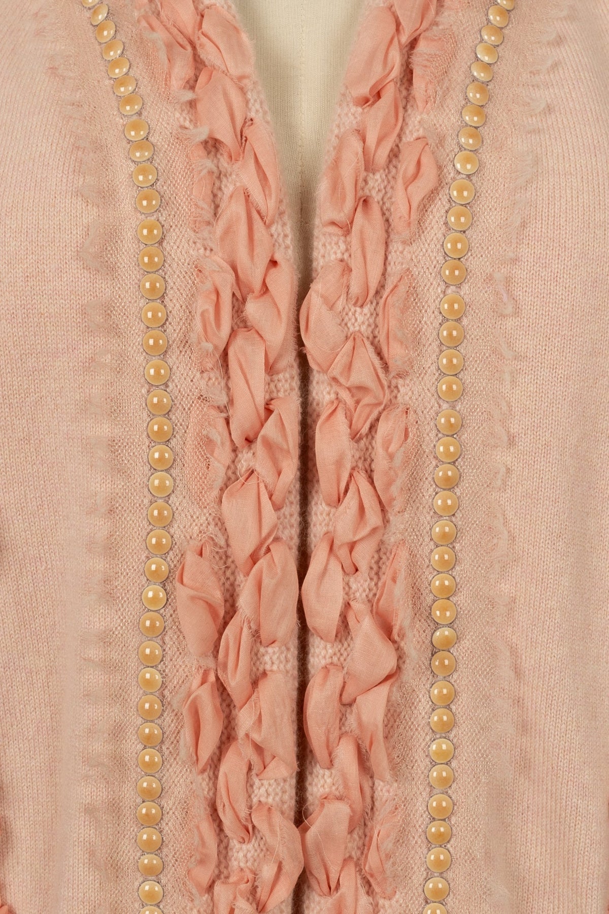 CHANEL - (Made in Italy) Gilet en cachemire rose agrémenté de rubans, de perles... Taille 40FR. A signaler, petit défaut dans la maille présent dans le dos du gilet.
