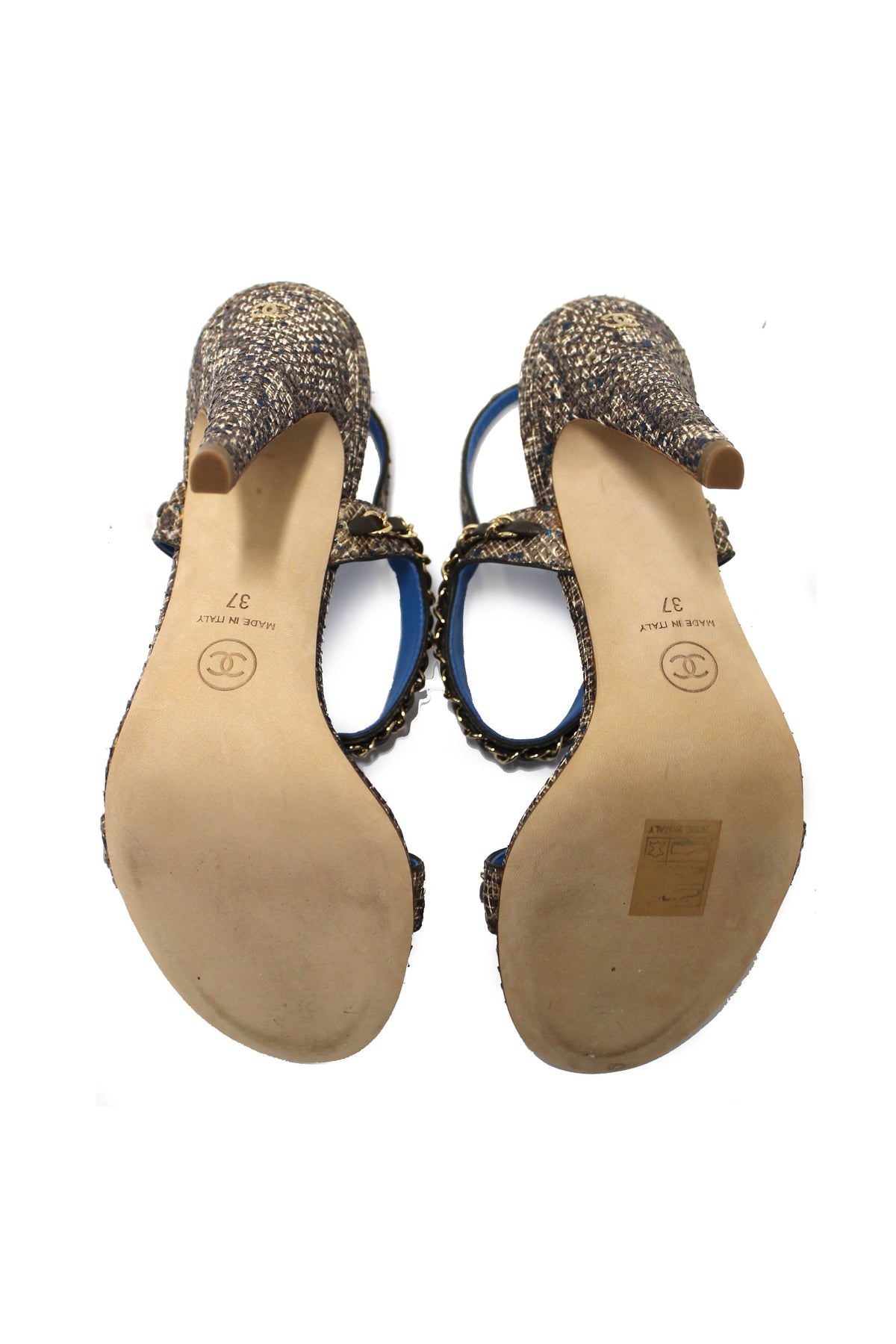 Chanel Blue Tweed Chain Sandal Heel Shoes Size 37
