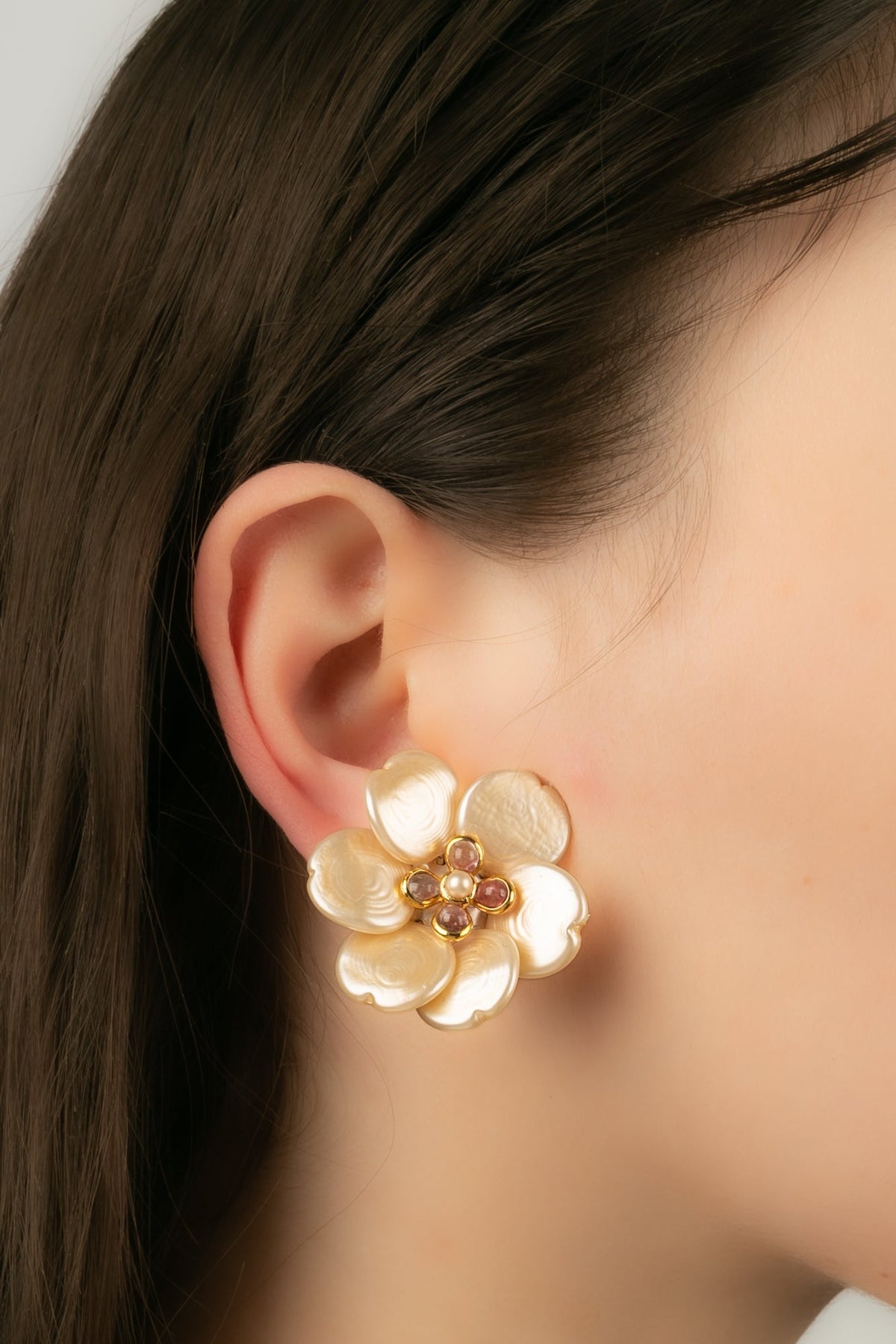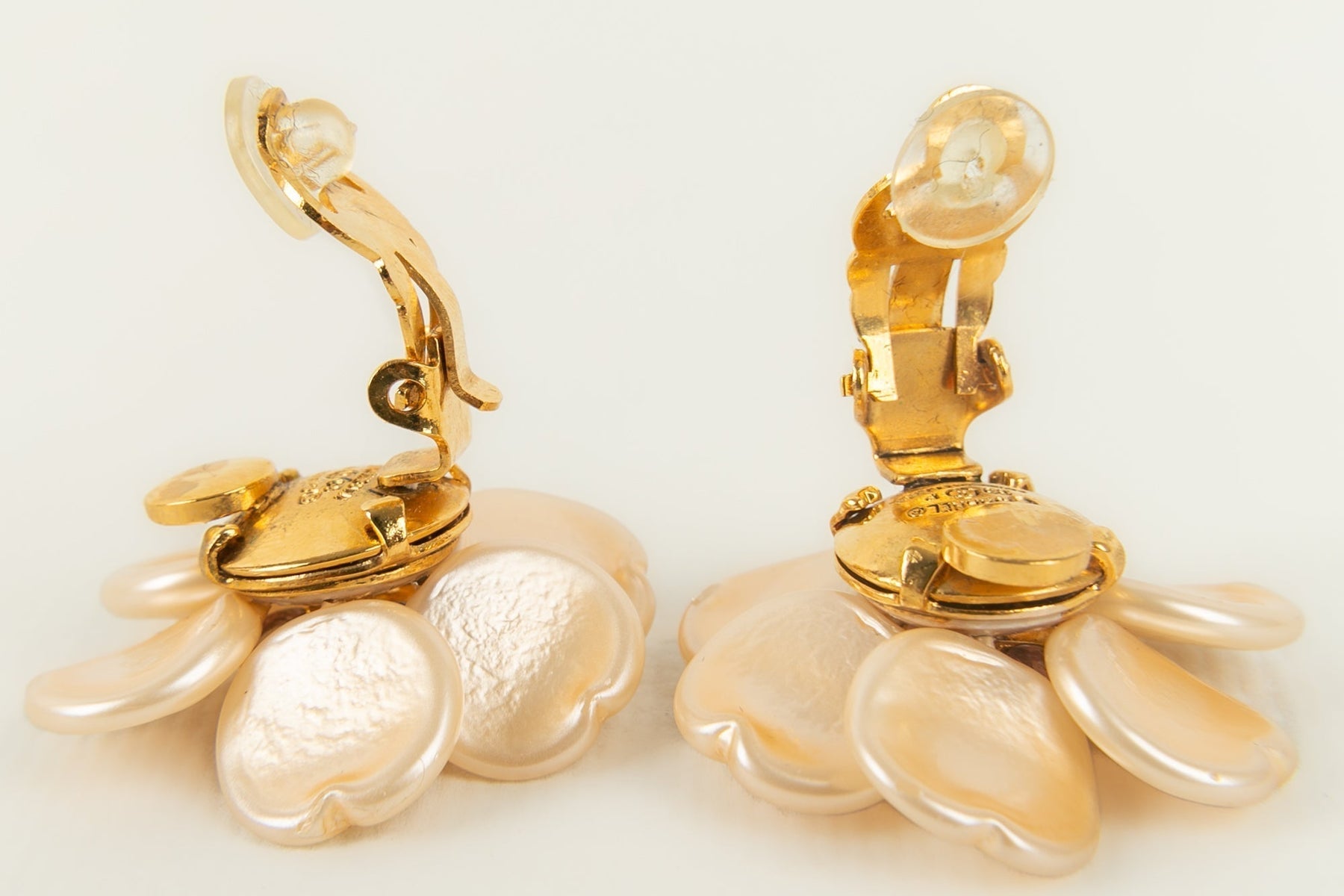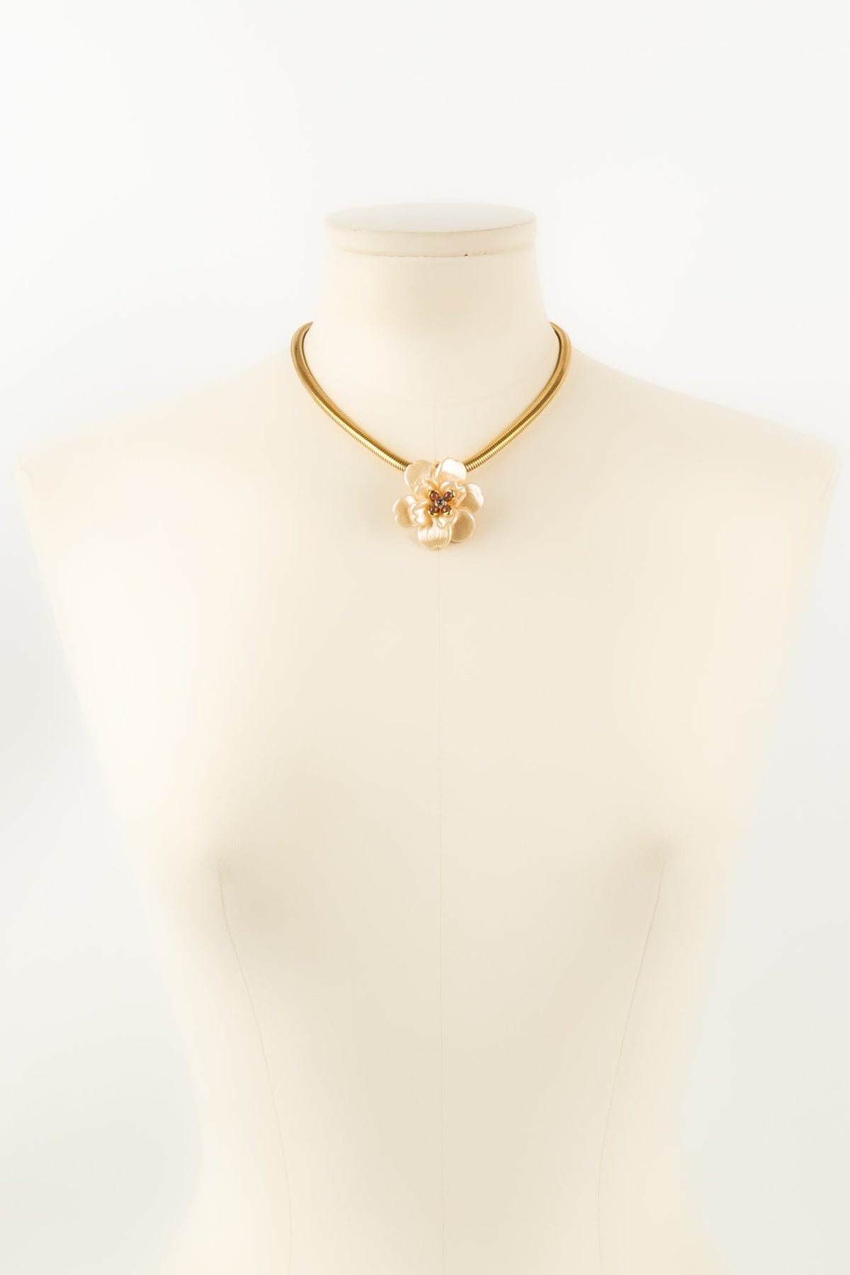CHANEL - (Made in France) Parure composée d'une paire de boucles d'oreilles et collier en métal doré et pâte de verre. Collection printemps/été 1999.