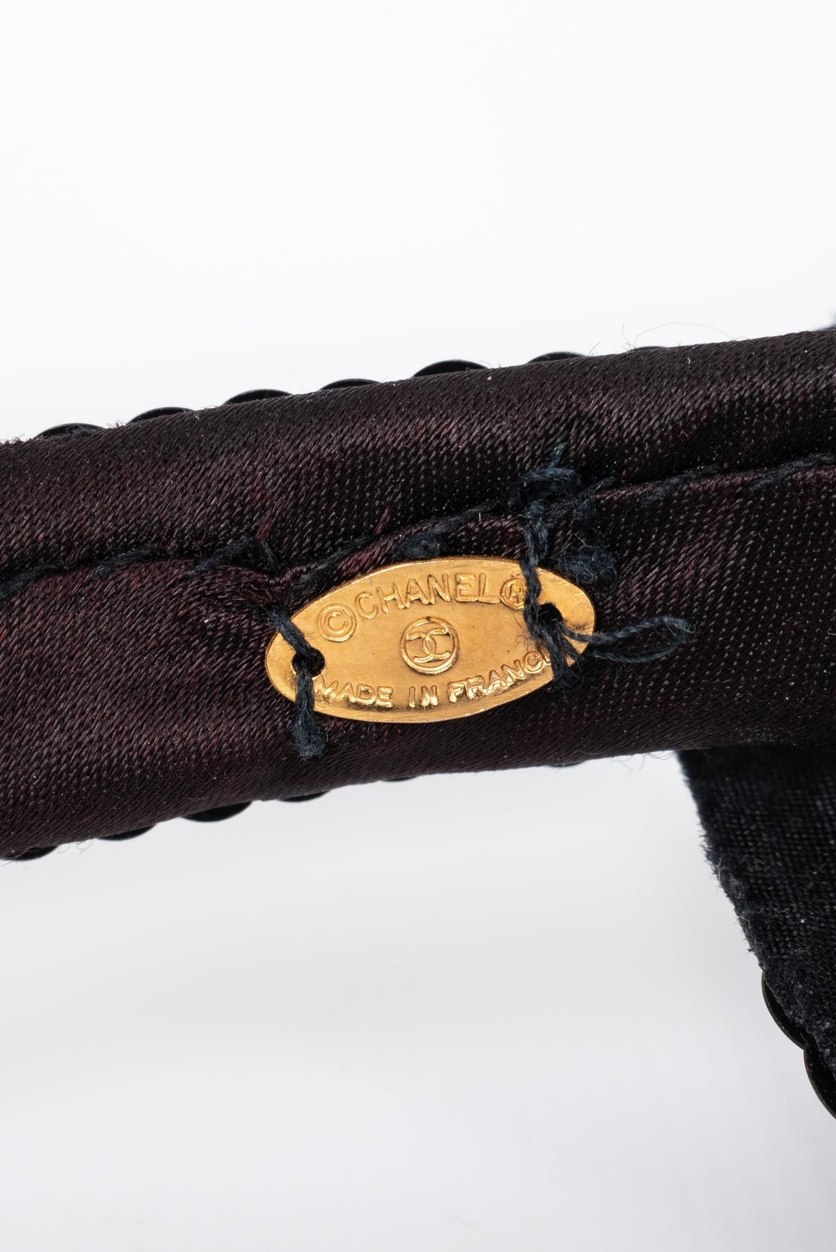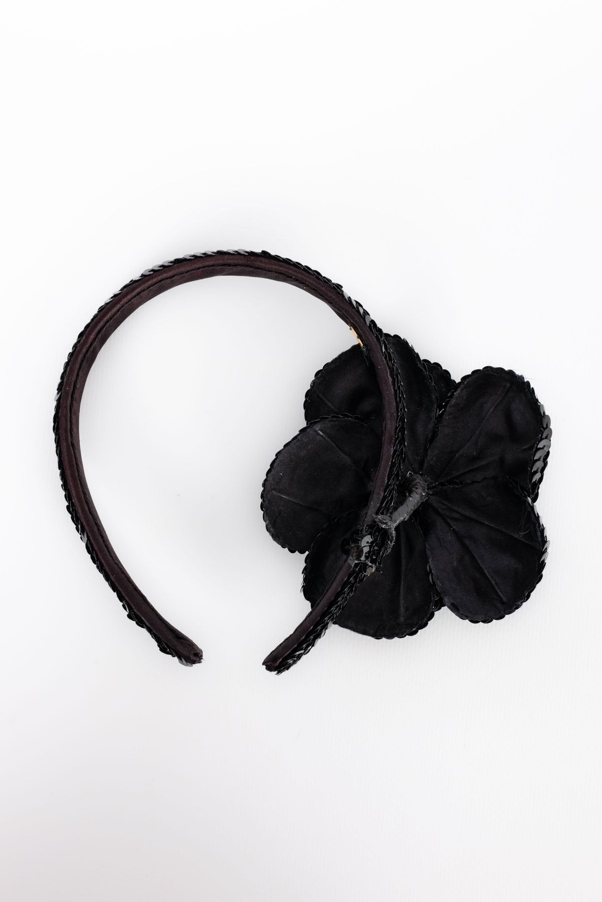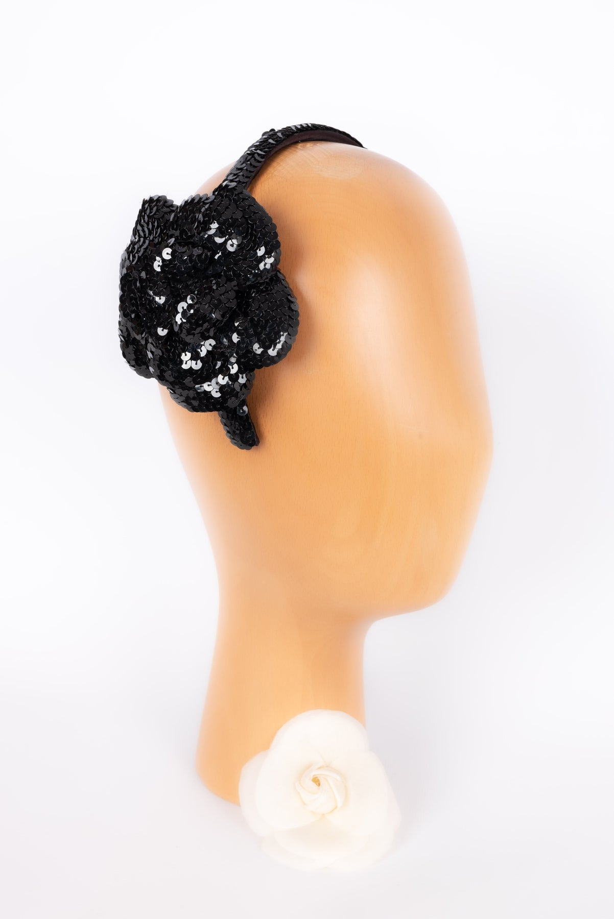 CHANEL -(Made in France) Serre-tête à paillettes noires décoré d'un camélia.