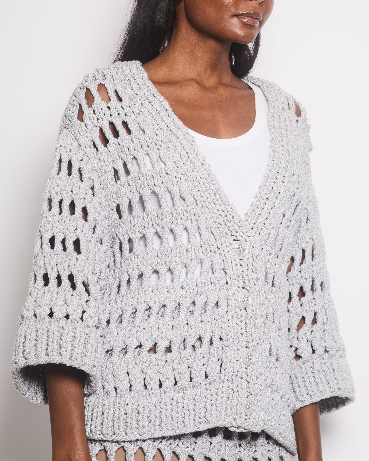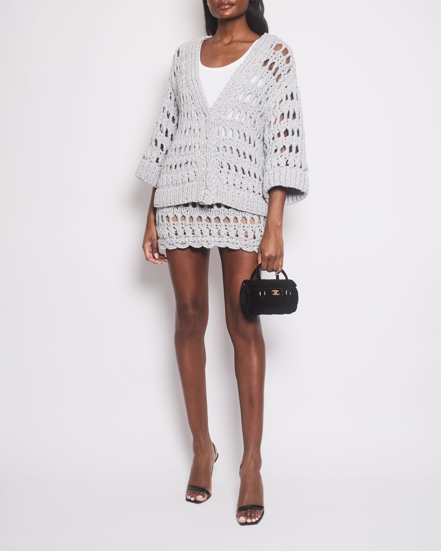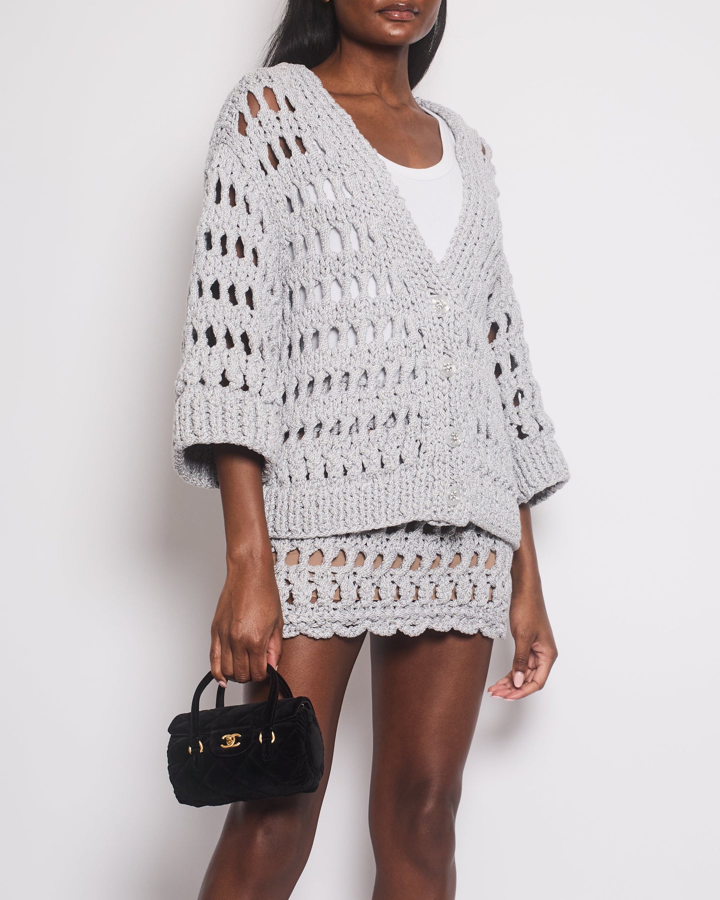 *SUPER HOT* Chanel 25C Grey Chunky Knitted igan & Skirt Set with Crystal Flower Buttons Detail Size FR 36 (UK 8) / FR 34 (UK 6)