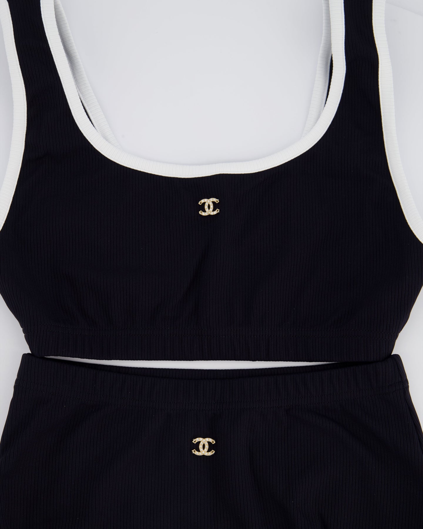 Chanel 22S Black Two Piece Swim Suit Set with White Trim and Crystal CC Logo Detail Size Top FR 36 (UK 8) Bottoms FR 34 (UK 6)