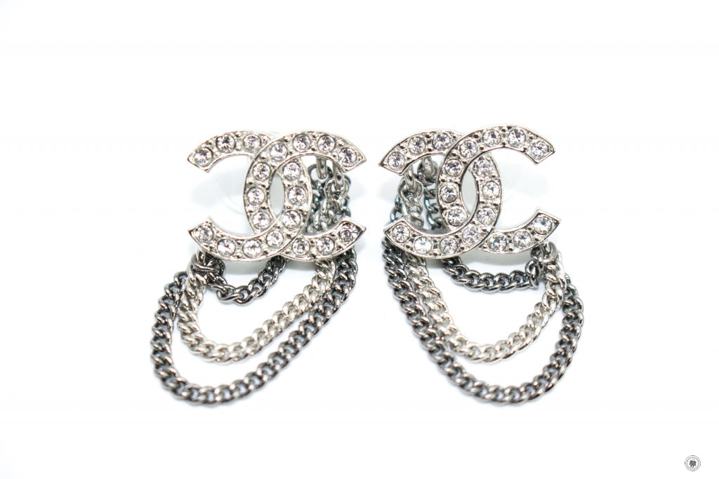 Chanel AB7062B06545 CC Logo With Cyrstal And Chains Silver / NF074 Metal 1.8CMX1.3CM Earrings Shw