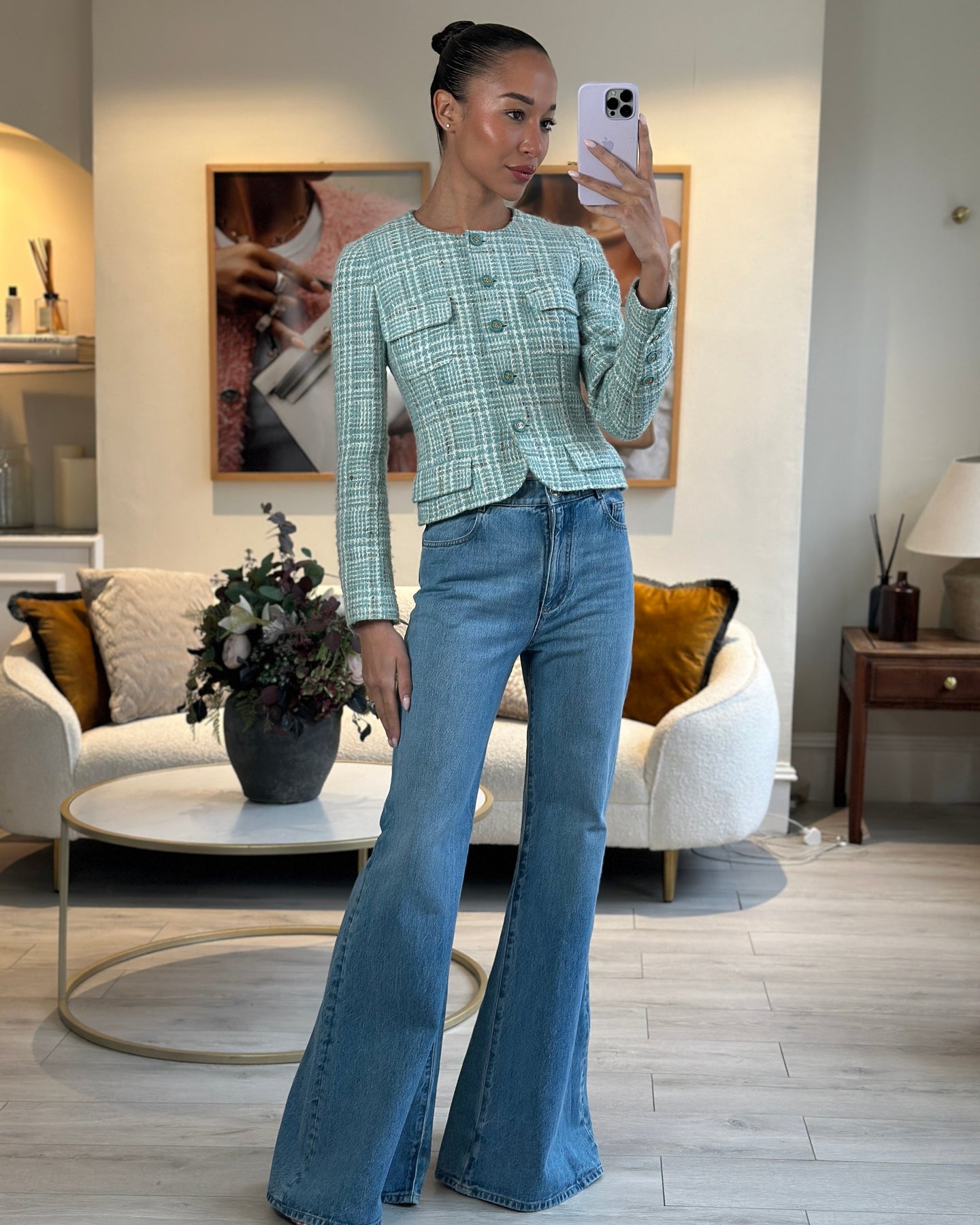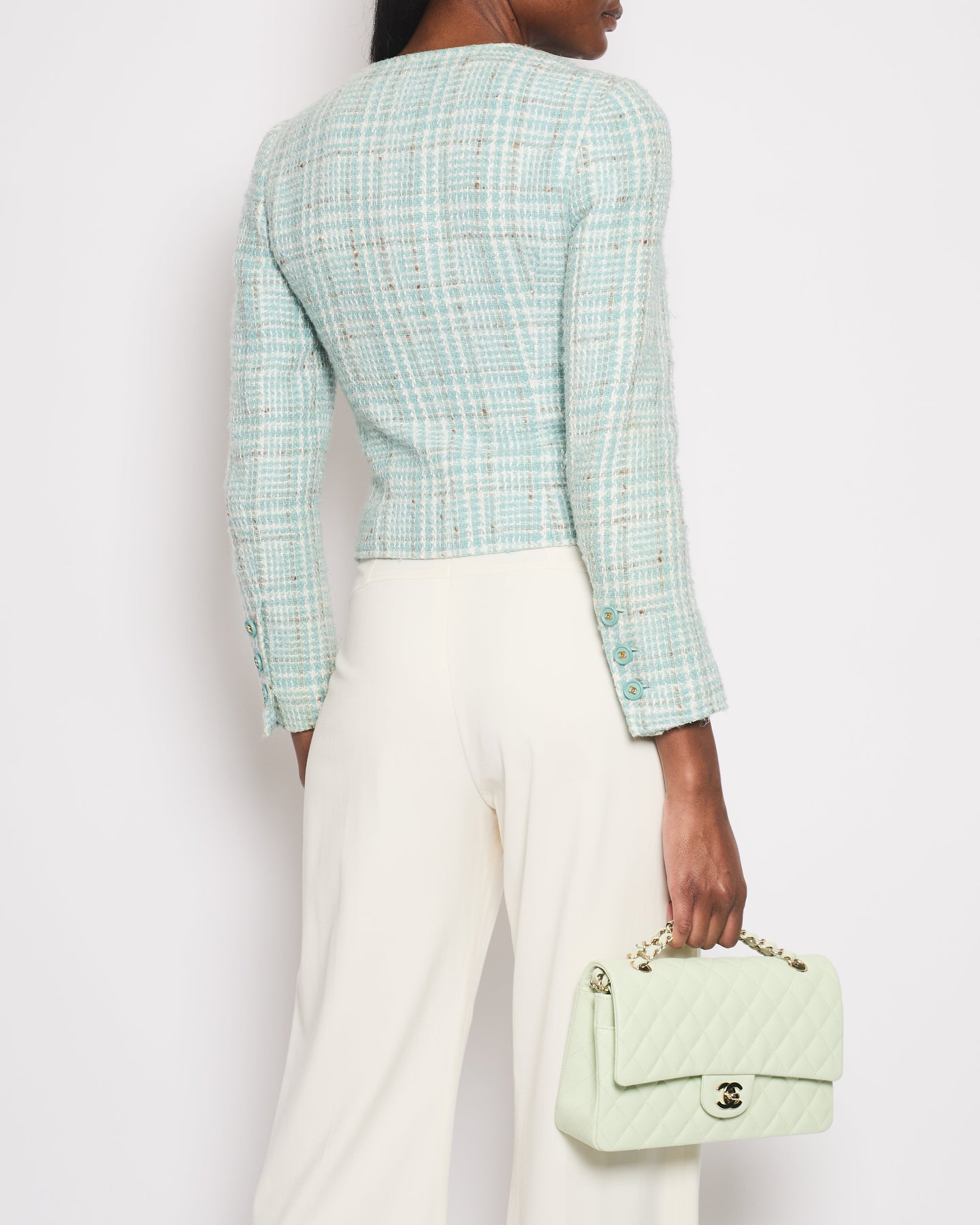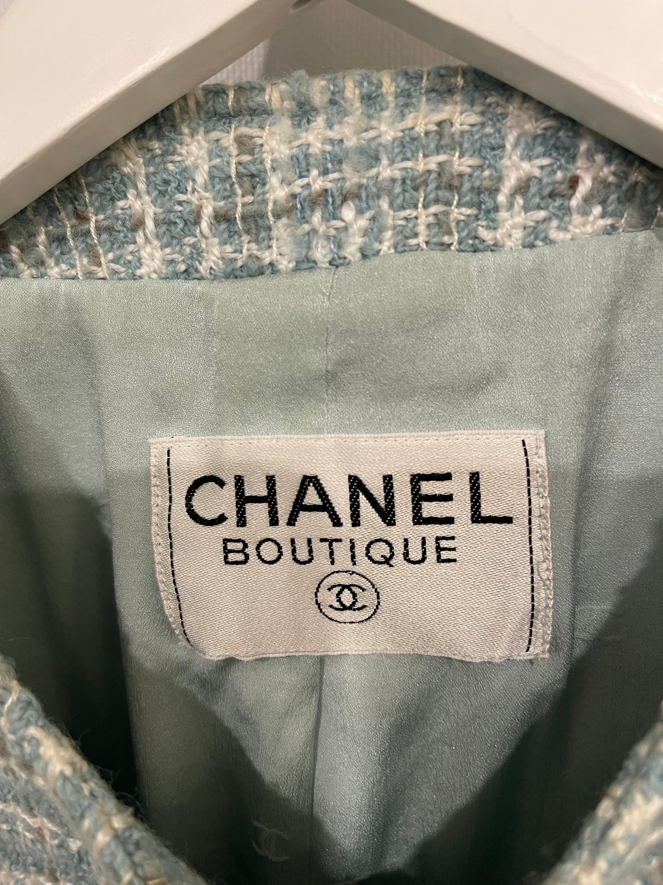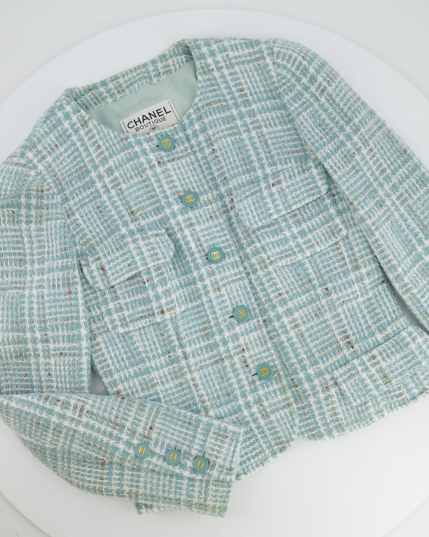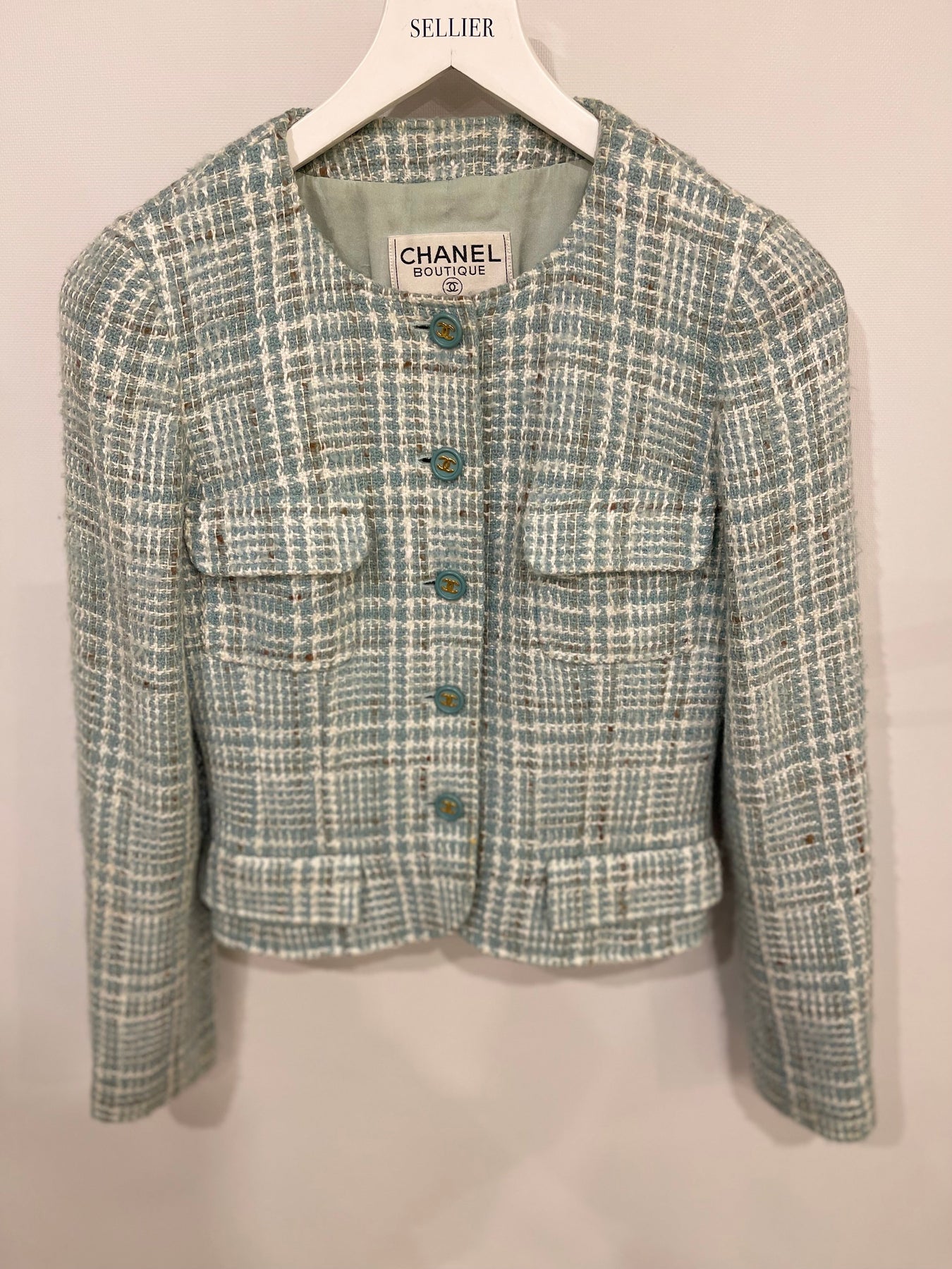 Chanel 1997 Baby Blue, Brown and White Tweed Jacket with CC Button Details Size FR 36 (UK 8)