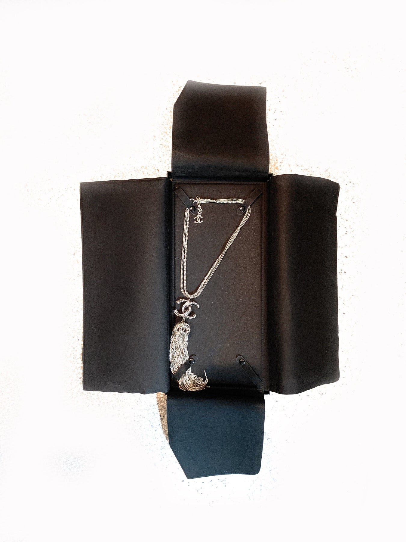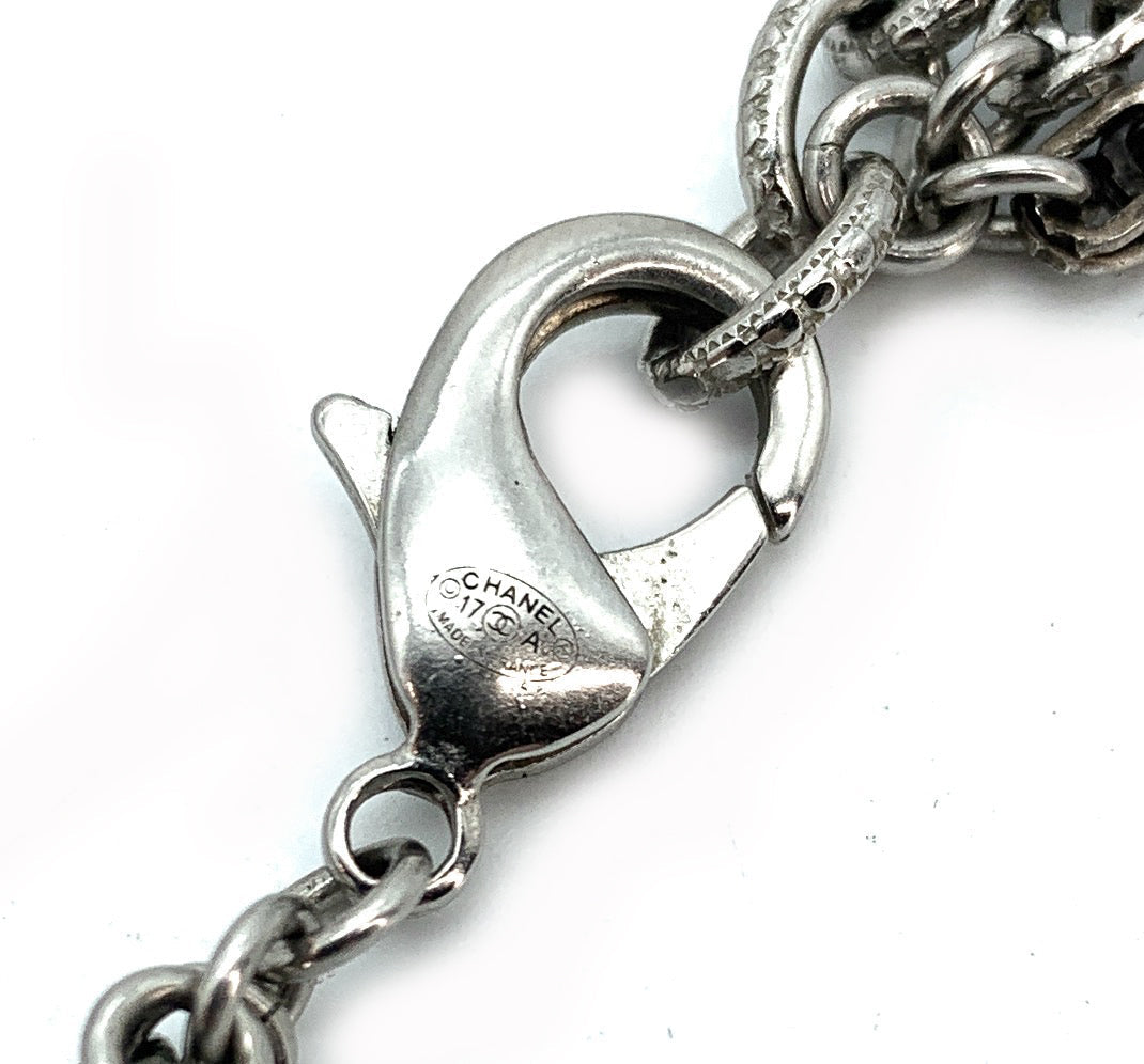 From the Pre-Fall 2017 Métiers d'Art Collection. Silver-tone Chanel bag Paris-Cosmopolite CC logo tassel pendant necklace with Strass embellishments and adjustable lobster clasp closure.