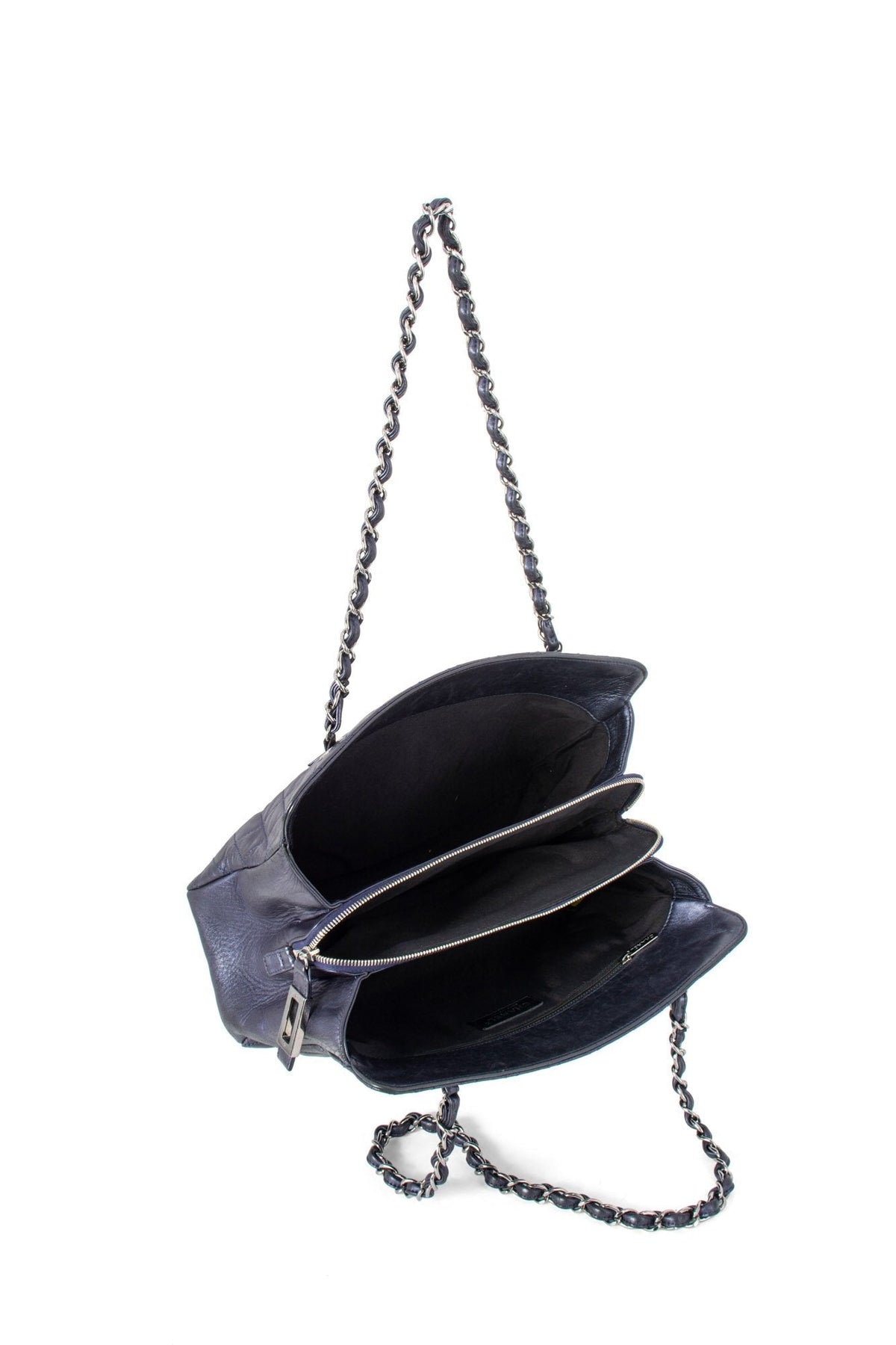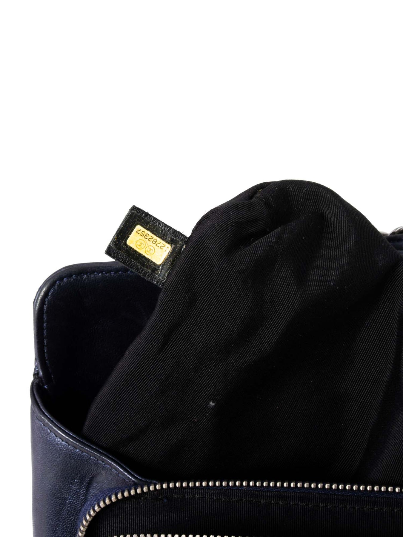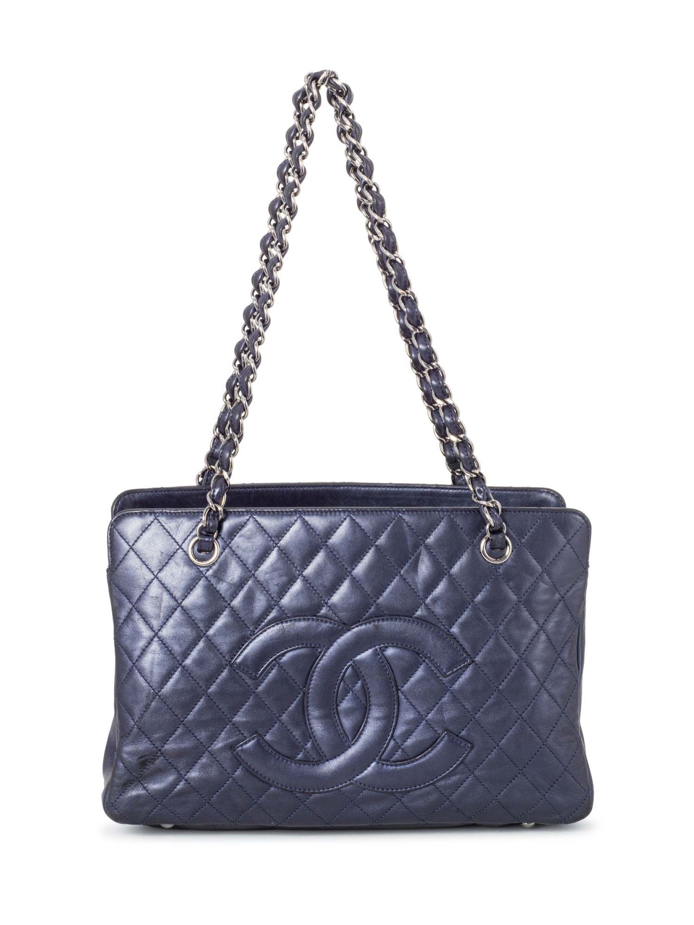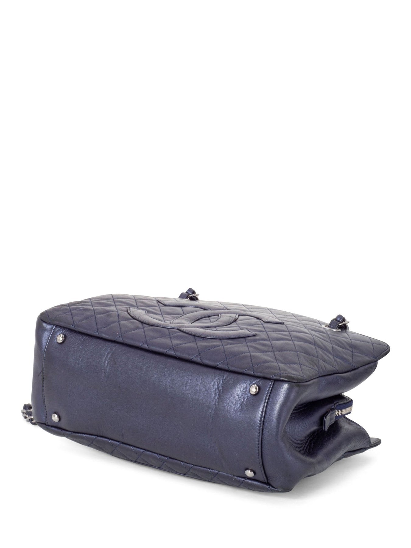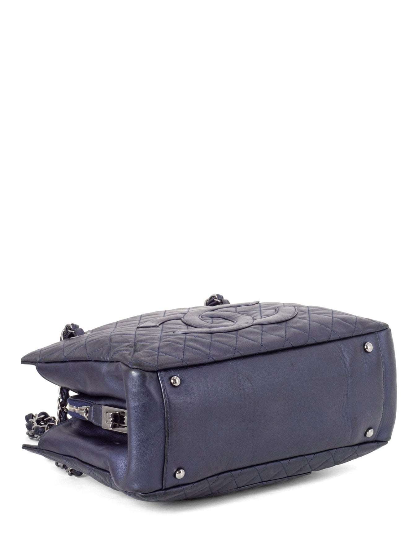 Chanel Shopper Bag or . This bag is in metallic blue quilted leather with silver tone hardware. It features the Chanel Mademoiselle lock on the side, double chain handles and embossed frontal CC logo.  This bag has an exterior back slot pocket with an interior middle zipper compartment with two sides. Highly collectible from Chanel!