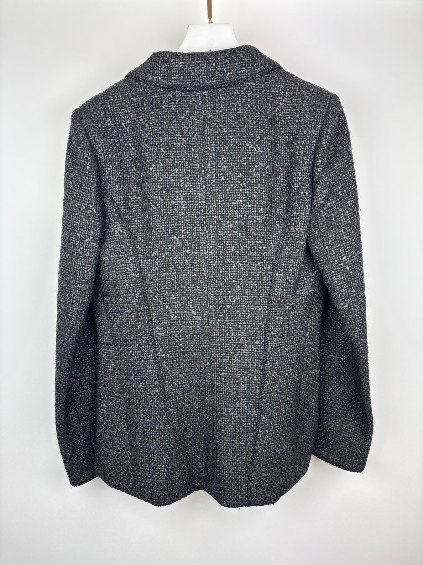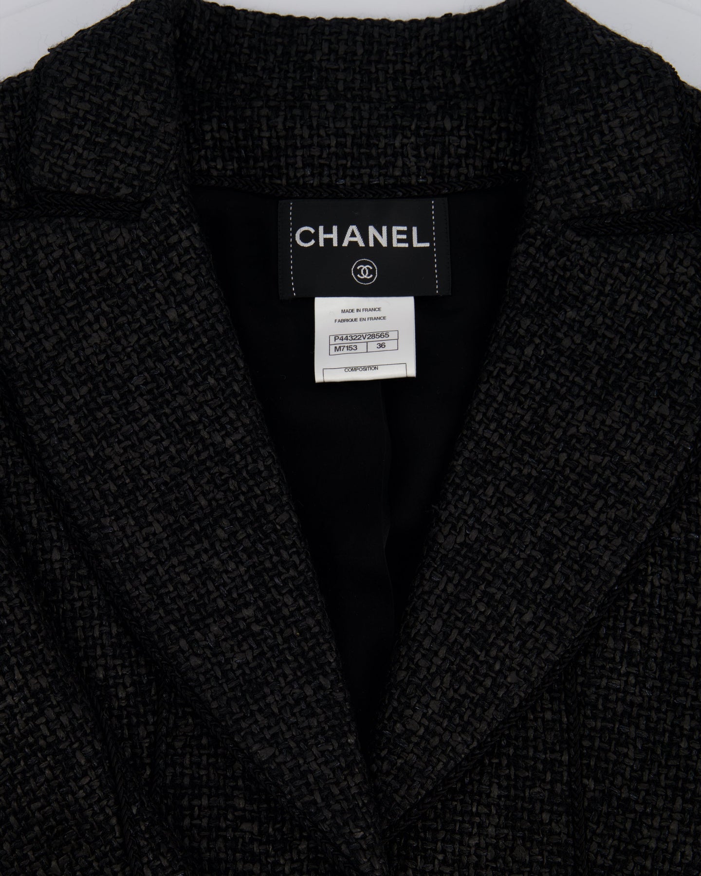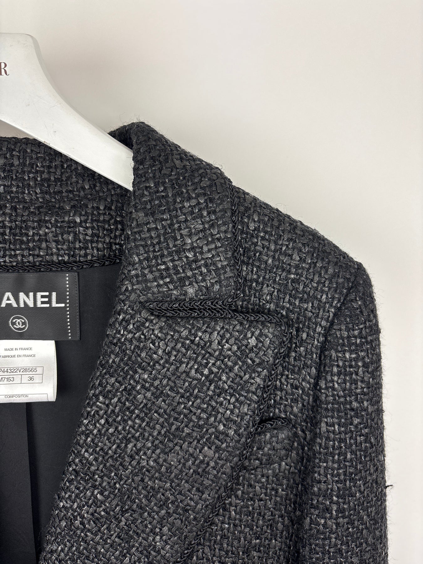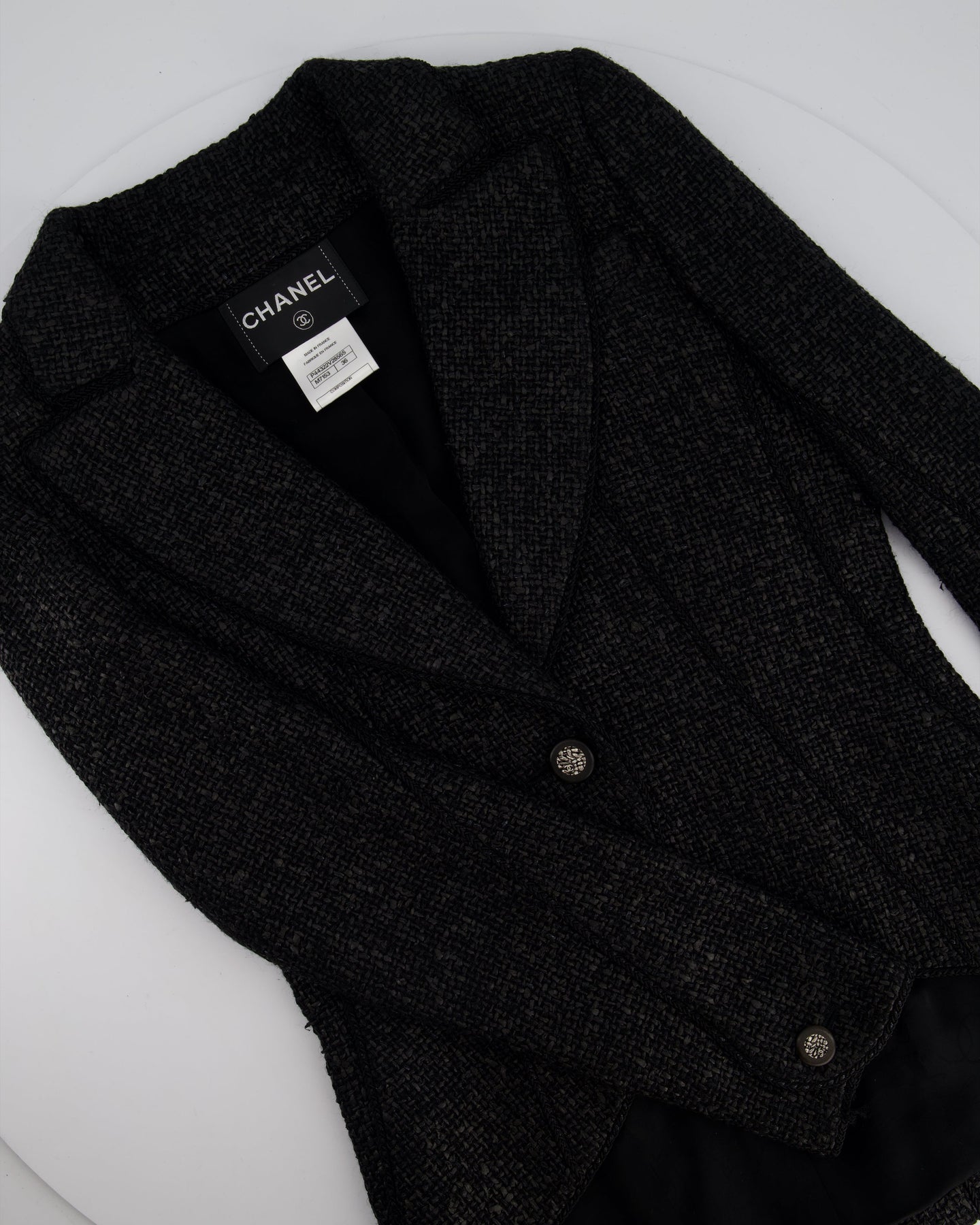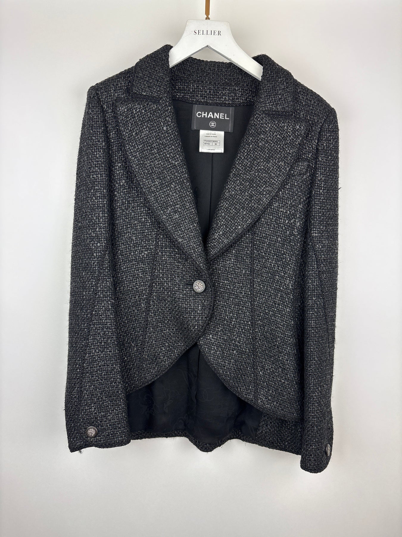 Chanel Black Coated Tweed Curved Hem Jacket with Silver CC Button Detail FR 36 (UK 8)