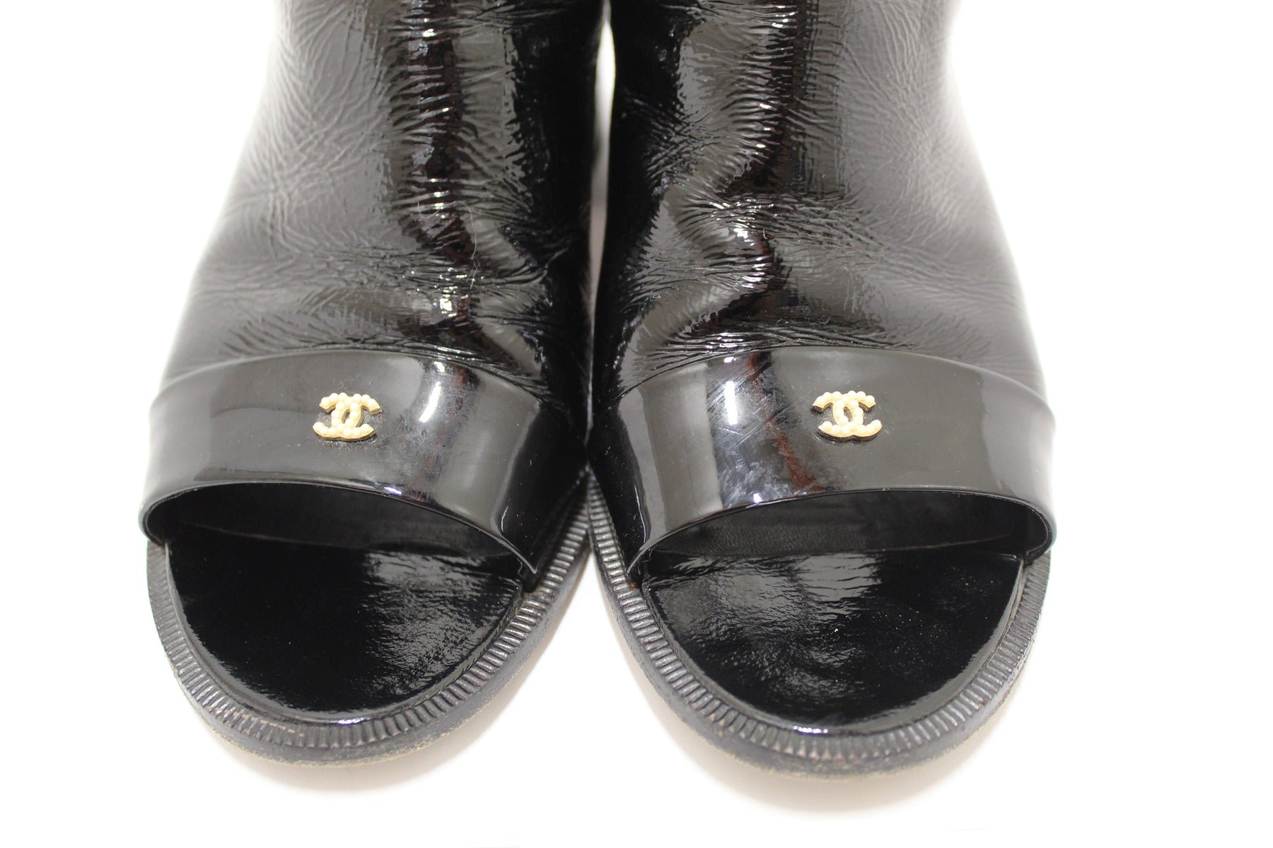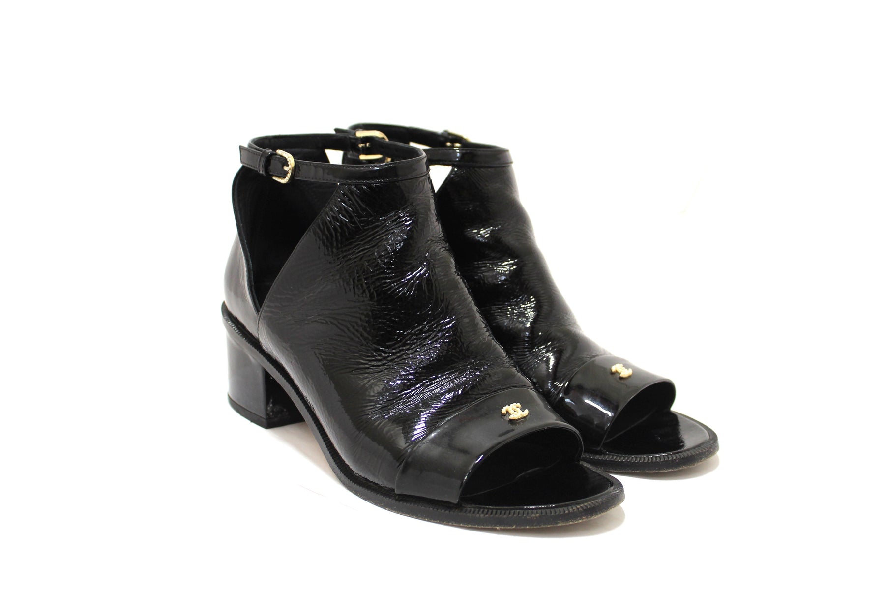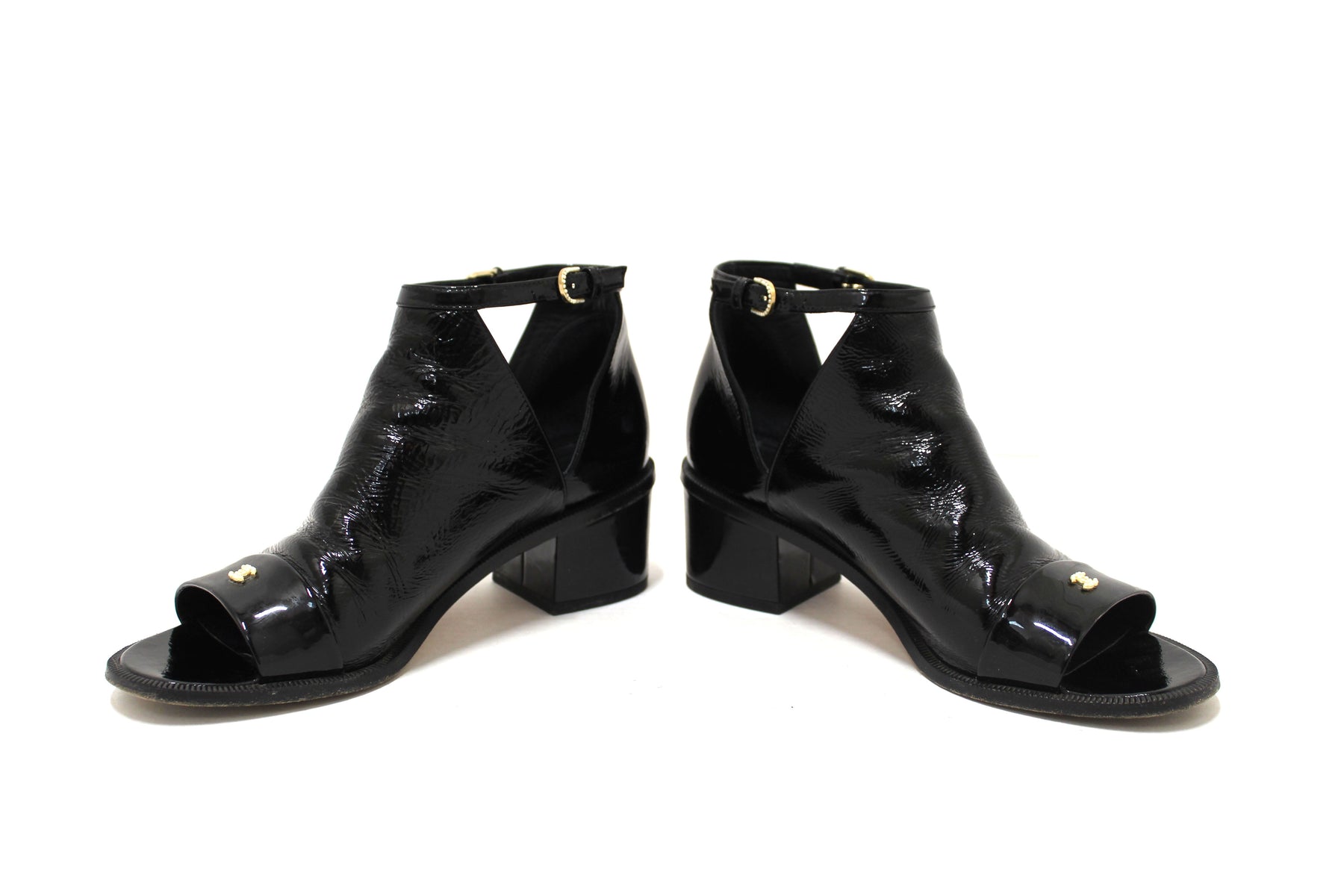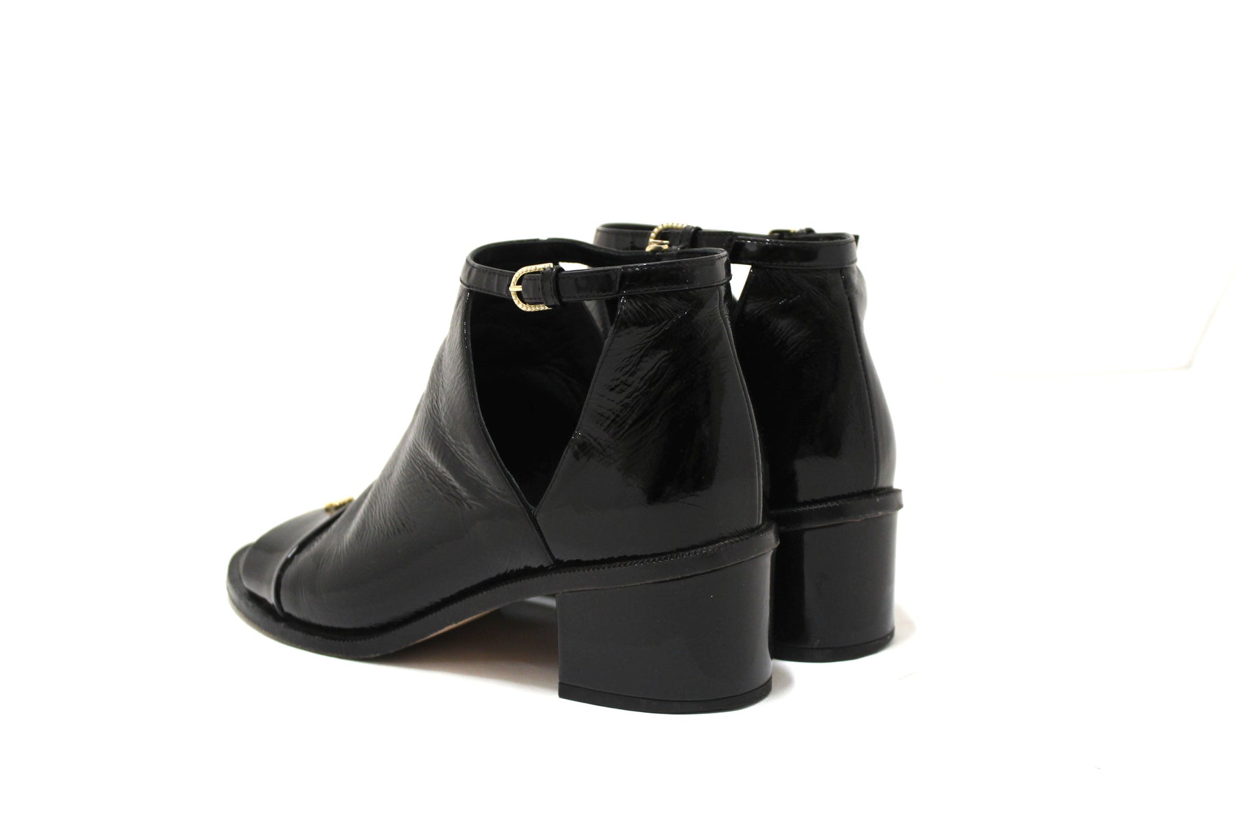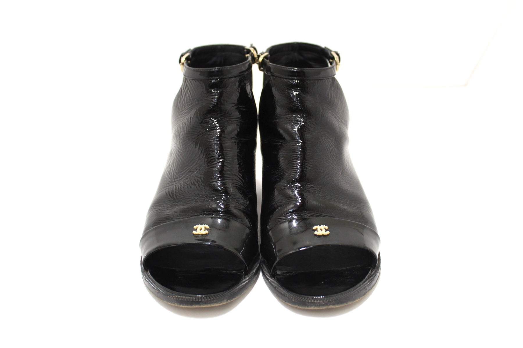 Chanel Black Patent Leather Peep Toe Short Ankle Boots 38.5