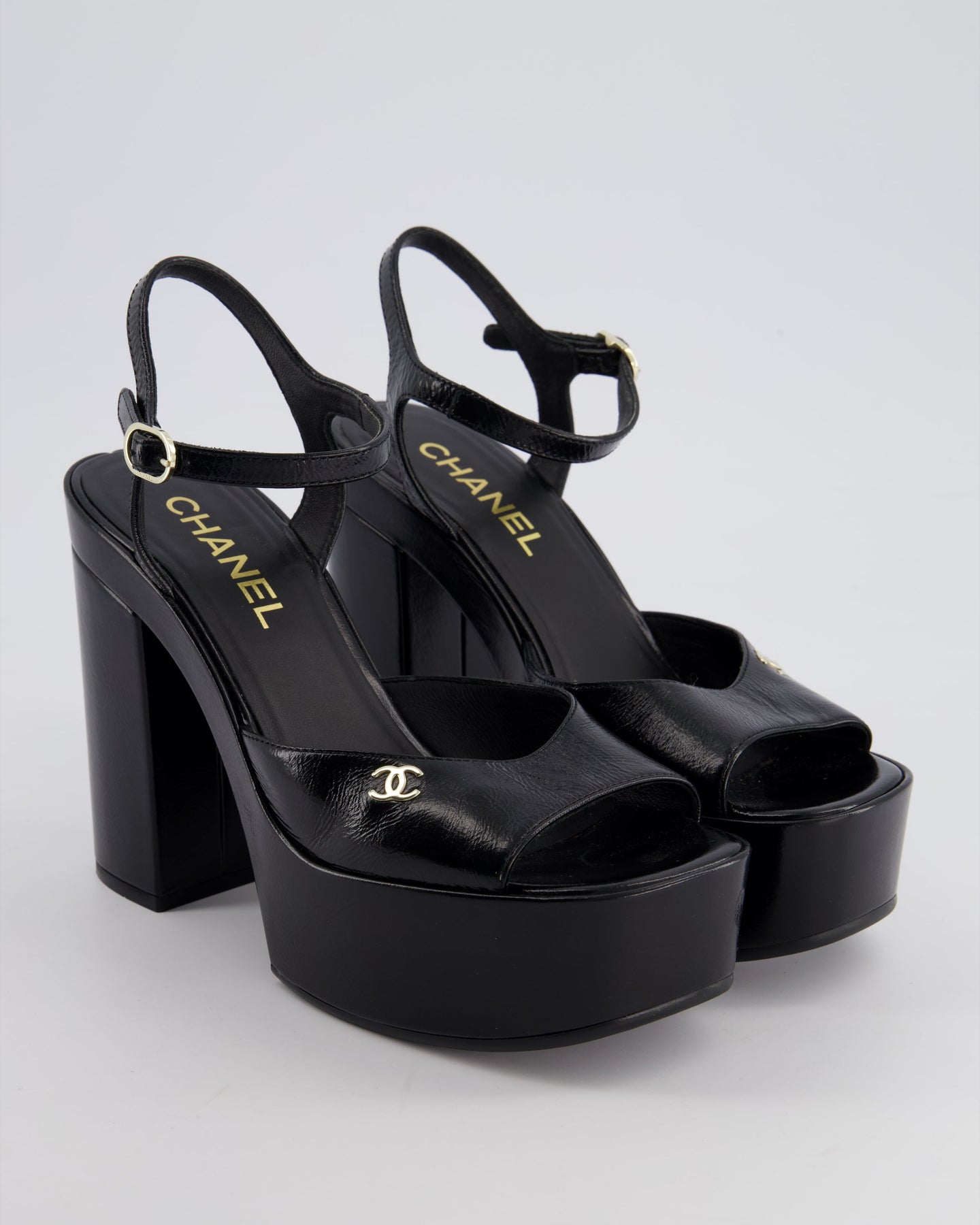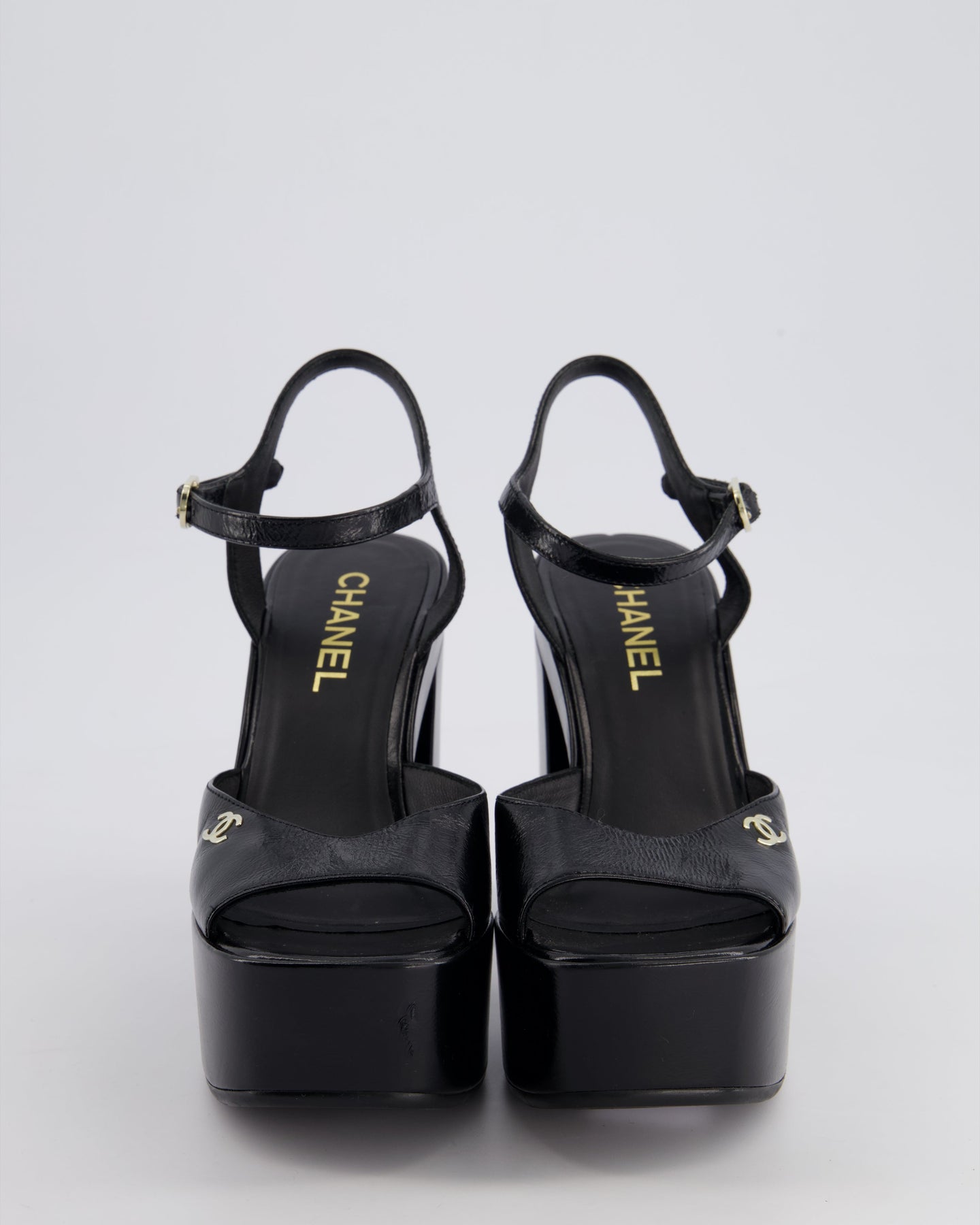 Chanel Black Shiny Calfskin Platform High Sandal with CC Logo EU 38.5C