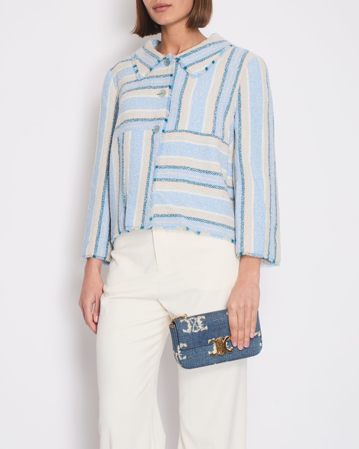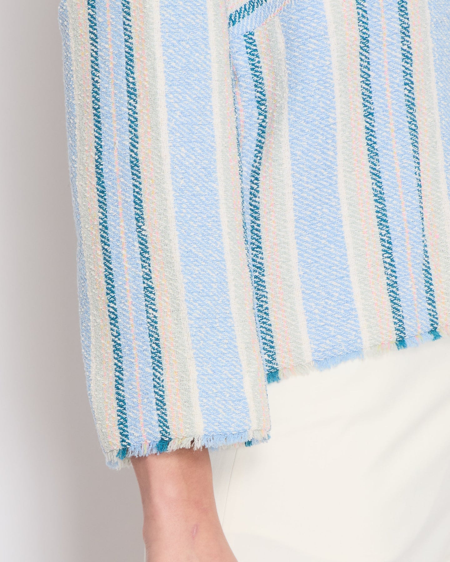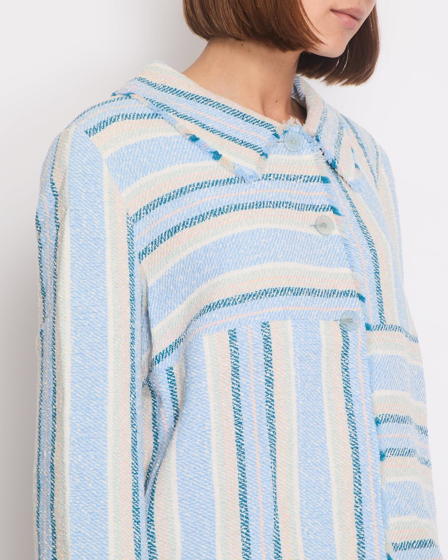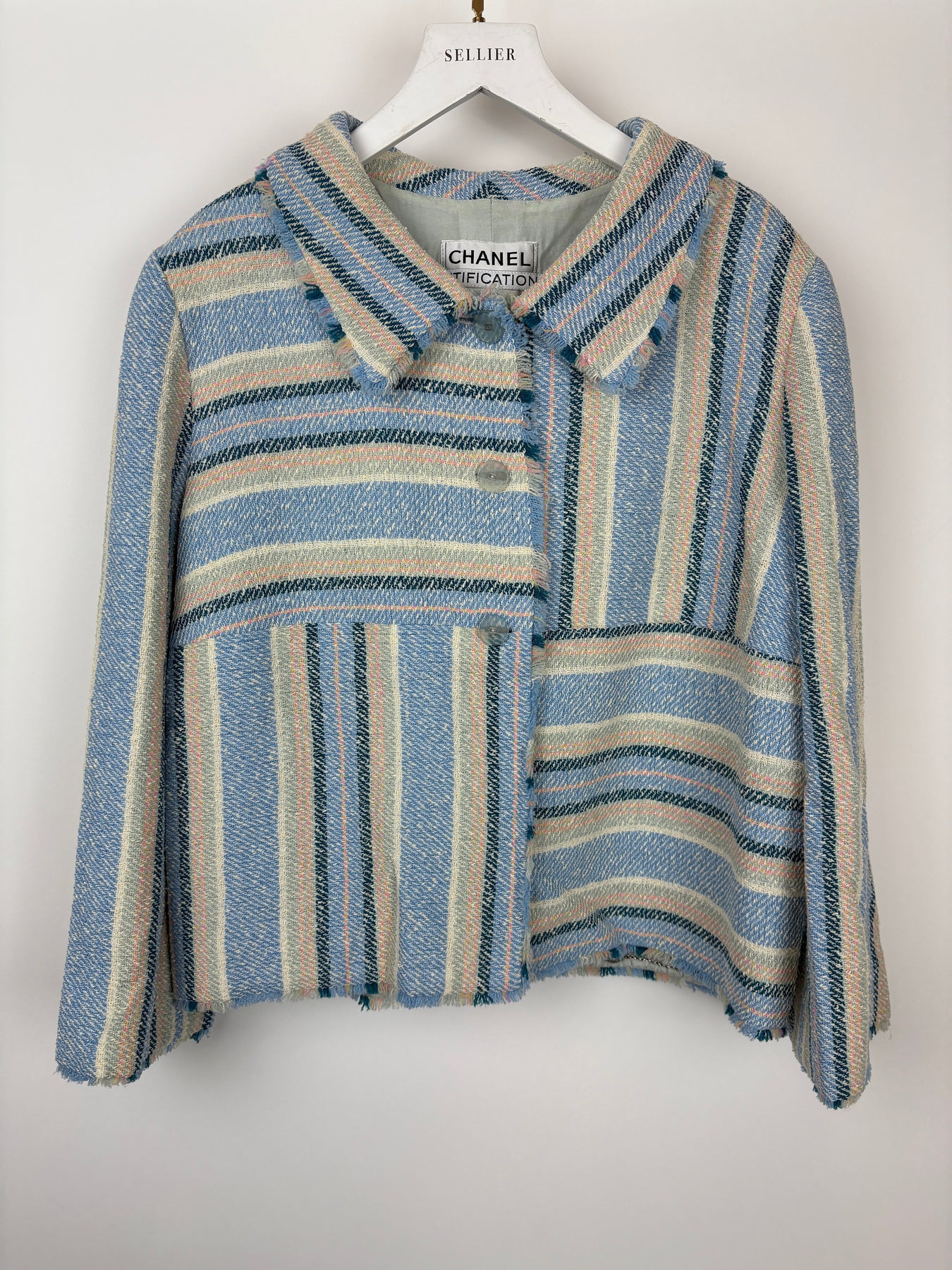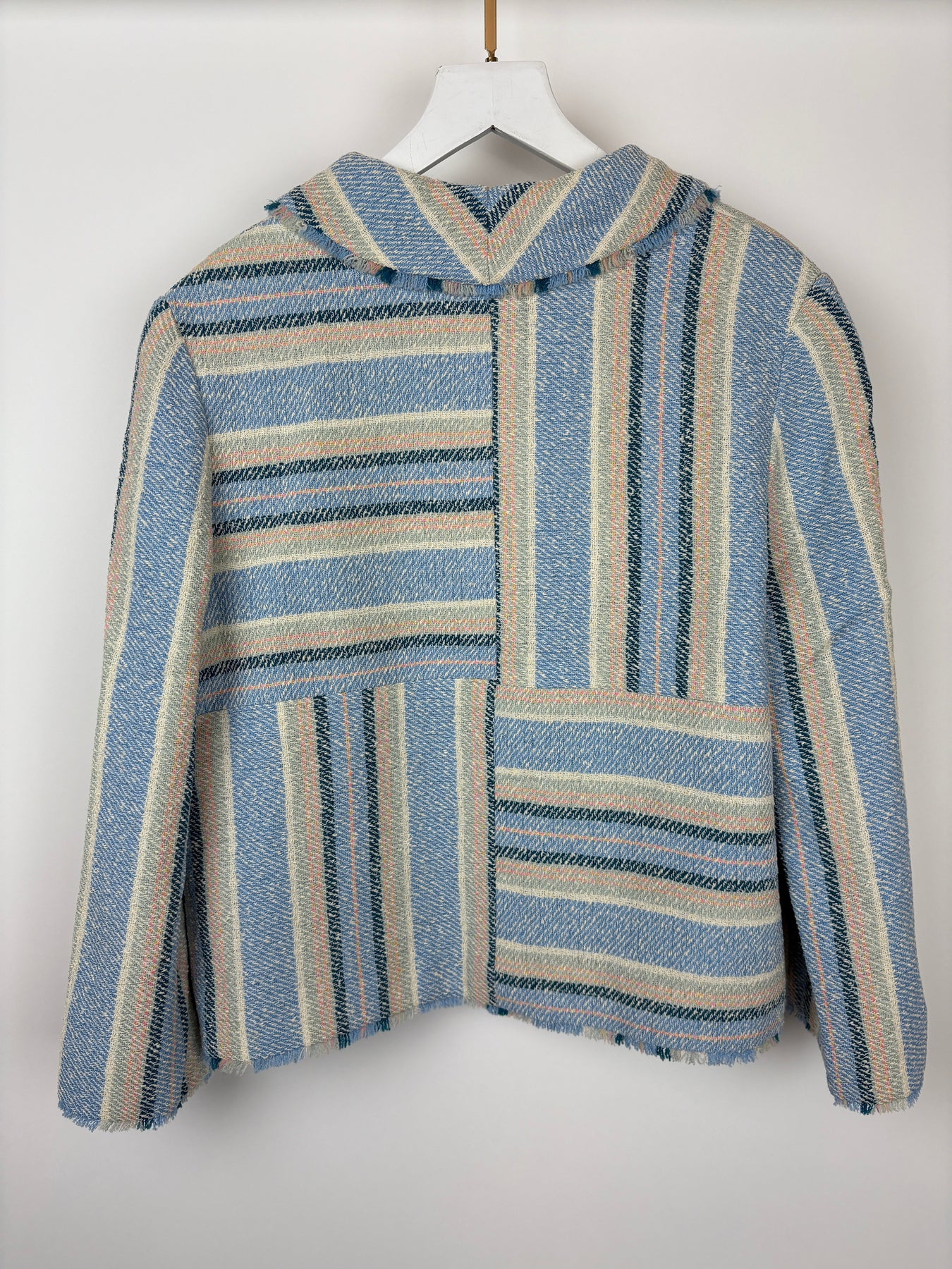Chanel 00/C Blue and Green Striped Tweed Jacket with Transparent Blue CC Logo Button Details Size FR 46 (UK 18)