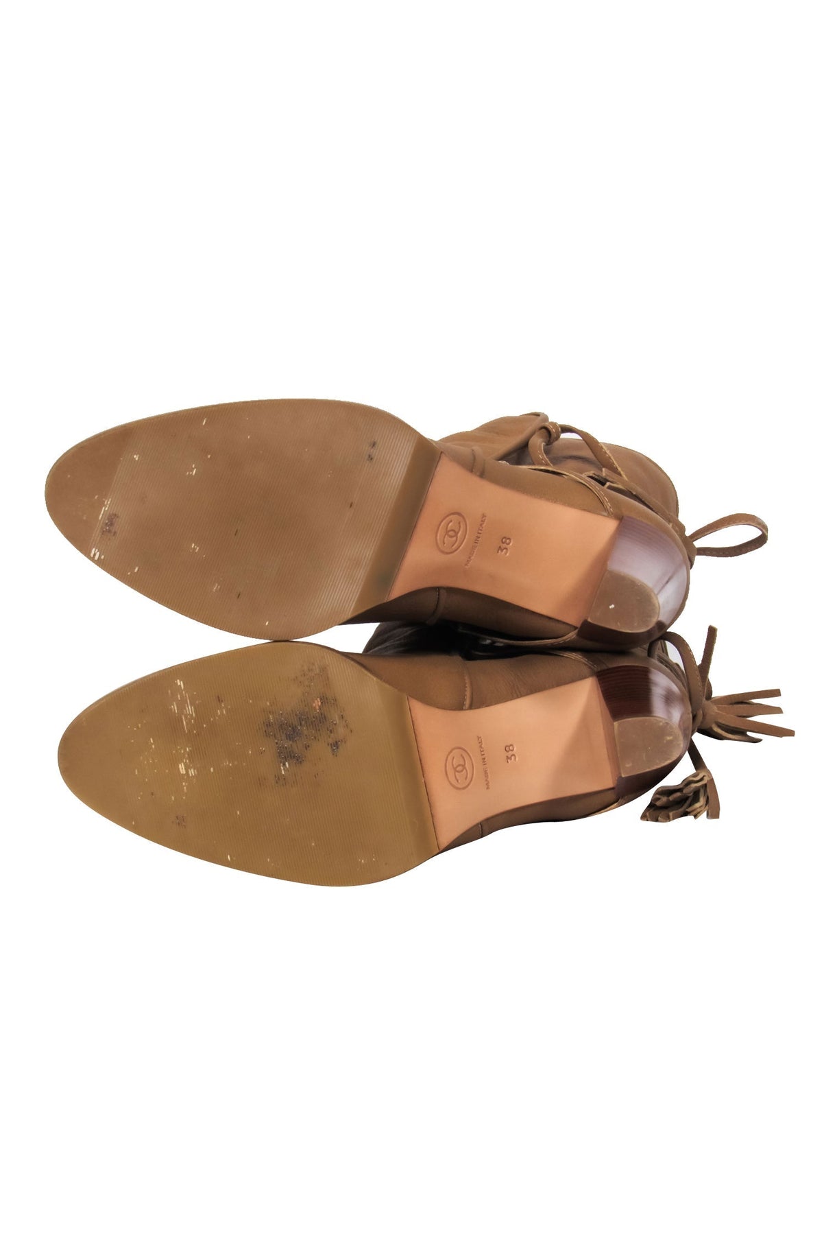 Created in the early 2000's, these Chanel short boots are the prime example of the winter "It Girl" gear!  Made from soft buttery leather, this stylish and luxe boot feature a shearling fuzzy lining that folds down and peaks out the classic Chanel logo!  Pair this with jeans and a matching tan leather jacket for a fall and winter transitional look!