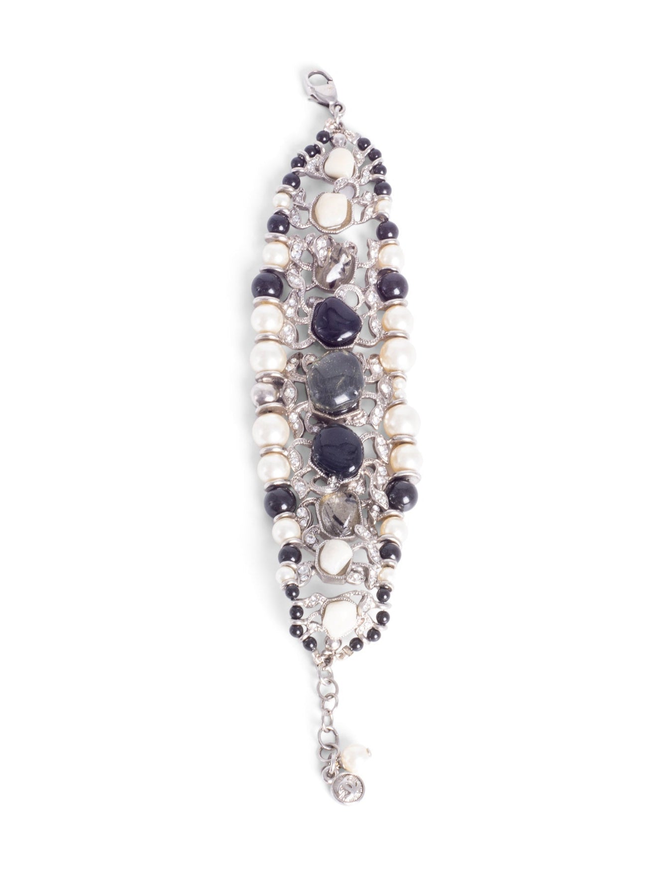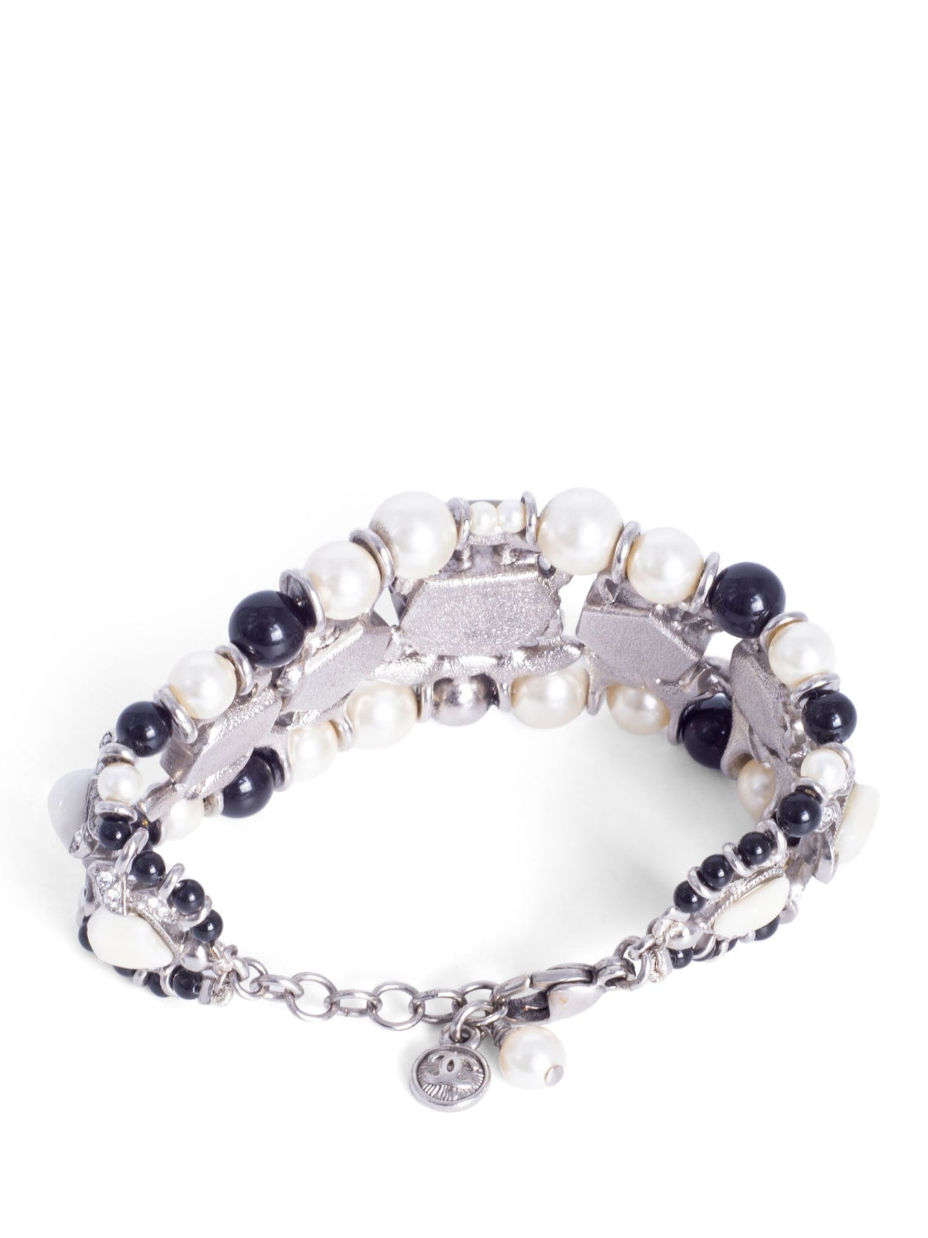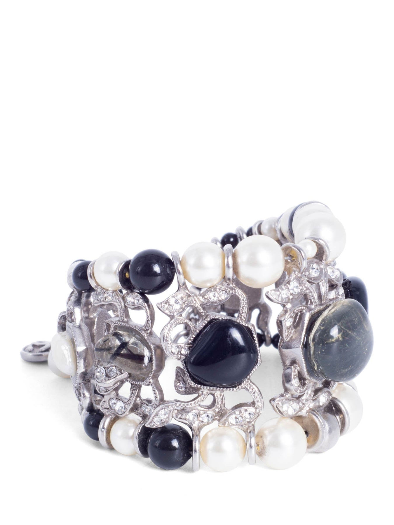 CHANEL Pearl Bracelet or . This bracelet is silver toned with detailed with white and black pearls. The center piece features various cabochon stones and is embedded with crystals. It's held together by a hook closure and also features a CC logo charm.