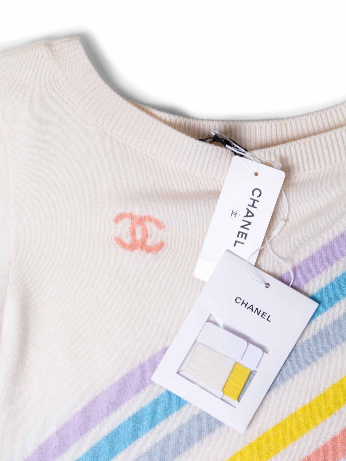 Chanel CC Logo Sweater or . This Chanel Cruise 2019 La Pausa White Rainbow Multicolor Striped Cashmere 19C Pullover Sweater. The most wanted multicolor cashmere sweater from the Chanel Cruise 2019 "La Pausa" collection! Crafted from lightweight cashmere, this stunning sweater has a boat-neckline and diagonal multicolored stripes.