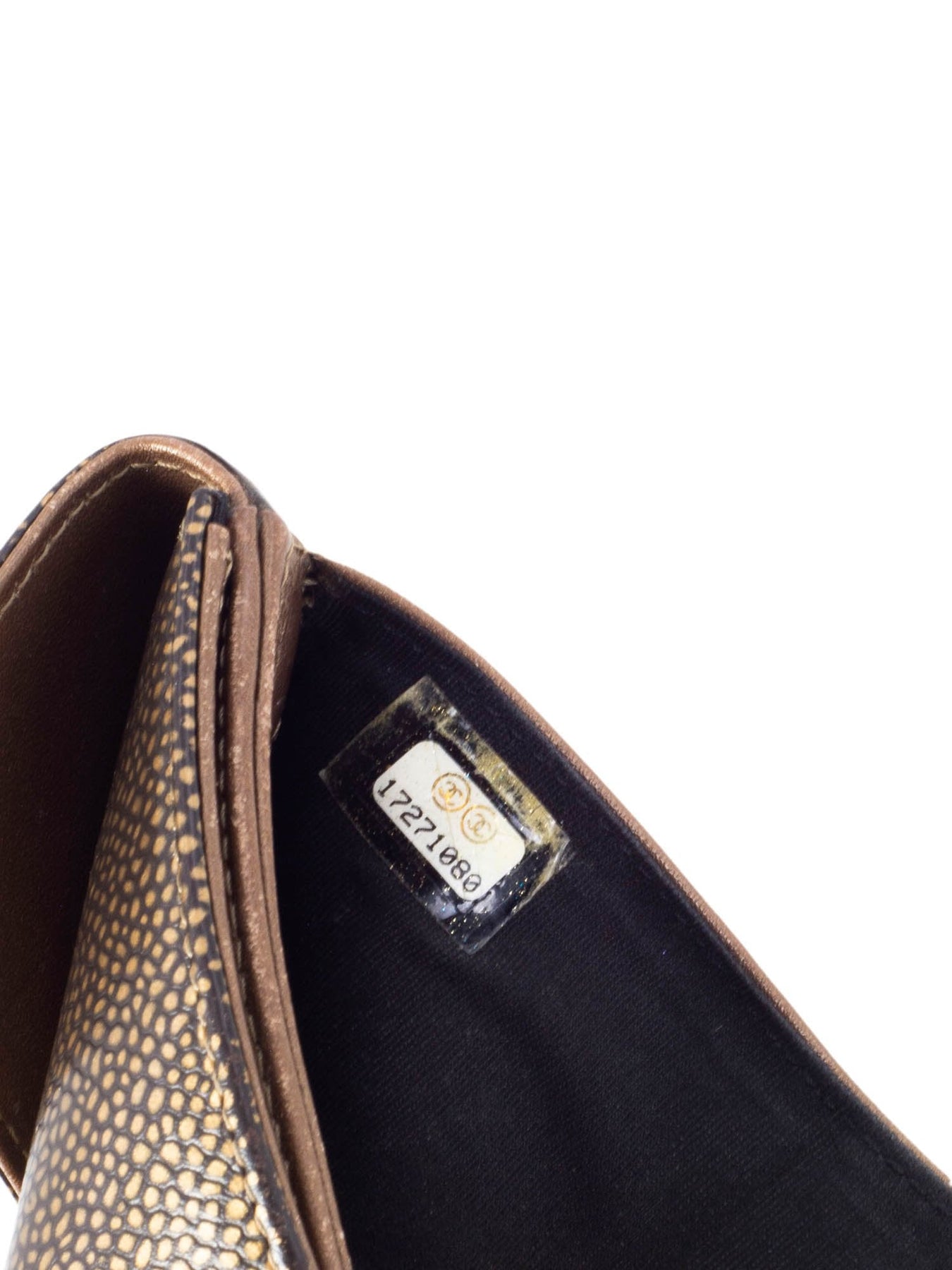CHANEL Timeless Bifold Wallet or . I It is in a brown and black leather combo. It opens to multiple slot pockets for card holders, and one bill holder. The exterior has a snap button that opens up to a coin pouch.