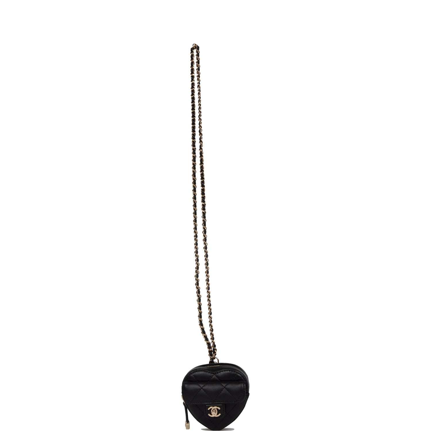 This CC In Love Heart Necklace bag is in black lambskin leather with light gold tone hardware and features a front flap with signature CC turnlock closure, zip top closure and an interwoven light gold tone chain link and black leather strap.