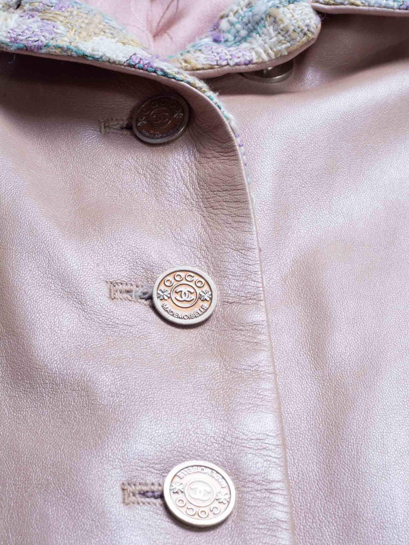 Chanel Jacket or . This elegant yet stylish Chanel jacket is in dusty rose nude leather and multicolor tweed fringe detailing around the collar, frontal pockets, sleeves (when folded), and dusty rose silk lining with two frontal pockets and CC logo buttons.