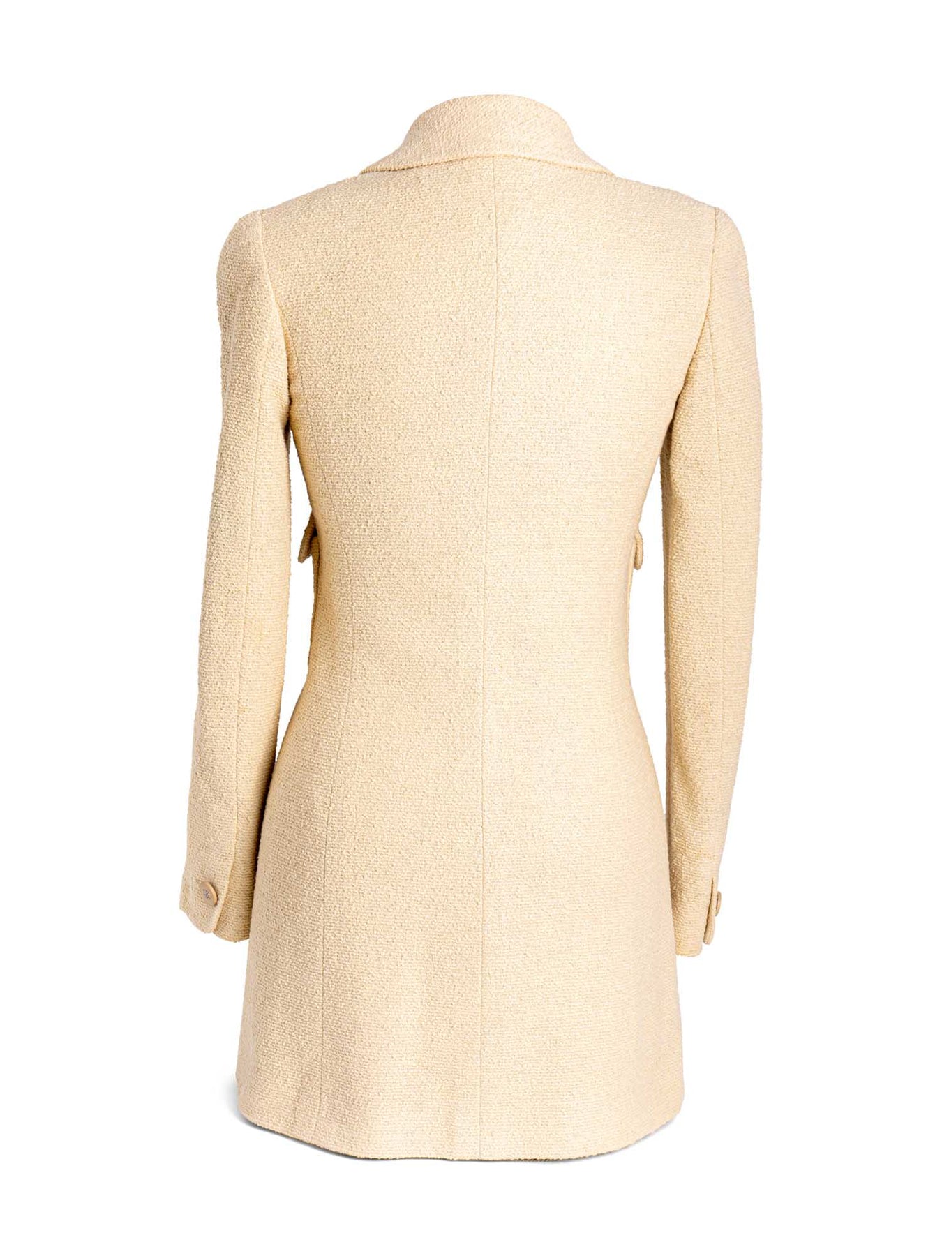 Chanel fitted jacket or . It is in beige cotton tweed fabric with a CC logo lining, two front pockets, and a large CC logo button closure.