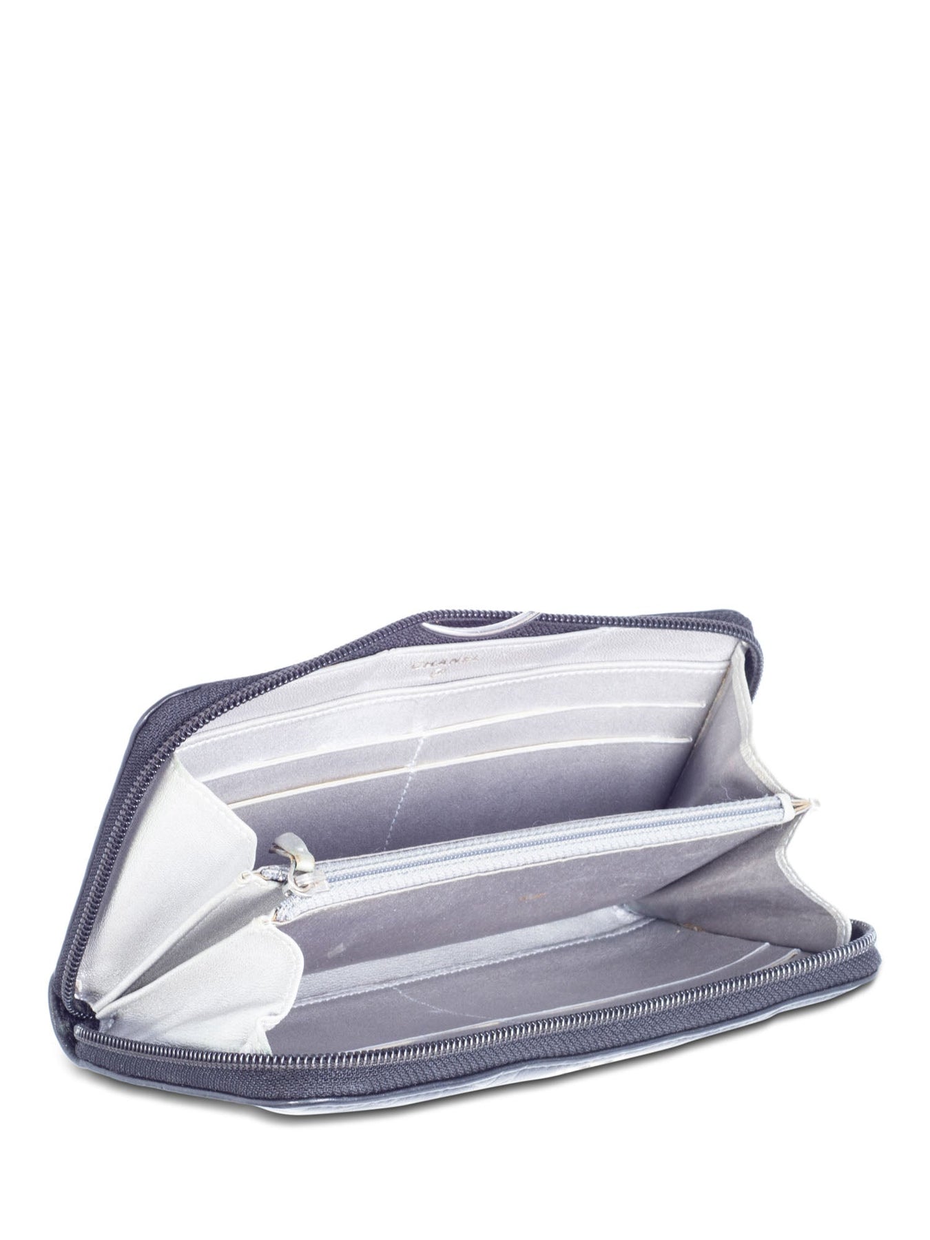 CHANEL Camellia Leather Clutch or . It is in premium black leather with silver tone hardware. It features Camellia flower embossings throughout the leather as well as the signature CC logo accent. The top zipper closure opens up a beautiful interior with silver leather lining. It features 3 main compartments with several pockets and credit card slots.